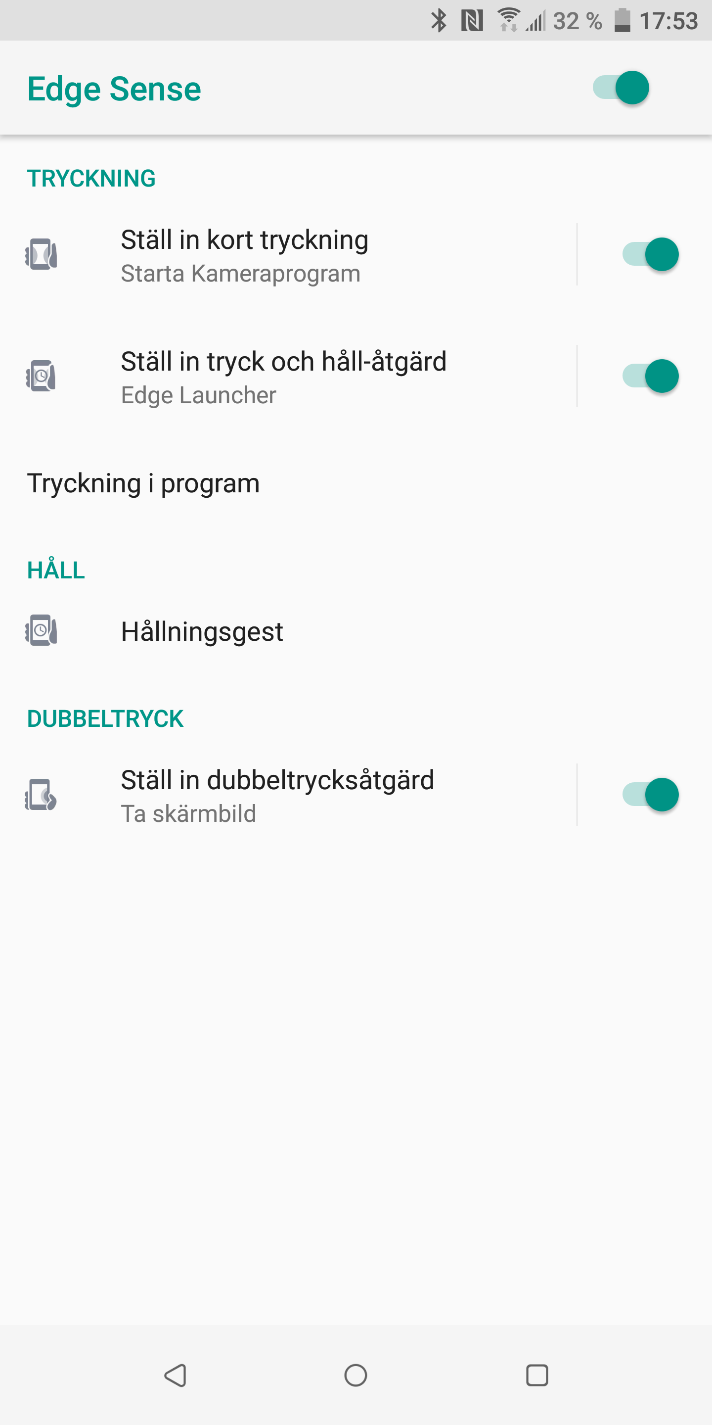 HTC har en rad unika funktioner i Android. Den mest unika är givetvis möjligheten att krama eller knacka på telefonens sidor för att aktivera unika funktioner. Edge Launcher låter till exempel användare krama telefonen för att visa en cirkel av favoritappar som blir lätt tillgängliga med tummen. Nytt för i år är att kunna dubbelklicka på sidan av telefonen för att aktivera ytterligare ett läge i mobilen. Precis som i HTC U11 går Edge Sense att ställa in för att göras känsligare eller mer krävande. På det sättet är det lätt justera det för att vara lite enklare att trycka in men också för att undvika misstryckningar. I kombination med tryckkänsliga knapparna på höger sida av telefonen har dock Edge Sense blivit en lite mer frustrerande användarupplevelse. HTC säger att de ska förbättra tekniken med mjukvara men vi väntade med vår recension hela vägen fram till lansering utan att se någon förbättring.