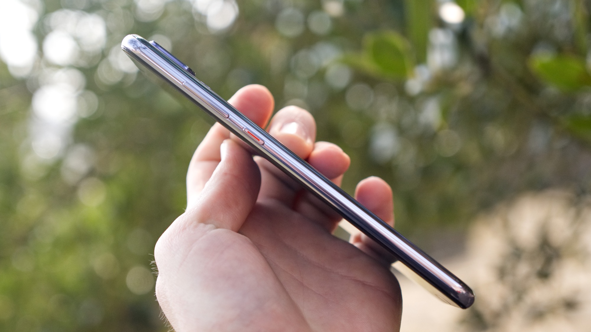 Glaset på baksidan möts av en metallram. Ramen sträcker sig runt hela telefonen. På höger sida finns en på/av-knapp och två volymknappar. Knapparna har bra fysisk återkoppling och är praktiskt placerade. På vänster sida finns en korthållare som har plats för dubbla nanoSIM-kort men ingen plats för något microSD-kort. Huawei erbjuder helt enkelt ingen expanderbar lagring.