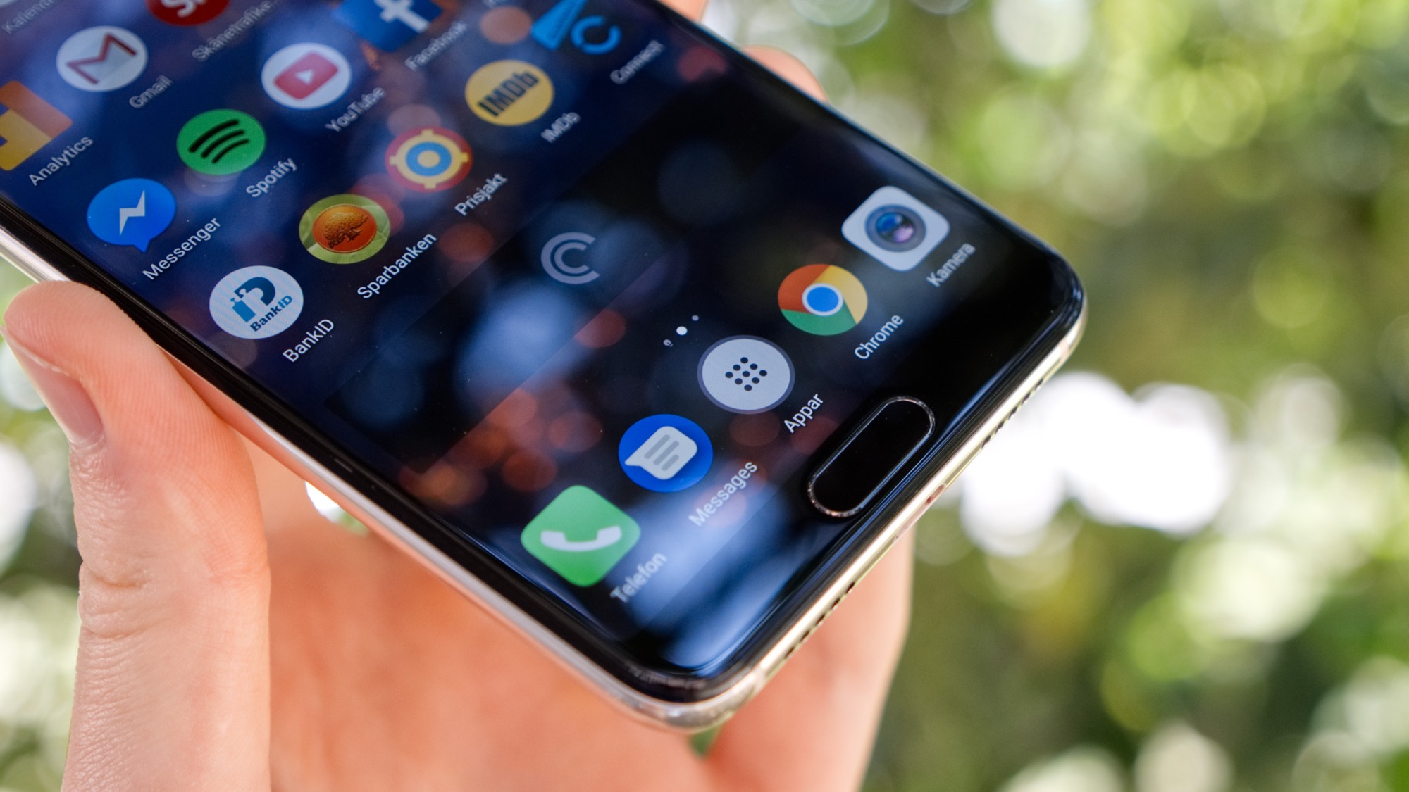 Likt baksidan täcks också framsidan av glas. Medan förra årets P10 saknade ett oleofobiskt skyddslager på sitt främre skyddsglas har P20 det. Det gör att glaset är lättare att rengöra när det blir nedsmutsat med fett. Under skärmen finns en fingeratrycksläsare som är både snabb och pålitlig. Den fungerar dessutom som ett extra tryckkänsligt område för navigering. Mer om det i mjukvarudelen av detta testet.