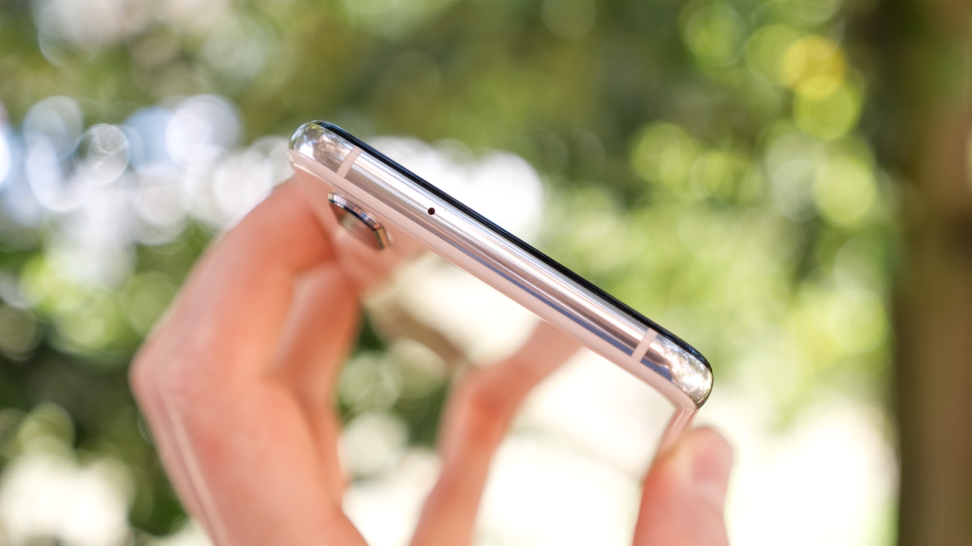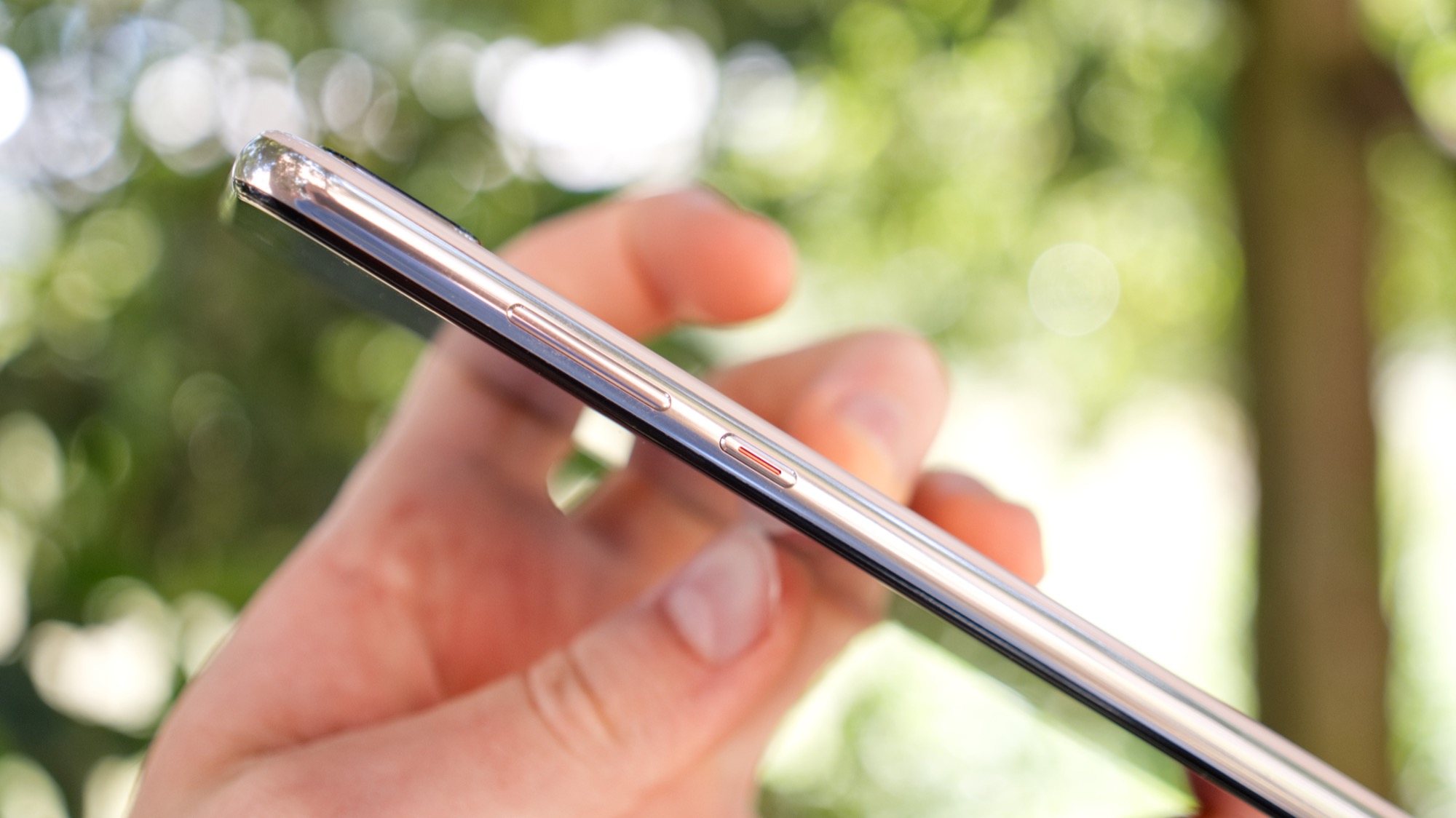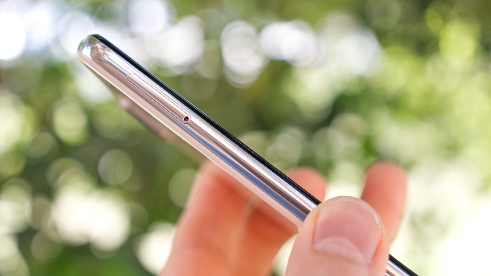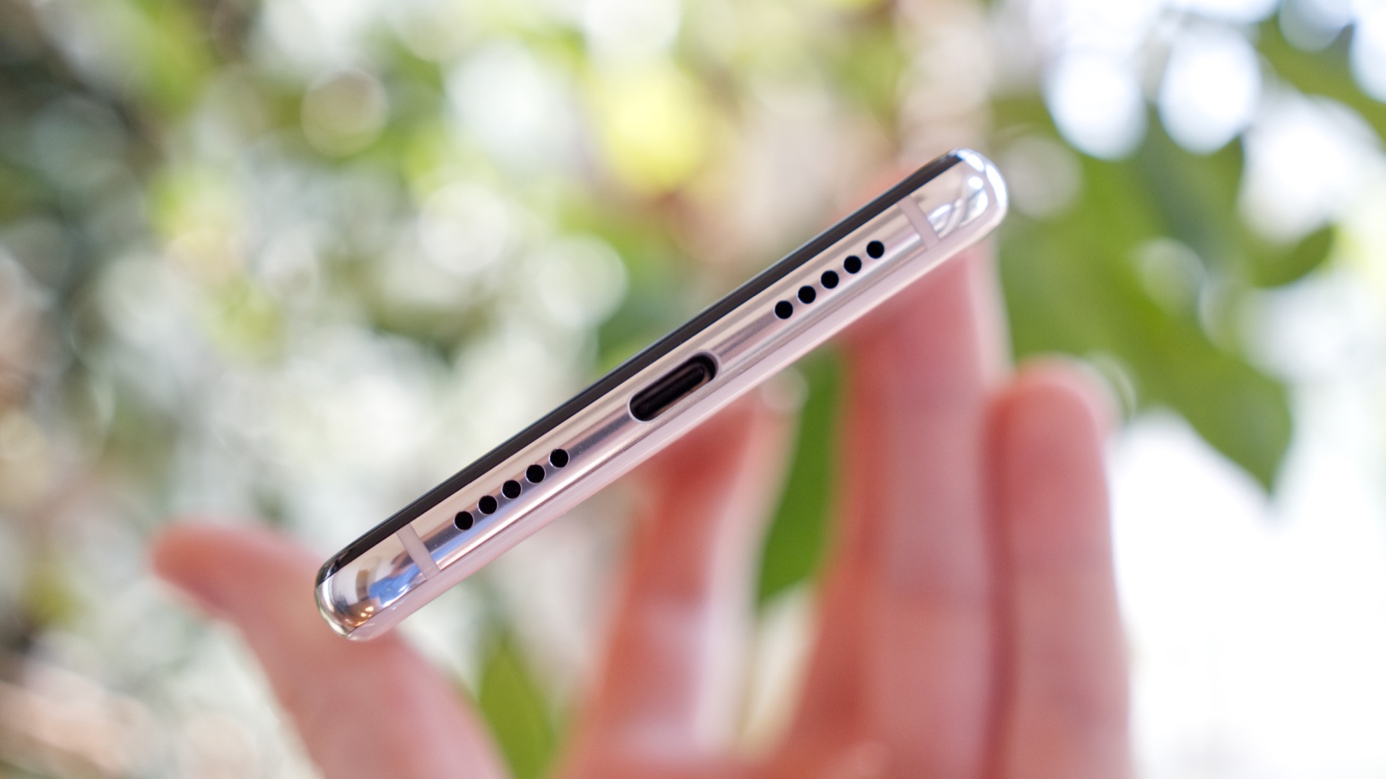 Glaset på baksidan möter metall längs sidorna. Metallramen ger telefonen en stadig konstruktion. På metallramens högra sida finns tre knappar: en på/av-knapp och två volymknappar. De ger bra fysisk återkoppling och är enkla att särskilja, även om vi gärna hade sett lite större separation mellan dem. På ovansidan finns en sekundär mikrofon och på vänster sida finns en kortläsare med plats för två nanoSIM-kort. Här finns alltså ingen plats för microSD-kort. På undersidan finns slutligen en USB Typ-C-port, högtalare och mikrofon. Likt P20 Pro saknar P20 en klassisk hörlursport. Till skillnad från P20 Pro har dock USB-porten på P20 inte stöd för USB 3 eller DisplayPort. Den kan alltså inte användas tillsammans med till exempel en extern bildskärm. Eftersom P20 också saknar en analog hörlursport krävs också en inkluderad adapter för att använda trådbundna hörlurar.