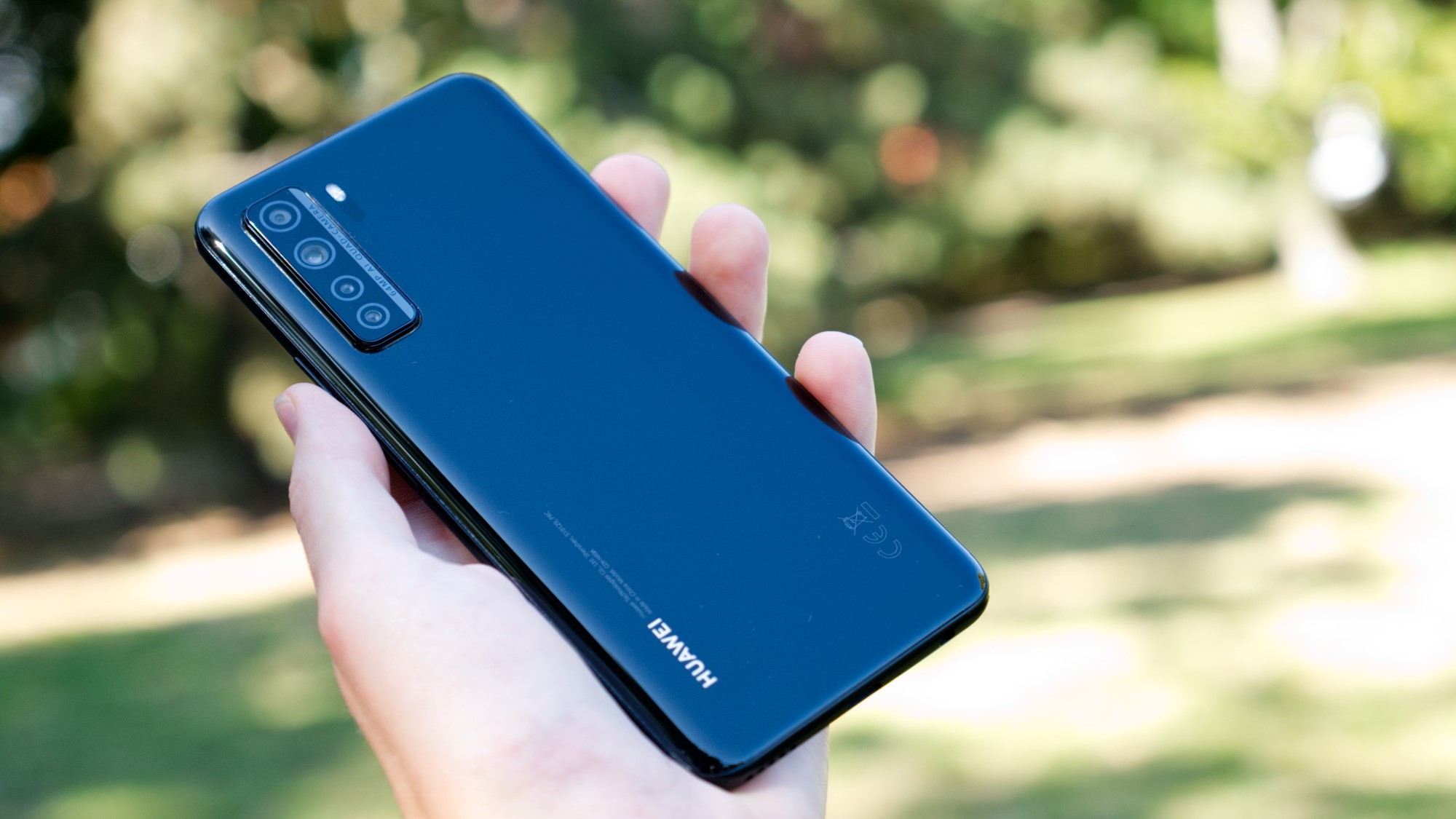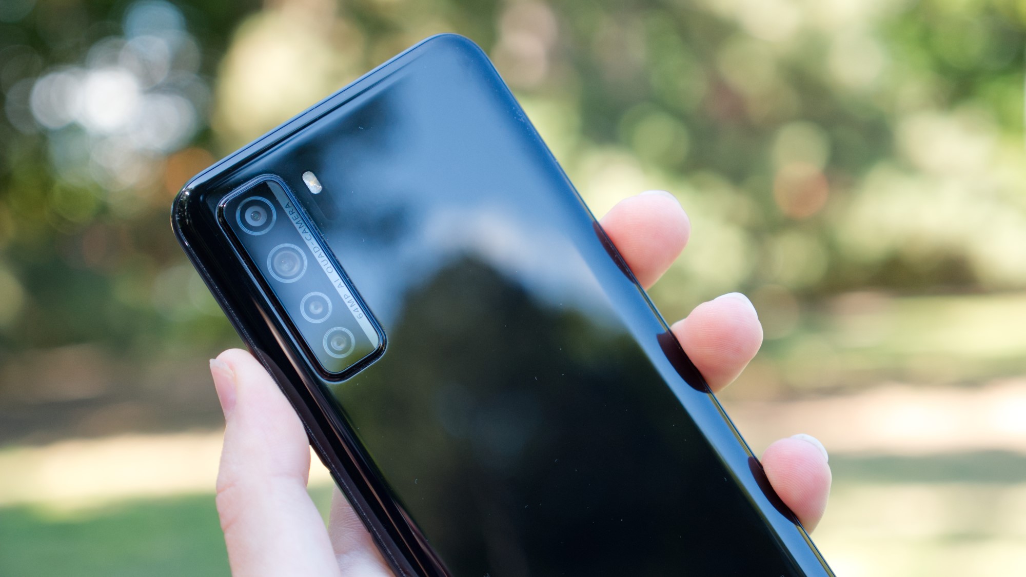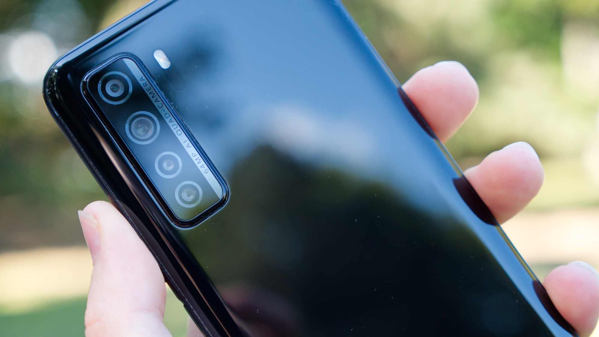Baksidan är gjord av glas och har lätt rundade sidor. Tillsammans med telefonen ingår för övrigt inget plastskydd för att skydda baksidan. Det behöver köpas separat. På baksidan finns i alla fall en utstickande kameramodul som har ett ganska avlångt format i jämförelse med de dyrare modellerna i P40-serien. Modulen sticker ut runt två millimeter, betydligt mer än många andra mellanklassmobiler, som oftast har relativt små kamerasensorer.