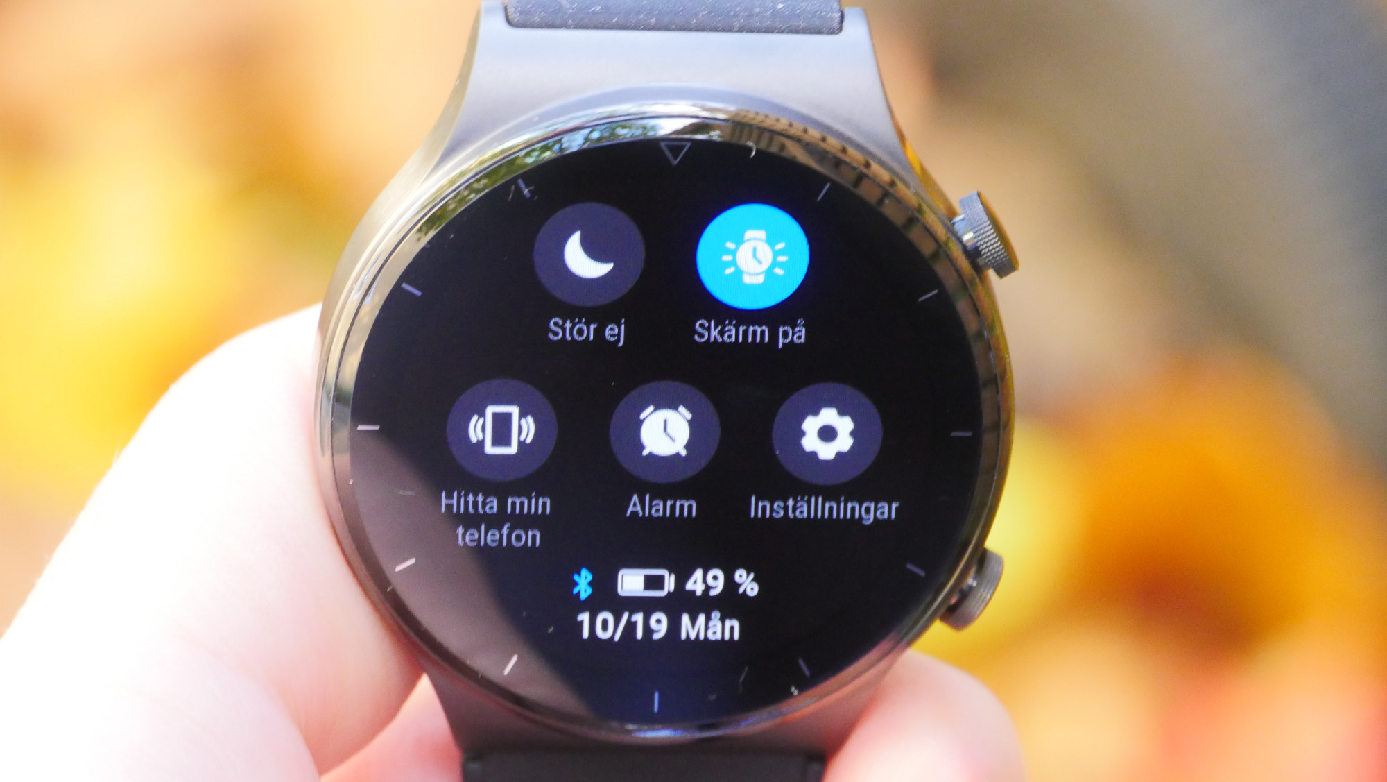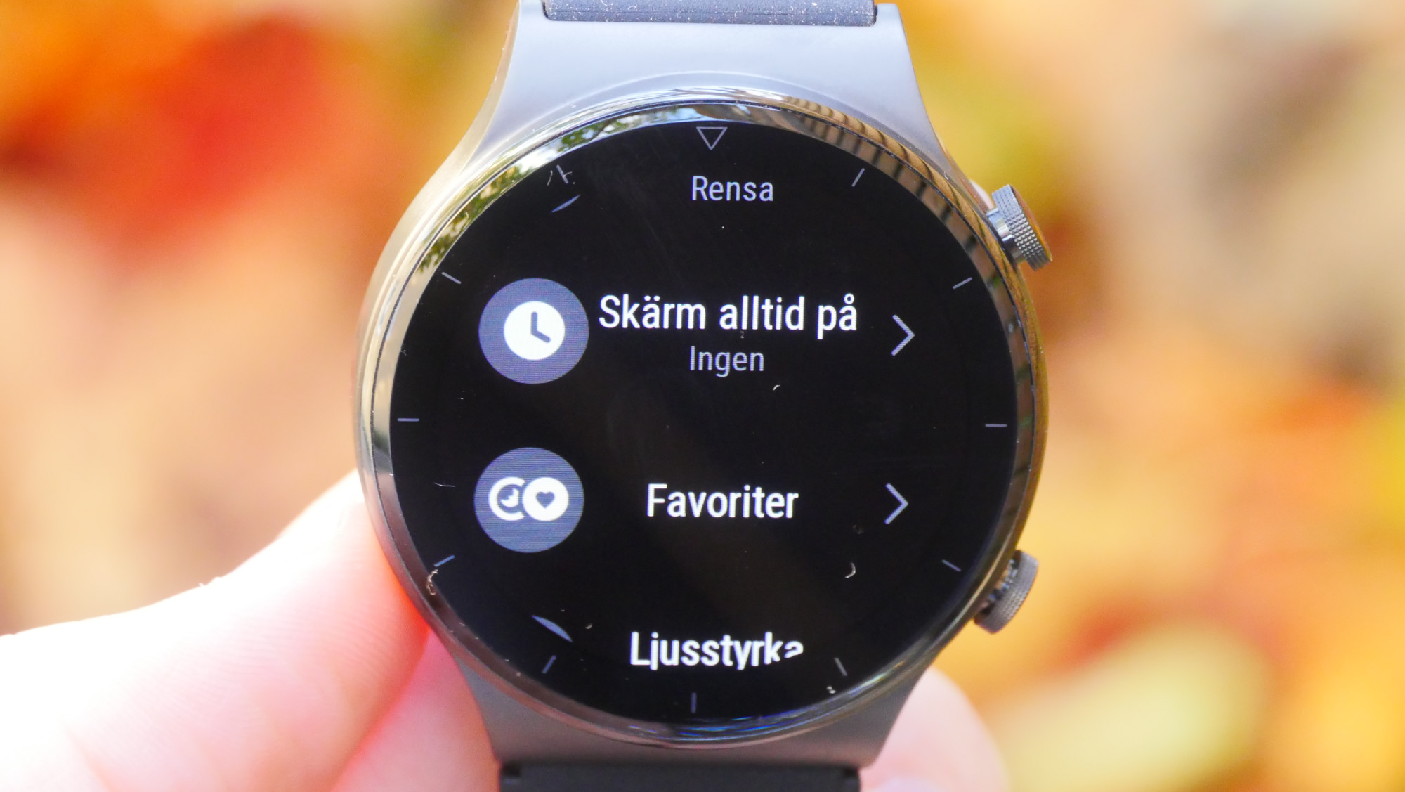 Huawei har två typer av lägen som låter skärmen förbli tänd. ”Skärm på” hindrar klockan från att släckas och låter den vara fullt användbar i antingen fem, tio, femton eller tjugo minuter per tillfälle. Klockans Alltid på-läge förvånar i hur klumpigt det är. Här får vi välja mellan sex urtavlor som tar över när skärmen annars släcks. Vi uppskattar att kunna läsa tiden utan att vrida på armen. Tyvärr fungerar läget väldigt klumpigt. Skärmen tänds inte när vi väl lyfter på armen. Det betyder att vi måste klicka på en av knapparna för att göra något på klockan. Det är en begränsning vi inte riktigt förstår.