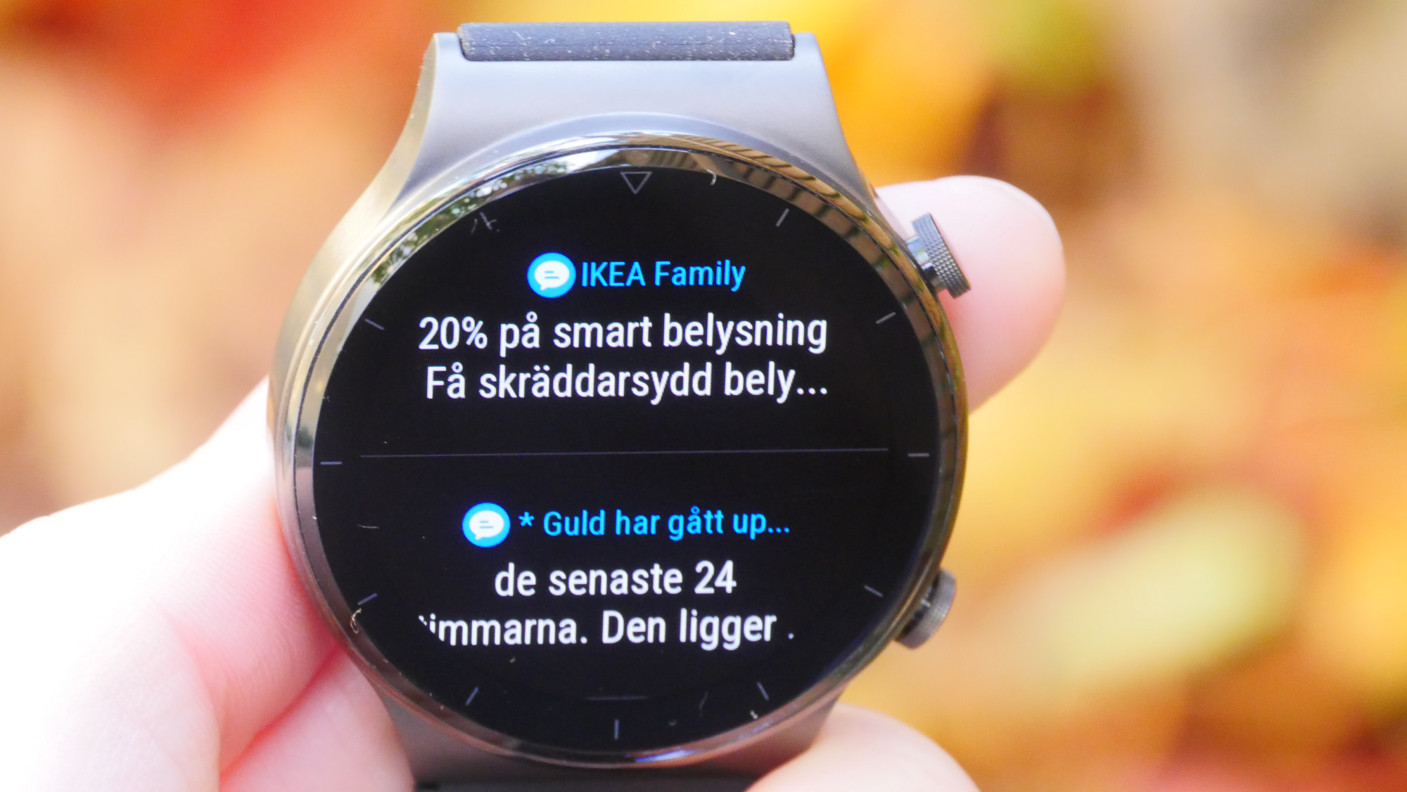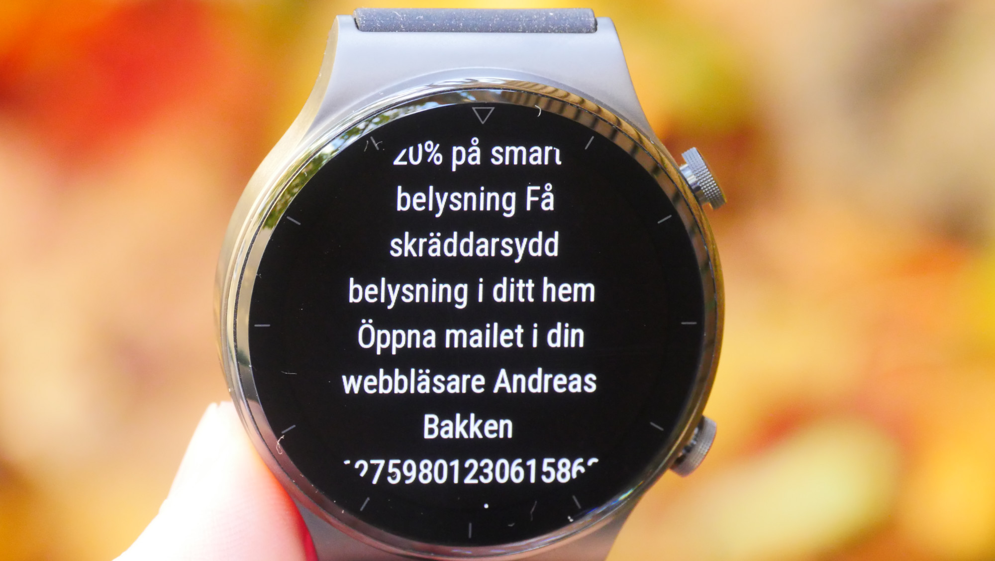 Huawei Watch GT 2 Pros hantering av notiser får oss också att inse att Huawei inte har fokuserat på mjukvara sedan den första GT-klockan. Notiser tas emot snabbt och effektivt men förutom det finns det inte mycket att säga. För att svepa bort en notis, vilket är det enda vi kan göra med dem, måste vi först öppna notisen och sedan svepa. Detta tar oss tillbaka till klockansiktet. Vill vi bli av med notiser måste vi bläddra till botten, där Huawei har placerat en knapp för ändamålet.