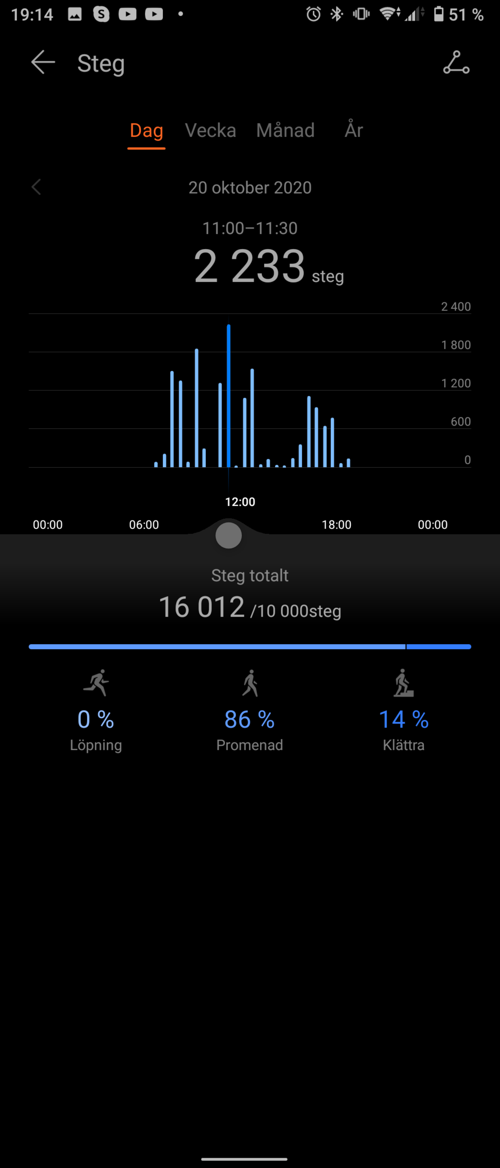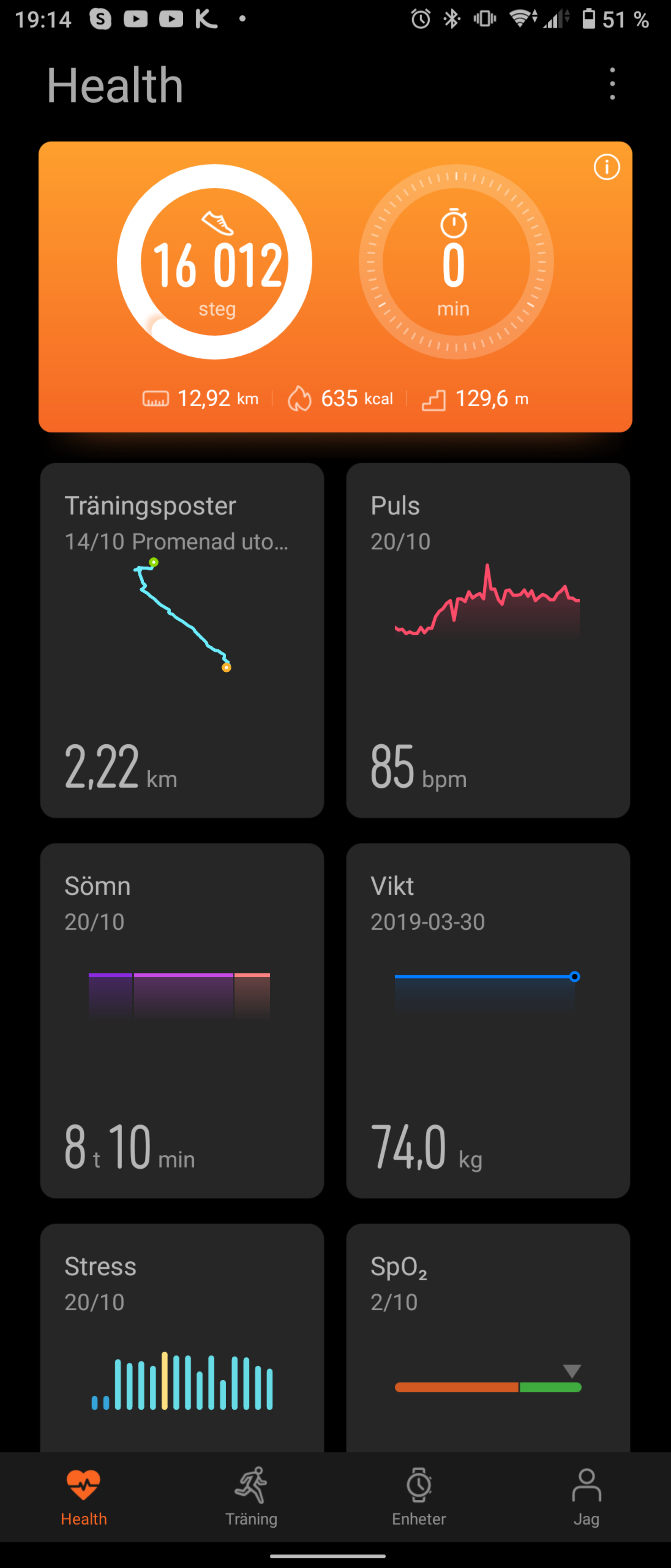 Huawei Health listar en sammanfattning av data såsom stegräkning, trappklättring, pulsvärden och träningspass på förstasidan. Varje kategori går att öppna för en mer djupdykande analys där vi kan se daglig prestanda eller sammanfattningar för veckor eller månader. Huaweis app är lättnavigerad och tydlig i sin beskrivning. Vi önskar dock att vi kunde stänga av användning av telefonens stegräknare om vi önskar.