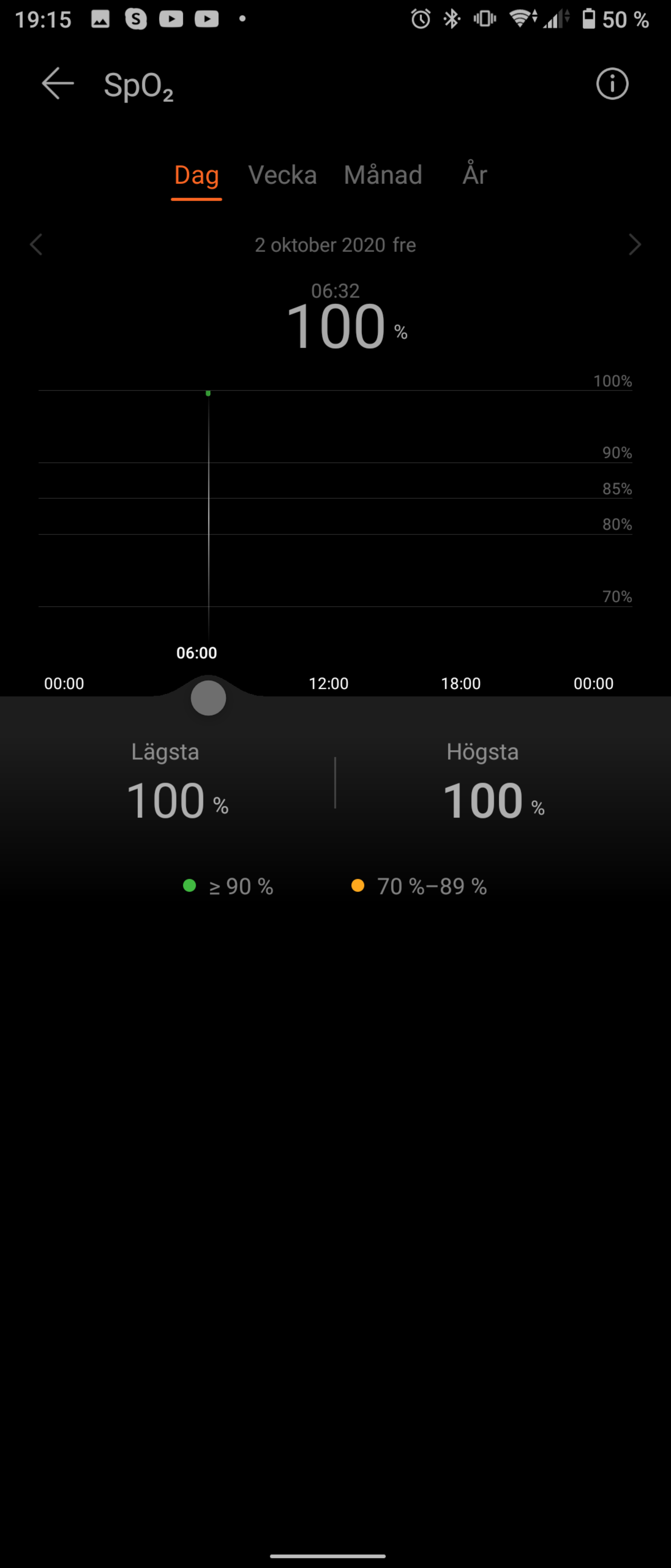 2020 års mest populära nya sensor är den så kallade SPo2-sensorn, som mäter blodets syrenivå. Precis som andra tillverkare så marknadsför Huawei funktionen som en övervakare för personligt bruk. Vi ser tyvärr inte att sensorn lyckas ge en pålitlig läsning. Den pendlar ofta mellan 99 och 100 procent för att sedan fastna på 100. När det rekommenderade värdet är att ligga på är över 90 procent, kanske felmarginalen verkar oviktig, men ett fel på två eller tre procent för kan ge en falsk trygghet och resultera i viktiga förändringar.