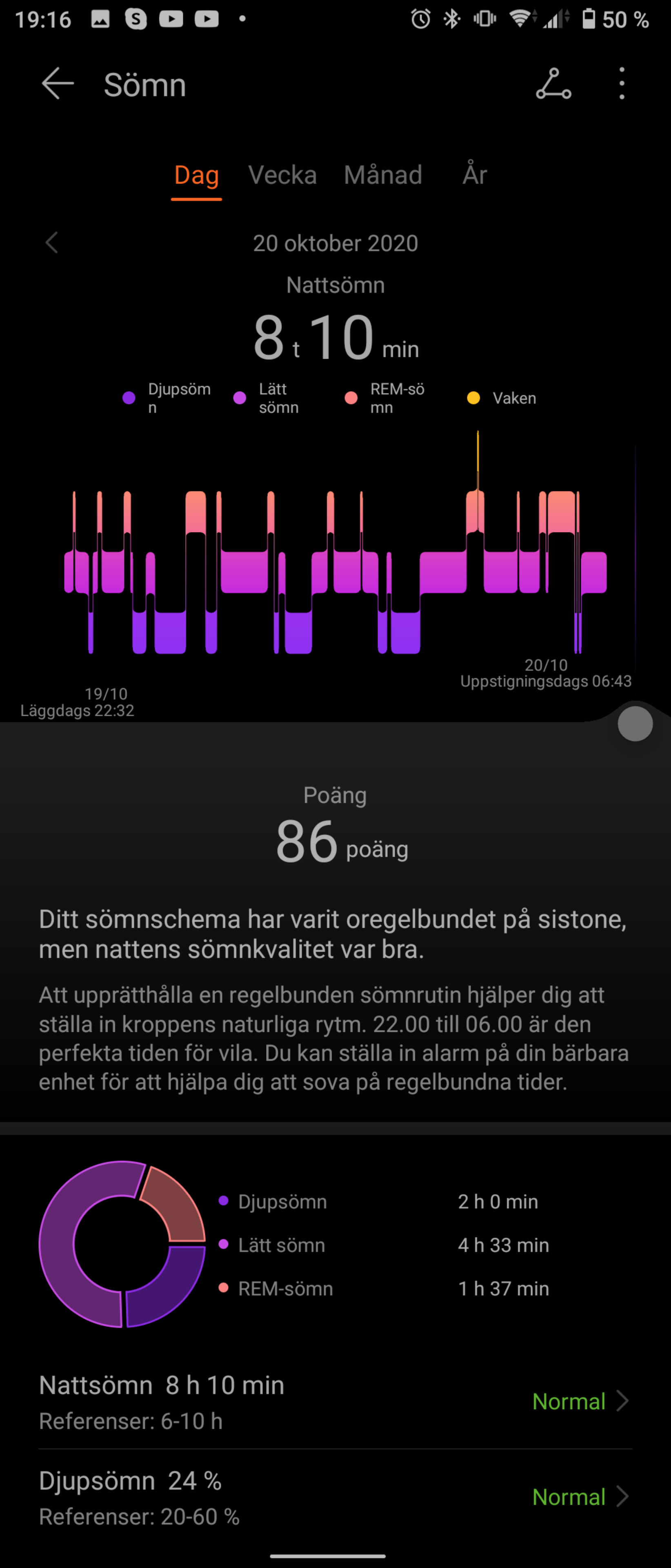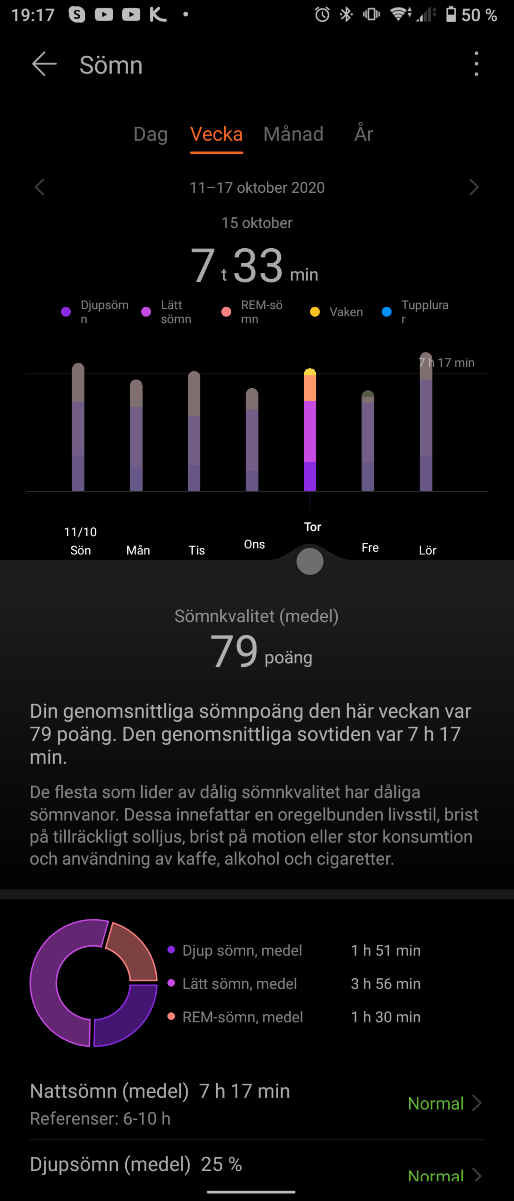Vad som gör Huaweis TruSleep så intressant är all data som registreras i tillägg till sömnfaserna, såsom djupsömnens kontinuitet och andningskvalitet. Varje kategori går att öppna för tips och rekommendationer. Vi uppskattar också att Huawei presenterar sina faktakällor. Sömnmätningen kan kontrolleras per sömnfas eller med ett beräknat sömnpoänget som presenteras i stora siffror mitt på skärmen. Appen visar också veckostatistik eller till och med månadsstatistik. Huawei mäter också tupplurar men all sömn som är kortare än en timma visas utan faser eller djupare sömndata. Den användare som vill ha en pålitlig sömnmätare kan i alla fall titta på Huawei Watch GT 2 Pro.