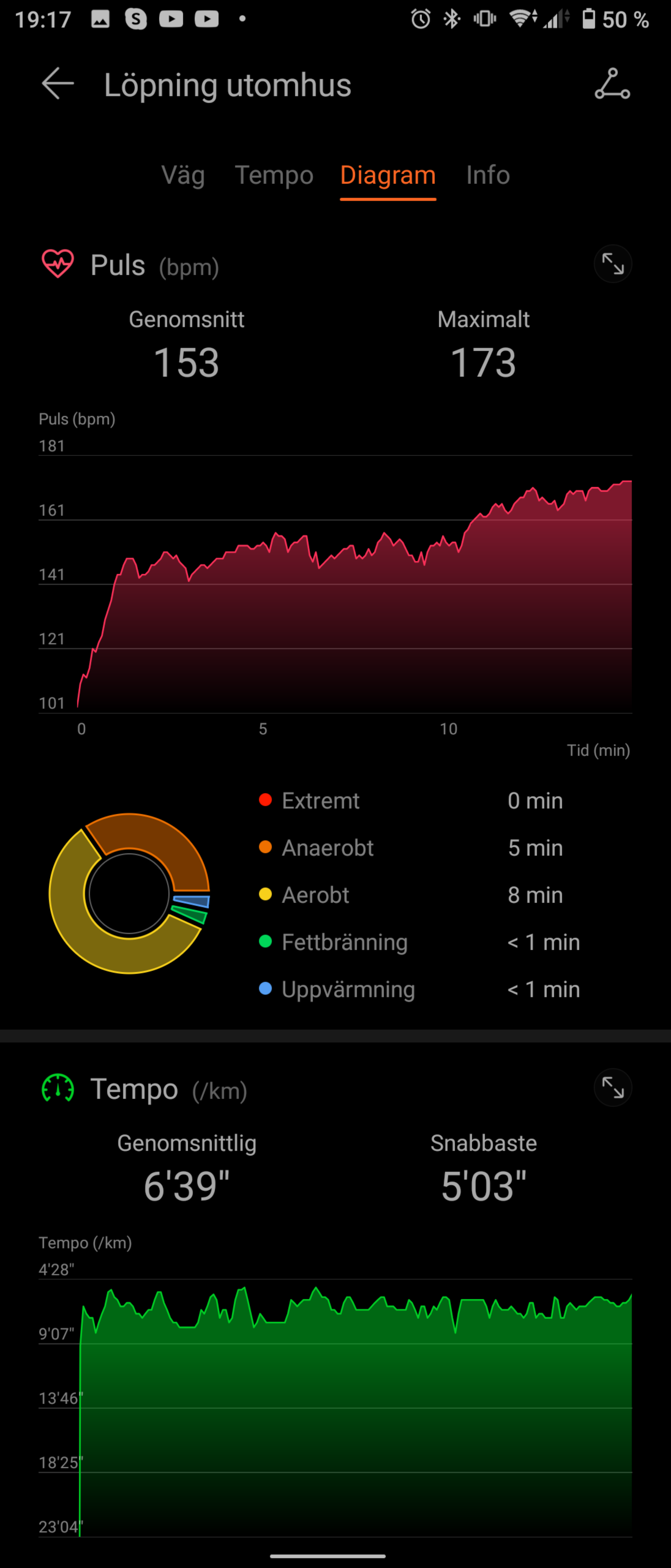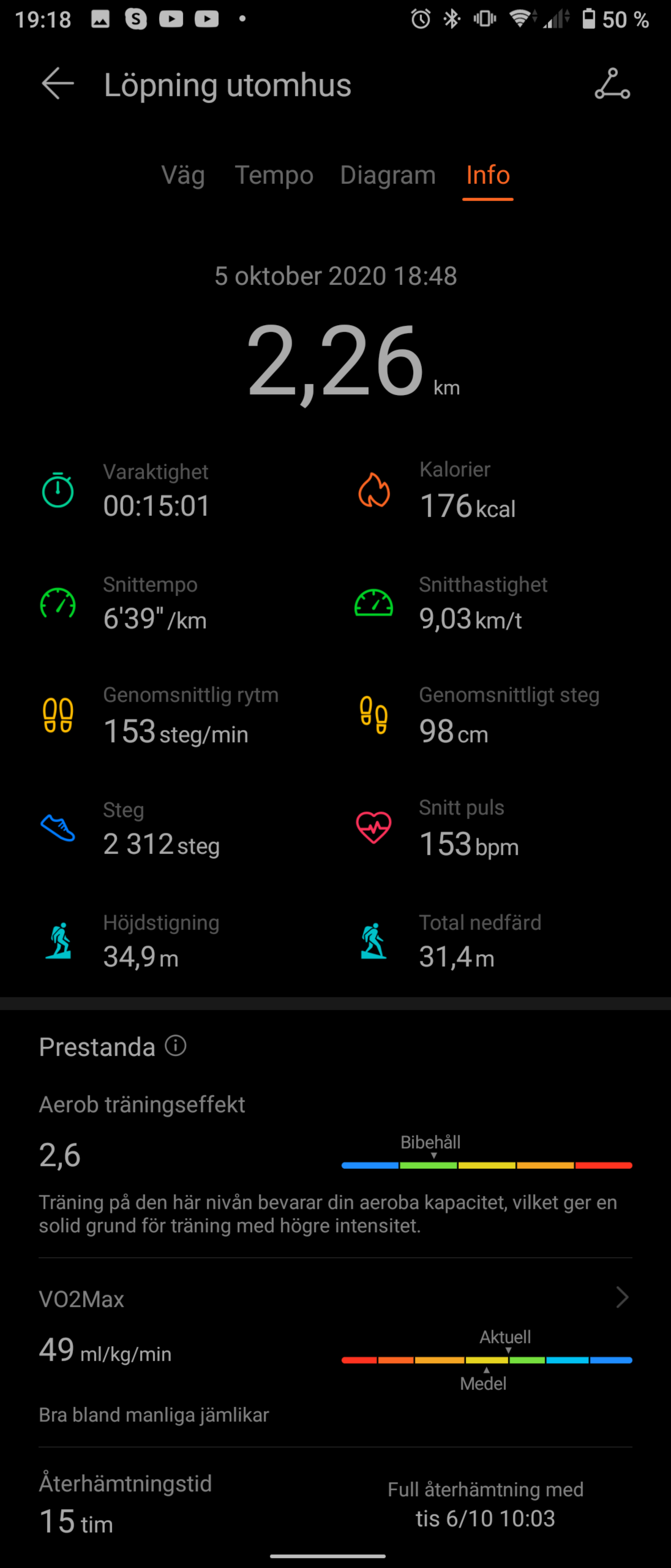 Efter ett träningspass får vi en mängd information gällande medelhastighet, antal steg, steglängd samt kadens. Här samlar klockan också pulsvärden från träningen och erbjuder både redovisad kaloriförbränning och Vo2Max-data för en uppmätt konditionsnivå. Trots Huaweis uppdaterade pulsmätare ser vi dock inkonsekventa resultat, där klockan gärna ligger för högt i början för att sedan ligga för lågt mot slutet. Klockan påverkas mycket av hur den sitter på armen, både i höjd och stramhet, men ger trots det inte resultat inom en godkänd felmarginal. Det betyder också att både kaloriförbränning och Vo2Max-värdet går att ifrågasätta.