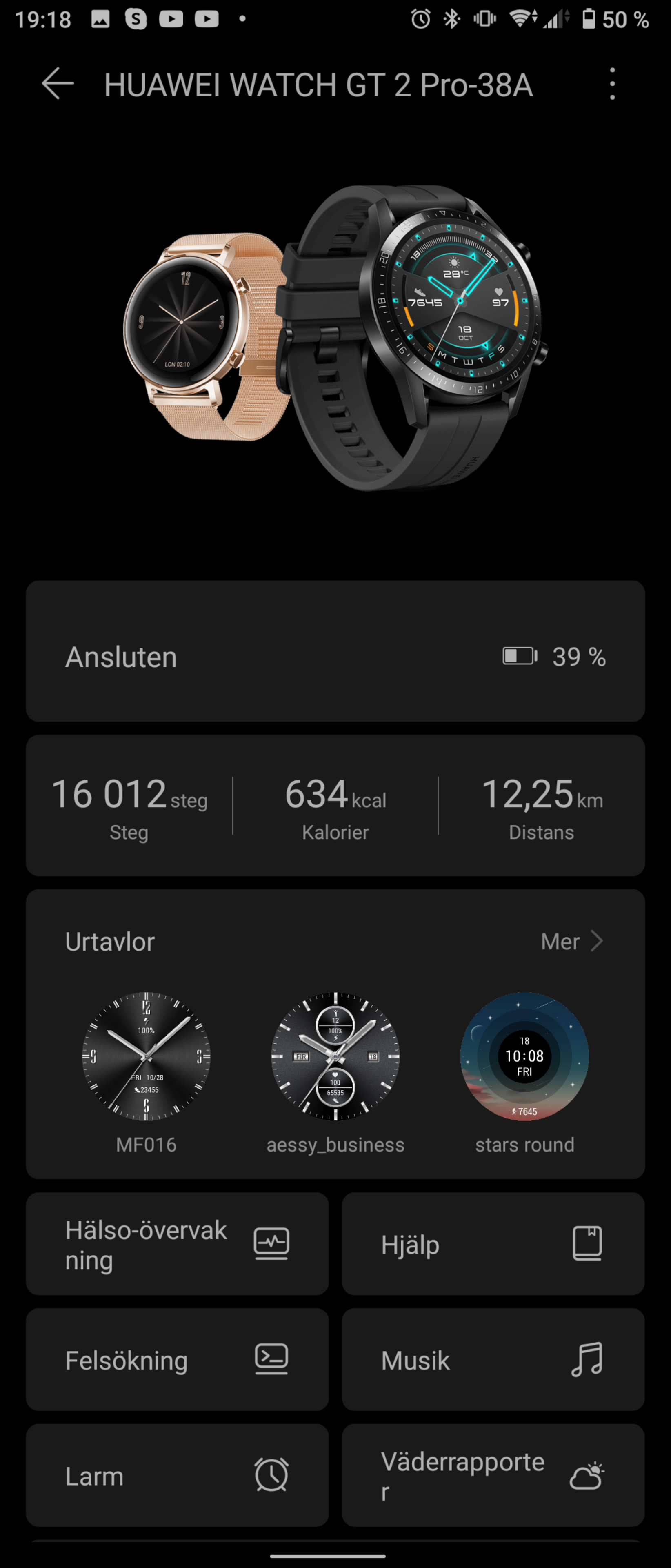 Huawei Watch GT 2 Pro kan kopplas till både Android-telefoner och iPhones. Funktionellt sett förlorar vi inte mycket vad vi än väljer. För att parkoppla klockan används appen Huawei Health. Precis som Fitbit använder Huawei endast en app för att hantera både hälsodata och för att hantera klockan. Vissa enhetsinställnignar kan hanteras på telefonens större skärm, vilket vi uppskattar. Skillnaden mellan iOS hittar vi direkt vid parkopplingen, då iOS-versionen kräver två Bluetooth-anslutningar, en för klockan och en för samtal. Vi hittar också färre inställningar i iOS-appen. Från klockans inställningar kan vi installera nya urtavlor och här finns den andra skillnaden mellan Android och iOS. På Android-sidan erbjuds en lång lista av urtavlor från olika designers. iOS-användare får nöja sig med Huaweis basutbud.