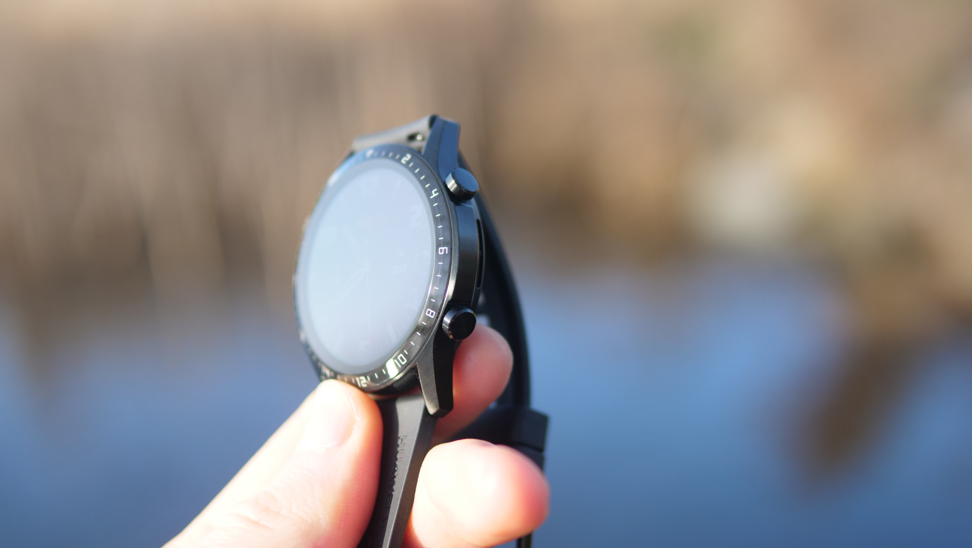 På höger sida av klockan hittar vi två knappar designade som kronor på klassiska armbandsur. Dessa är lätta att hitta och trycka på. Vår testmodell visar en viss ojämnhet då den övre knappen ger ifrån sig ett tydligare klick och tydligare fysisk återkoppling. På undersidan av knapparna hittar vi två avlånga öppningar för högtalaren, något som den tidigare modellen saknade. På motsatt sida hittar vi också ett ensamt och undangömt hål med en mikrofon, en komponent som också är ny för Watch GT 2. Runt klockansiktet och skärmens kant har Huawei skurit ut dekaler för siffror, något som inte innebär någon särskilt praktisk fördel för digitala klockor. Till skillnad från ursprungsmodellen är inte heller kanten högre än skärmen. Tvärtom så är den vinklad nedåt, vilket betyder att den inte skyddar skärmen från eventuella stötar.