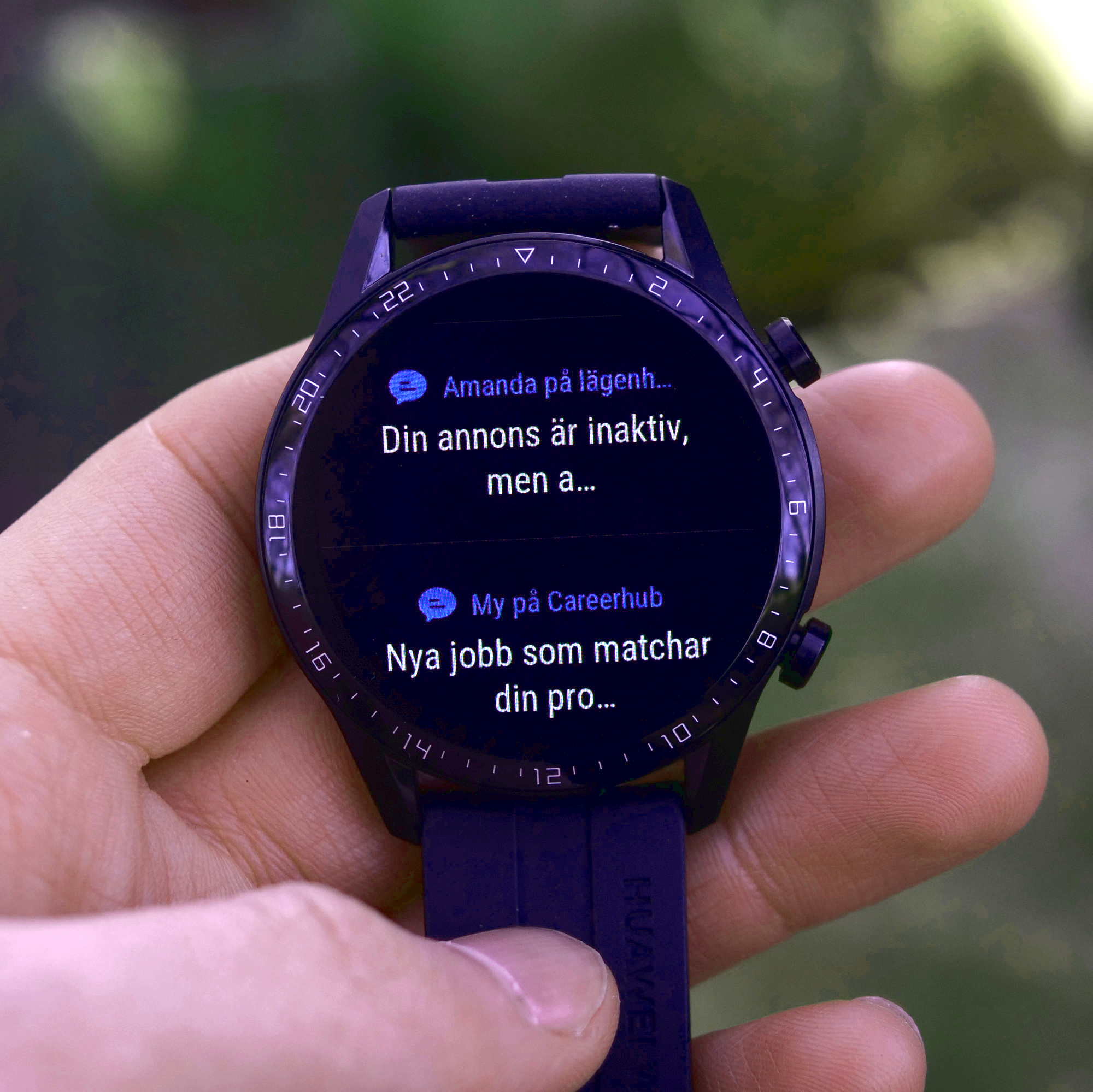 Notiser är en av de vanligaste funktionerna på smarta klockor, med olika bra hantering bland olika operativsystem. På Huawei Watch GT 2 tar klockan emot notiser utan anmärkning. Förutom att visa notiser i sin enklaste form kan den dock inte göra mycket mer. Om klockan har stöd för den aktiva appens ikon visas den men vi noterar att det snarare är ett undantag än vanligt förekommande. Som regel syns istället en ikon som påminner om vilken SMS-app som helst. Därtill visas notisens text mot en svart bakgrund. För att interagera med notiser kan vi svepa bort dem men inte mycket mer. Det finns alltså inget sätt att svara på meddelanden eller välja mellan notisers inbyggda alternativ. Att byta klockansikten är ungefär lika restriktivt, med 14 förinstallerade klockansikten. Det finns totalt 35 stycken men då behöver vi öppna mobilappen och välja mellan Huaweis designer.