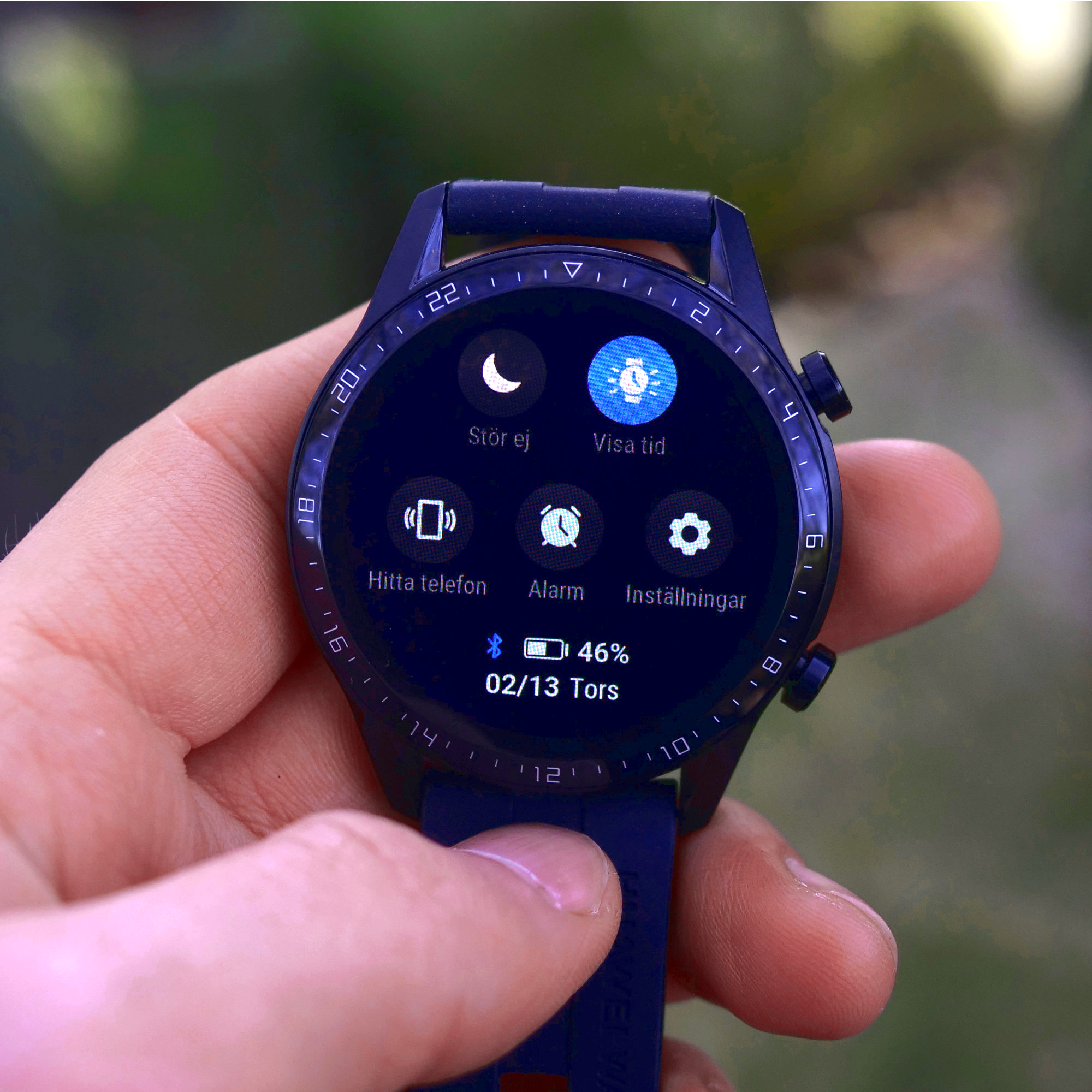 Något som klockan saknar är Wi-F. Bluetooth används alltså för att synka med telefonen. Andra smarta klockor använder gärna nätverk för att förlänga räckvidden för att exempelvis visa notiser. Huawei Watch GT 2 är vattenresistent enligt 5ATM, vilket innebär en teoretisk tålighet för 50 meter i tryck. Det vill säga att klockan kan hantera oväder, simning och att regelbundet bäras i duschen utan problem. Som vanligt rekommenderar vi dock inte att man djupdyker med Watch GT 2 på armen. Den bör inte heller användas för högintensiva aktiviteter i vatten, så som vattenskidor. Den inbyggda vibrationsmotorn tillkallar sig effektivt uppmärksamhet och till skillnad från den tidigare modellen stör den inte omgivningen. Vi kan välja mellan två vibrationslägen, Stark eller Svag, som också påverkar hur länge klockan vibrerar.