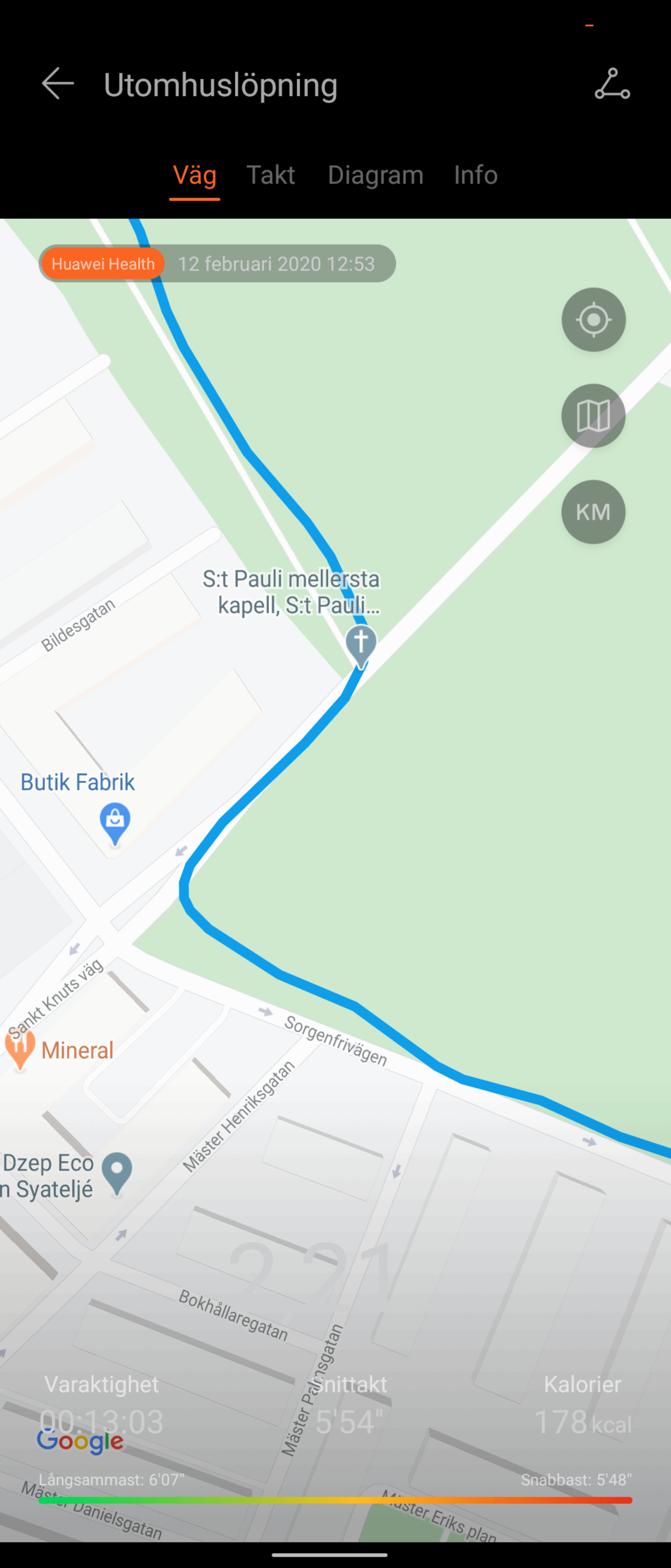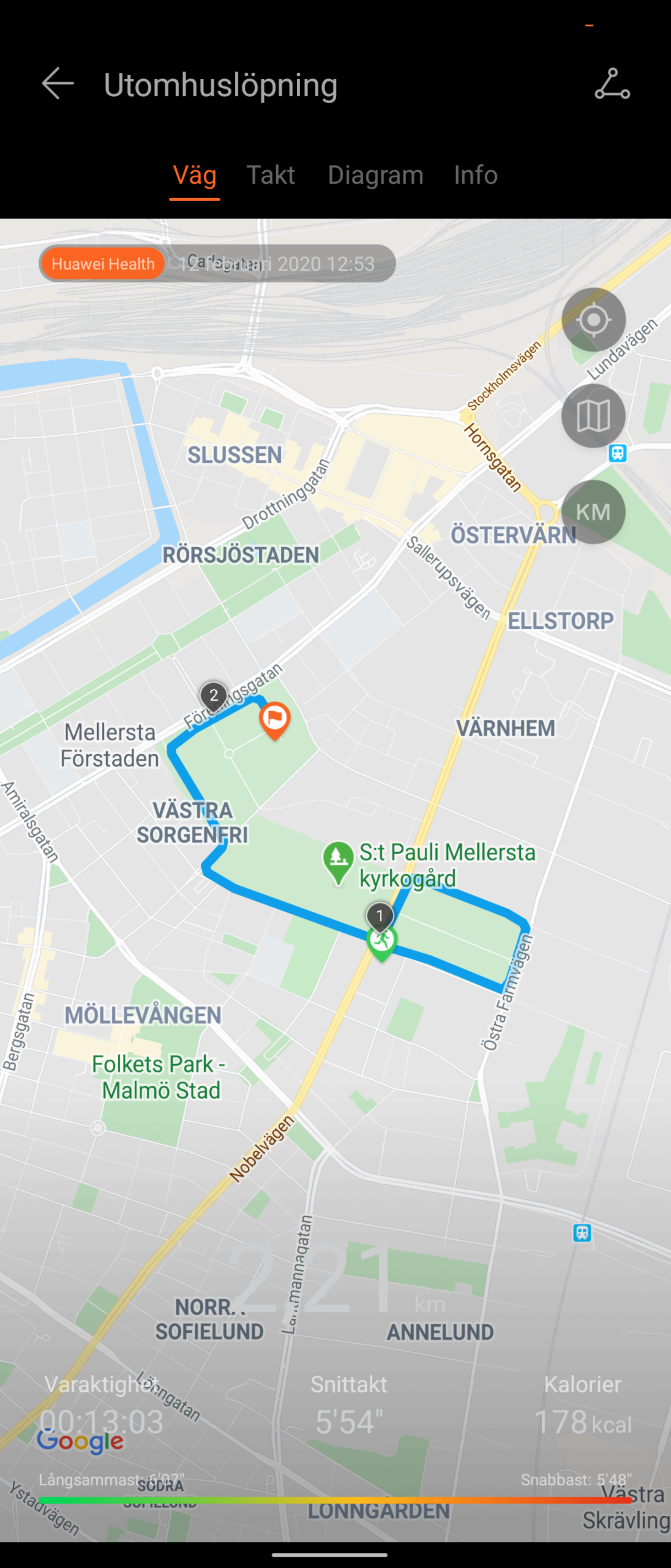 Som träningsklocka är Huawei Watch GT 2 konstruerad med konditionsträning i fokus. Här hittar vi aktiviteter som jogging, simning, elliptisk träningsmaskin och roddmaskin. Den som vill styrketräna får nöja sig med aktiviteten ”Övriga”, som mäter puls och tidsåtgång utan kontext. Med en inbyggd GPS kan Watch GT 2 lämna telefonen hemma och mäta distans och hastighet samt rutt. Under vårt test på 2,3 kilometer ser vi dock att klockan missar och visar 2,21 kilometer. Största anledningen är att den utmätta rutten ibland inte följer med utan visar en hel del genvägar genom staket och träd som vi inte tog. På skärmen får vi följa vår nuvarande hastighet, pulsnivå och steg. Klockan visar också en smidig animation för kadens och hastighet om vi bläddrar bland de olika vyerna. Det är också under träning som barometern utnyttjas för att mäta höjdskillnader.