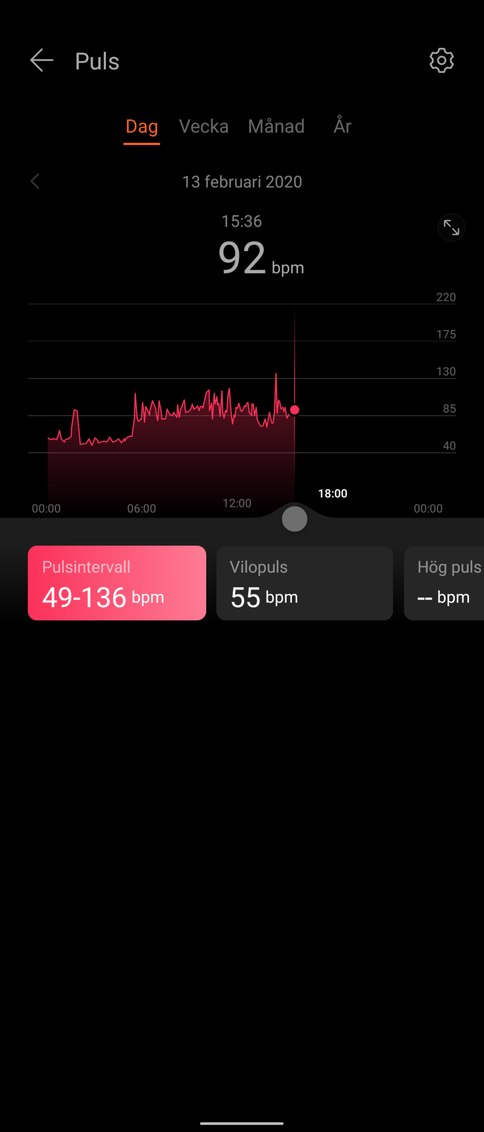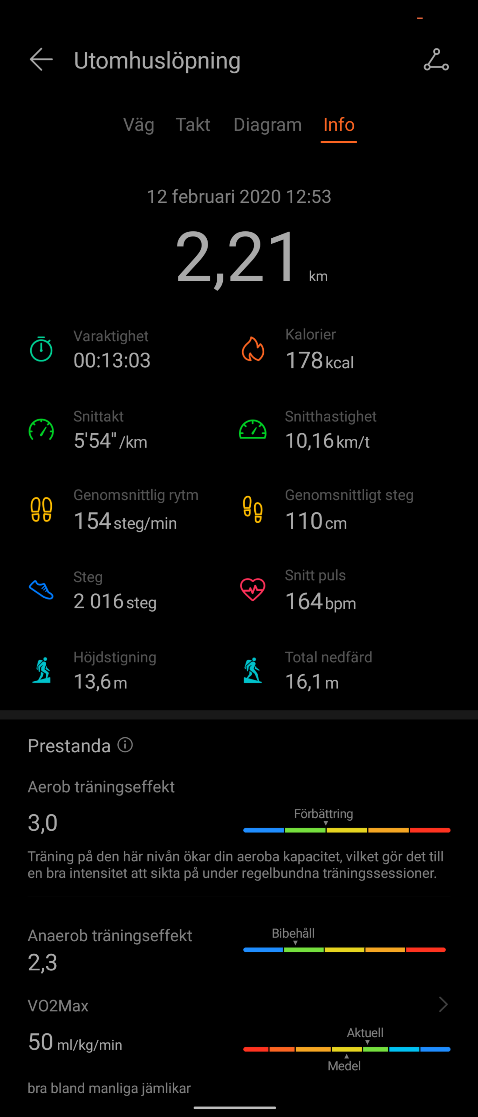 Under träningen försöker pulsmätaren mäta nuvarande puls samt ge en indikation på hur effektiv träningen är för användaren. Här ser vi dock att mätaren gärna hoppar till höga värden för fort och att den har svårt att hålla en stabil avläsning. Den blir bättre om vi stramar åt den till en obekväm passform. Den hoppar ändå titt som tätt utanför en godkänd felmarginal. Det är synd eftersom Huawei Health annars erbjuder mycket data om träningspasset, med beskrivning av träningseffekt och det populära värdet VO2max.