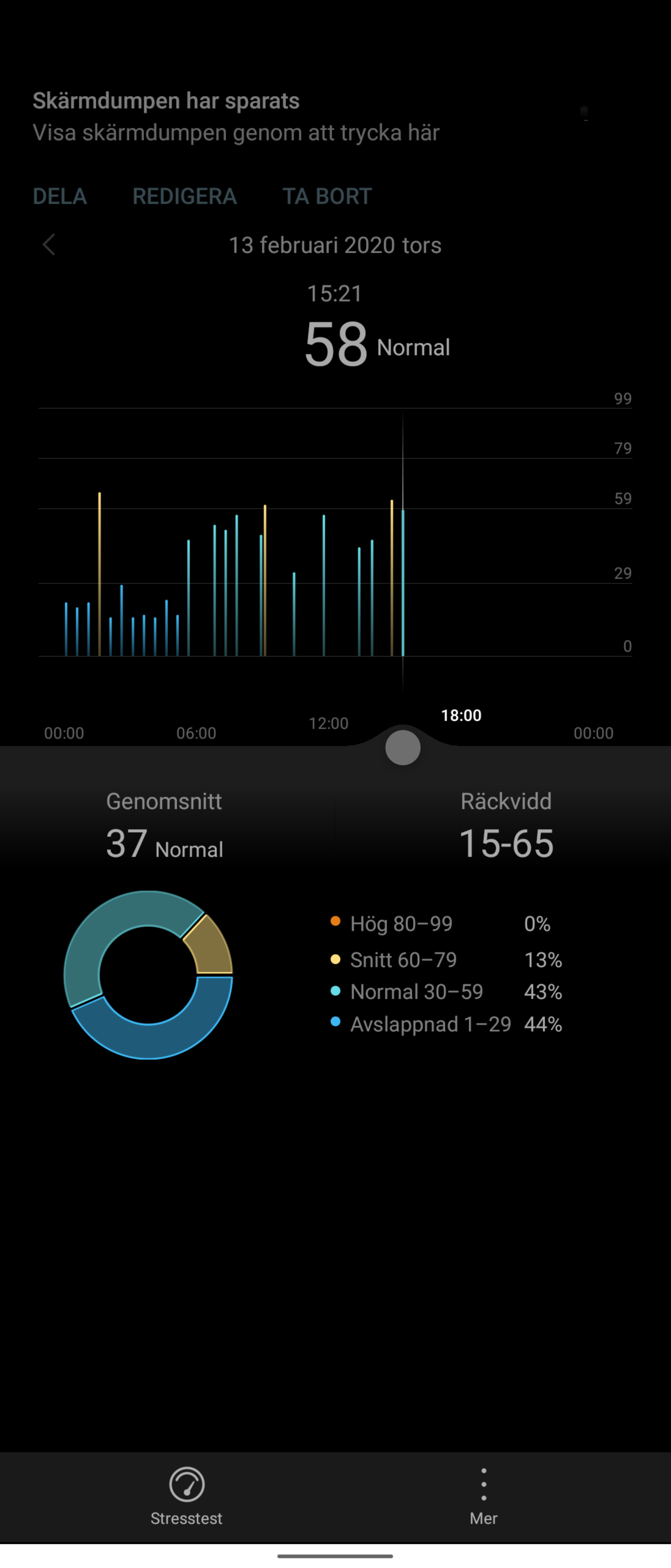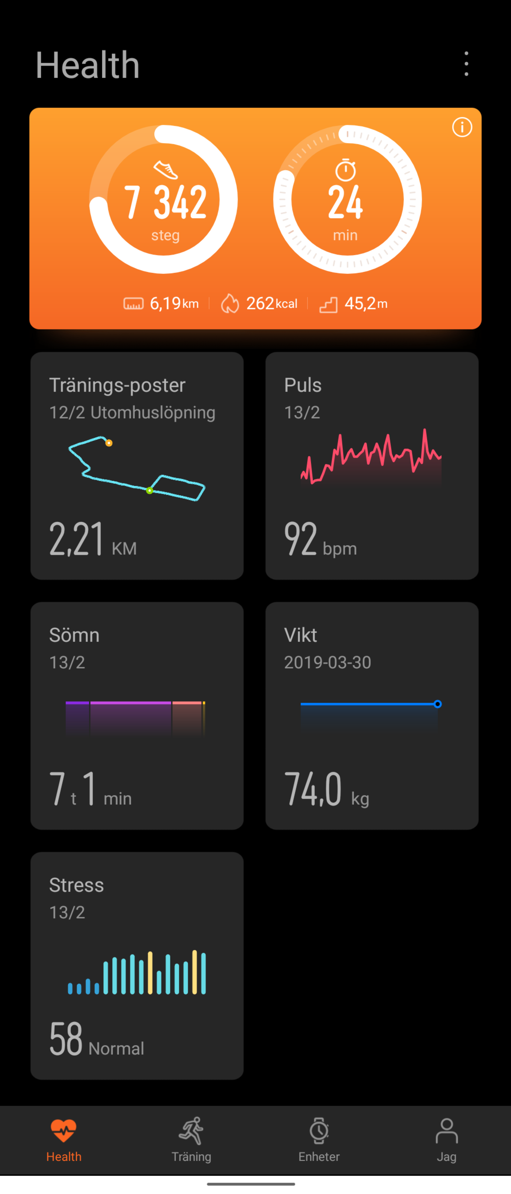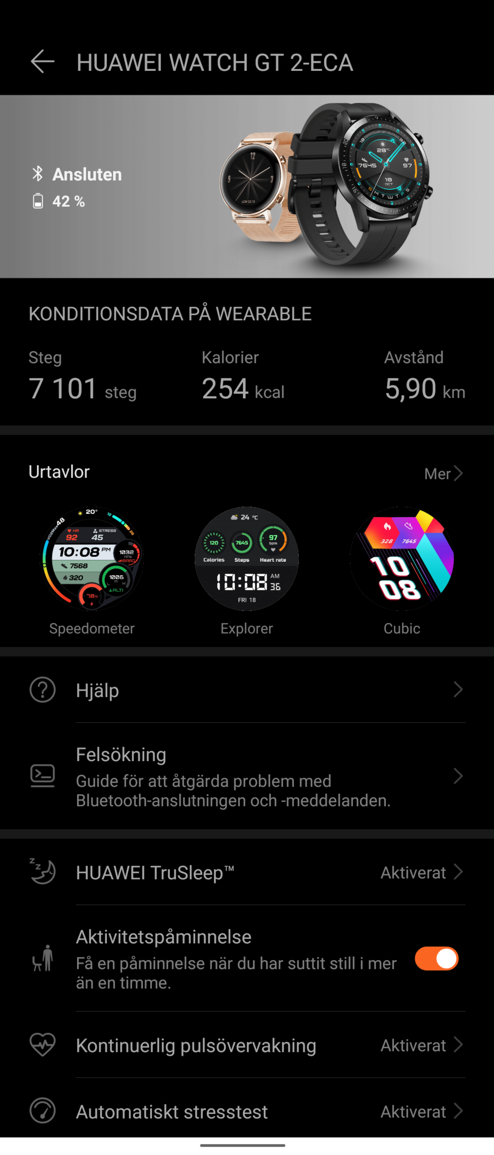 Huawei Watch GT 2 ansluts till telefonen genom appen Huawei Health. Här hittar vi möjligheten att se över både spårad hälsa- och träningsdata samt ändra klockans inställningar. Som tidigare nämnt är det också härifrån vi kan byta klockansikte eller lägga till musik. Klockan fungerar med både Android- och iOS-enheter och vi ser relativt få begränsningar eller skillnader beroende på vilket operativsystem vi använder. Health-appen är lättnavigerad och ger en enkel överblick av dagens värden samt ett överskådligt sätt att navigera i klockans alternativ. Här sparas även prestationer och totala värden för exempelvis hur många steg vi gått med klockan totalt. På Android-sidan har vi fullt stöd för alla alternativ och får även ett värde för stresshantering. Klockan använder då sin pulssensor för att beräkna stress över dagen.