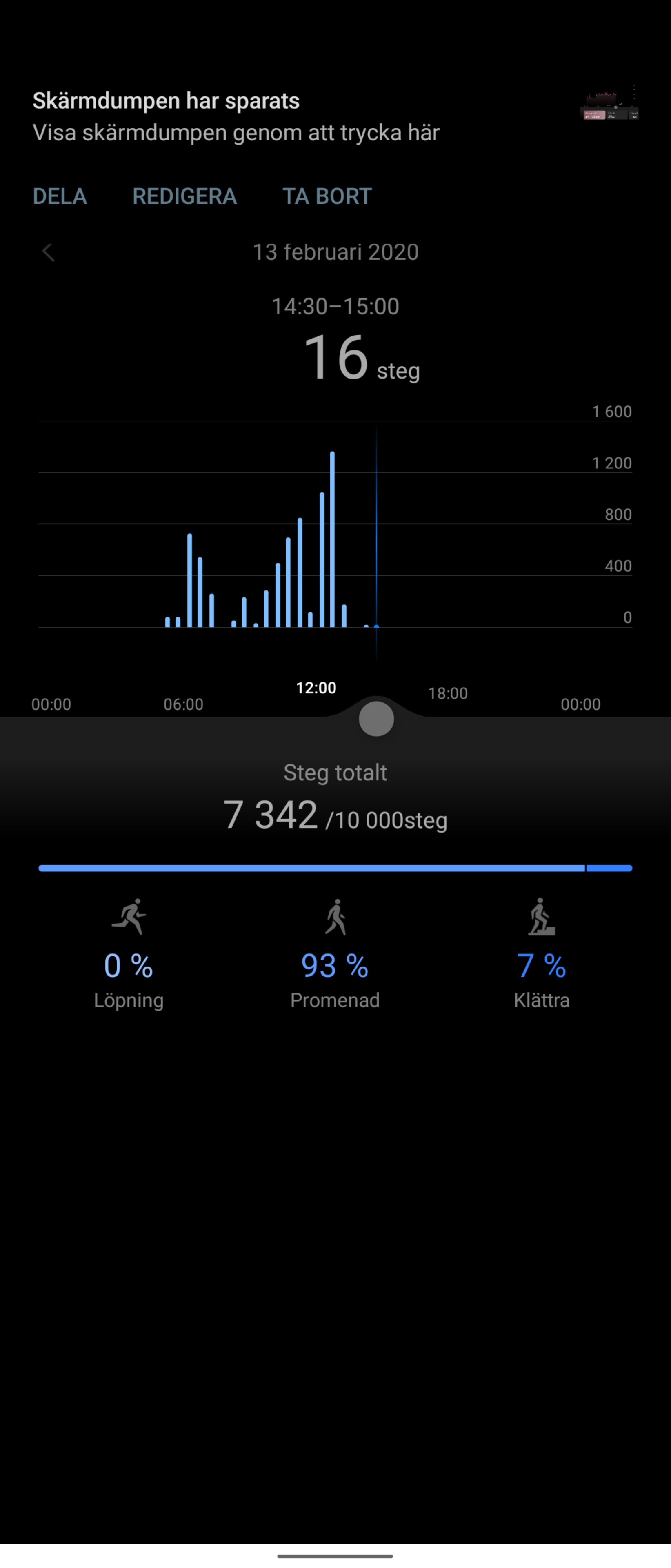 Vardagsaktivitet mäts primärt genom att räkna steg. Under vårt test på 500 steg ser vi att klockan har en felmarginal på 9 steg, vid ett tillfälle, och 16 steg vid ett annat. Båda gångerna räknat för mycket. Det innebär att Huawei Watch GT 2 tyvärr är en av de mindre pålitliga stegräknarna vi har testat, där endast Fitbit Versa Lite presterar sämre. Tyvärr ser vi också att klockans stegräkning kombineras med mobiltelefonens. Tanken är att telefonen ska räkna steg om klockan inte är aktiv. Resultatet är två värden som skiljer sig åt och ett totalvärde som är svårt att validera. Skillnaden kan variera med över 100 steg och Watch GT 2s redan opålitliga stegräknare än mer förvirrande. Som en positiv fotnot räknas nu vanliga promenader in i dagens ”Aktiva minuter”, något dem inte gjorde när vi testade den tidigare modellen.
