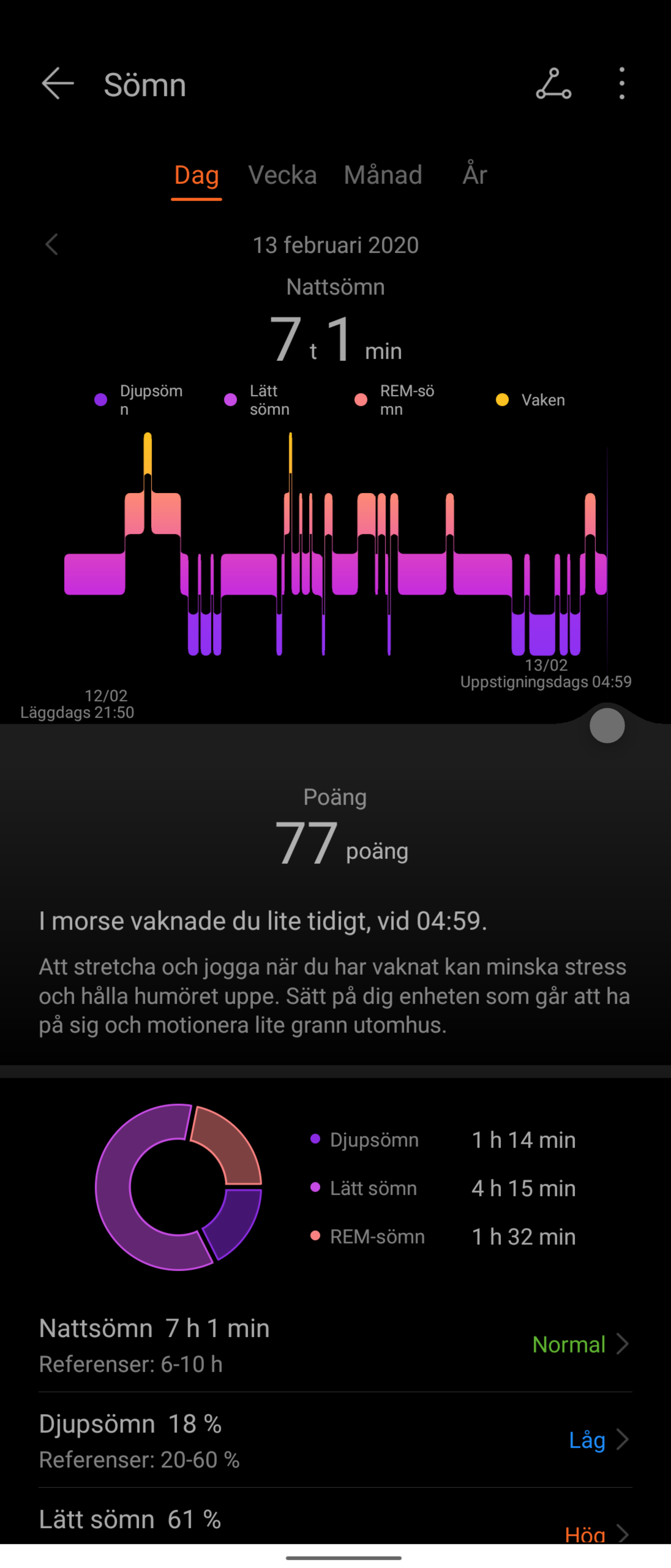 Något som Huawei gör bra är sömnmätning. Den fantasifullt döpta funktionen Trusleep 2.0 är en mindre revidering av den tidigare modellens sömnmätning. Precis som på Huawei Watch GT har GT 2 en responsiv och informationsrik sömnmätare som gärna ger uppmärksamhet till vetenskapliga teorier. Huawei Watch GT 2 mäter de tre sömnlägena Lätt-, Djup, och REM-sömn samt tiden användaren har varit vaken på natten. Dessa värden är svåra att validera men vi kan säga att klockan reagerar snabbt på insomning såväl som uppvaknande. Här ser vi inte heller ett oväntat stort antal små uppvaknanden under natten, som Fitbits sömnmätning ofta visar.