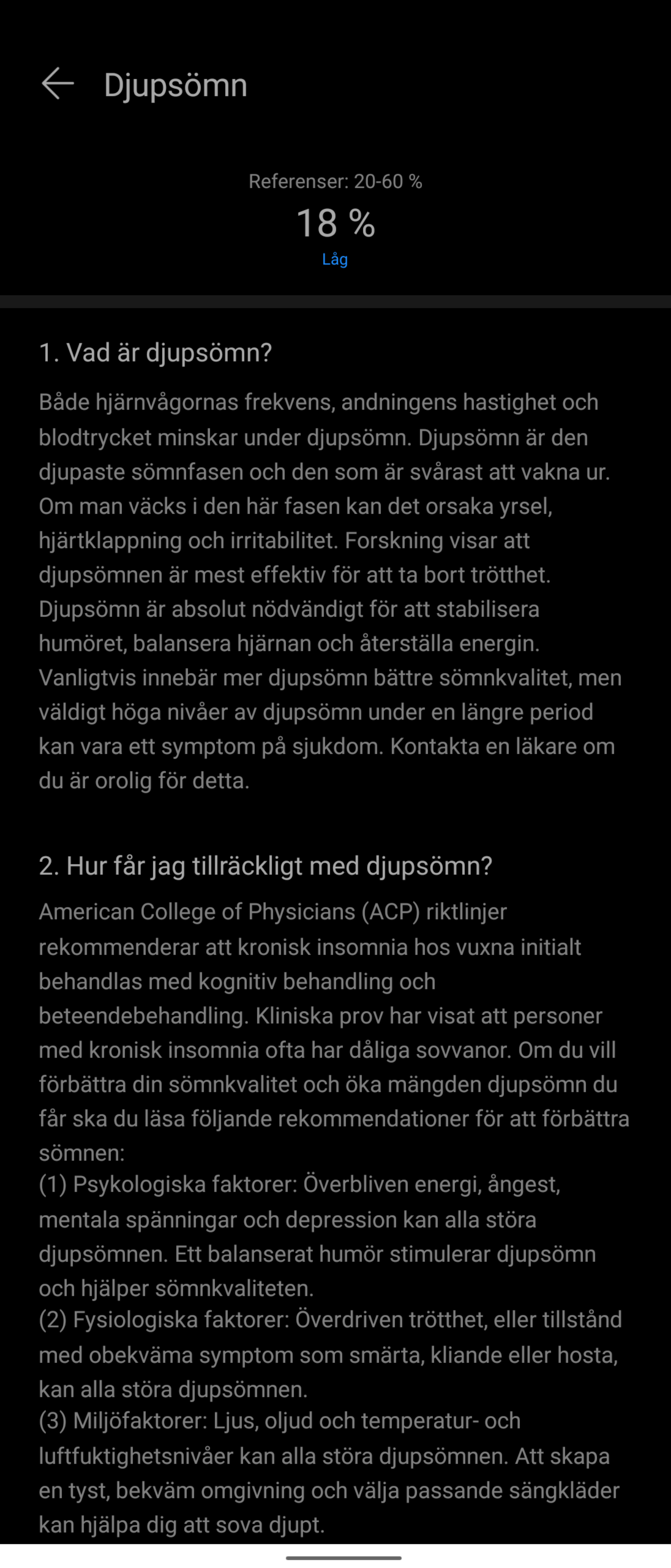 I Huawei Health-appen kan vi också se hur kontinuerlig djupsömnen har varit. Ännu mer intressant är värdet Andningskvalitet som utnyttjar pulsmätarens SPo2-läsning. Detta är ett viktigt värde för att mäta tillstånd som exempelvis sömnapné. Huawei påstår att klockan kan identifiera sex vanliga sömnproblem. Vi rekommenderar givetvis att träffa en läkare om man är orolig. Allt som allt ger Trusleep ändå ett seriöst intryck i sömnmätning, som den enda riktiga rivalen till Fitbits motsvarighet.