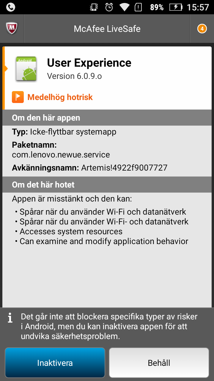 Medan Moto-telefonerna är helt fria från reklamappar och annan onödig mjukvara är C2 Power full av dem. McAfee Security, som också används av Sony, kommer förinstallerad på telefonen. Appen sägs hjälpa användare med deras säkerhet genom att söka igenom appar och leta efter virus i telefonen. Appens värde går dock att ifrågasätta och den försöker dessutom övertala ovetande användare att betala för en årlig tjänst. Som grädde på moset varnar McAfee-appen användare för en förinstallerad app, kallad User Experience. Appen är dock förinstallerad på telefonen och utvecklad av Lenovo. Det är sorgligt dåligt.