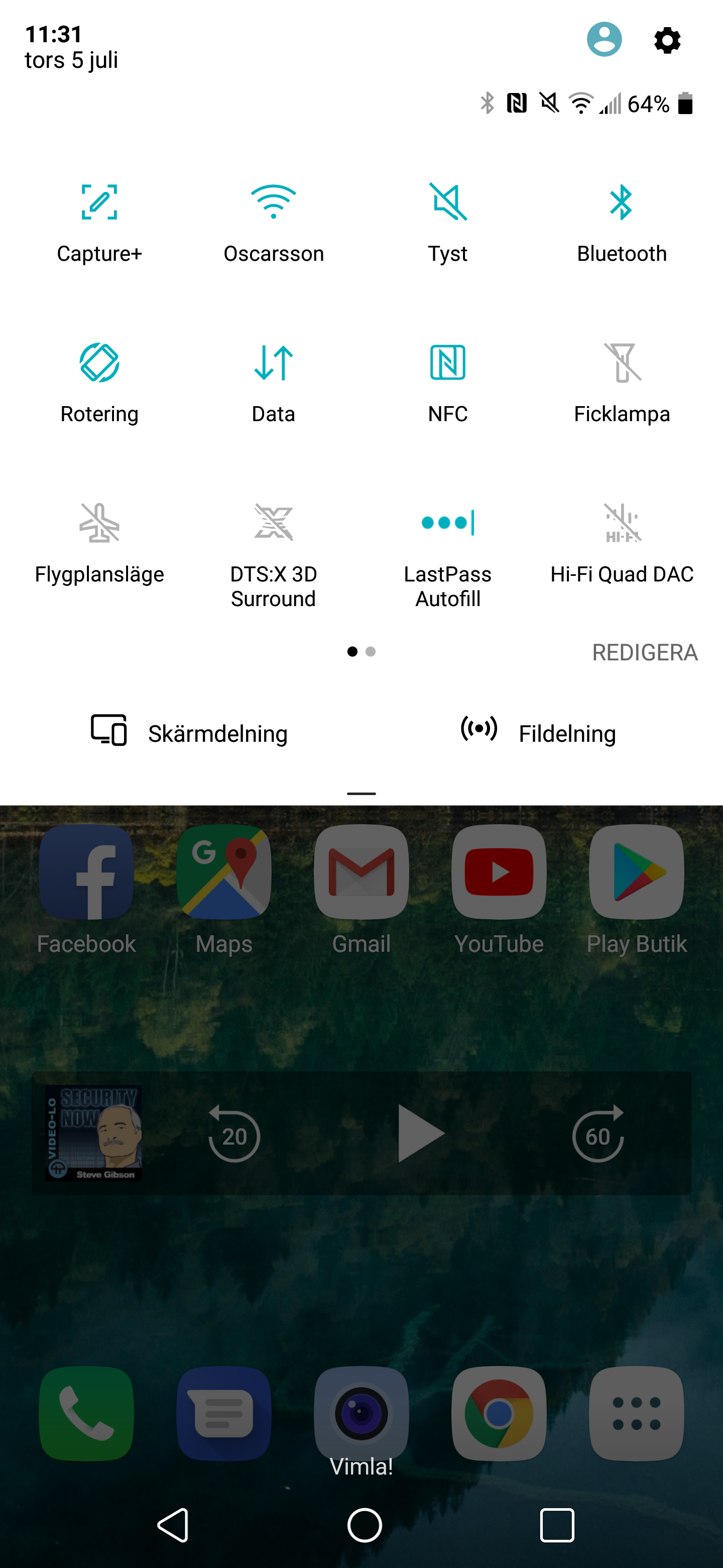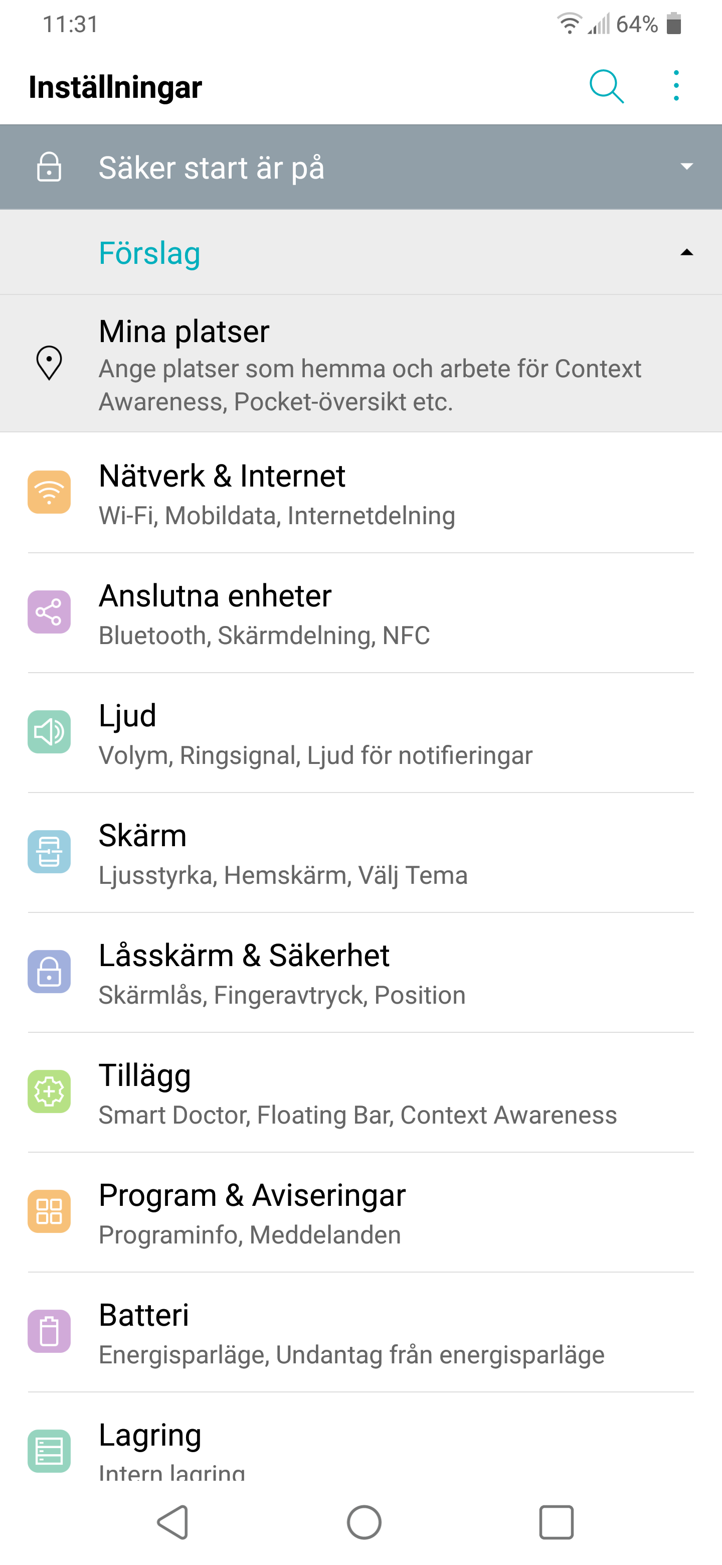 Läs mer om mjukvaranLG G7 ThinQ drivs av Android 8.0.0 och under vår testperiod hade den en säkerhetsuppdatering från maj 2018. Det är intressant att LG har valt att inte inkludera den senaste versionen av Android Oreo. För de allra flesta användare har det ingen större betydelse men det är ett tecken på att den senaste mjukvaran inte nödvändigtvis är en prioritet från LGs sida.