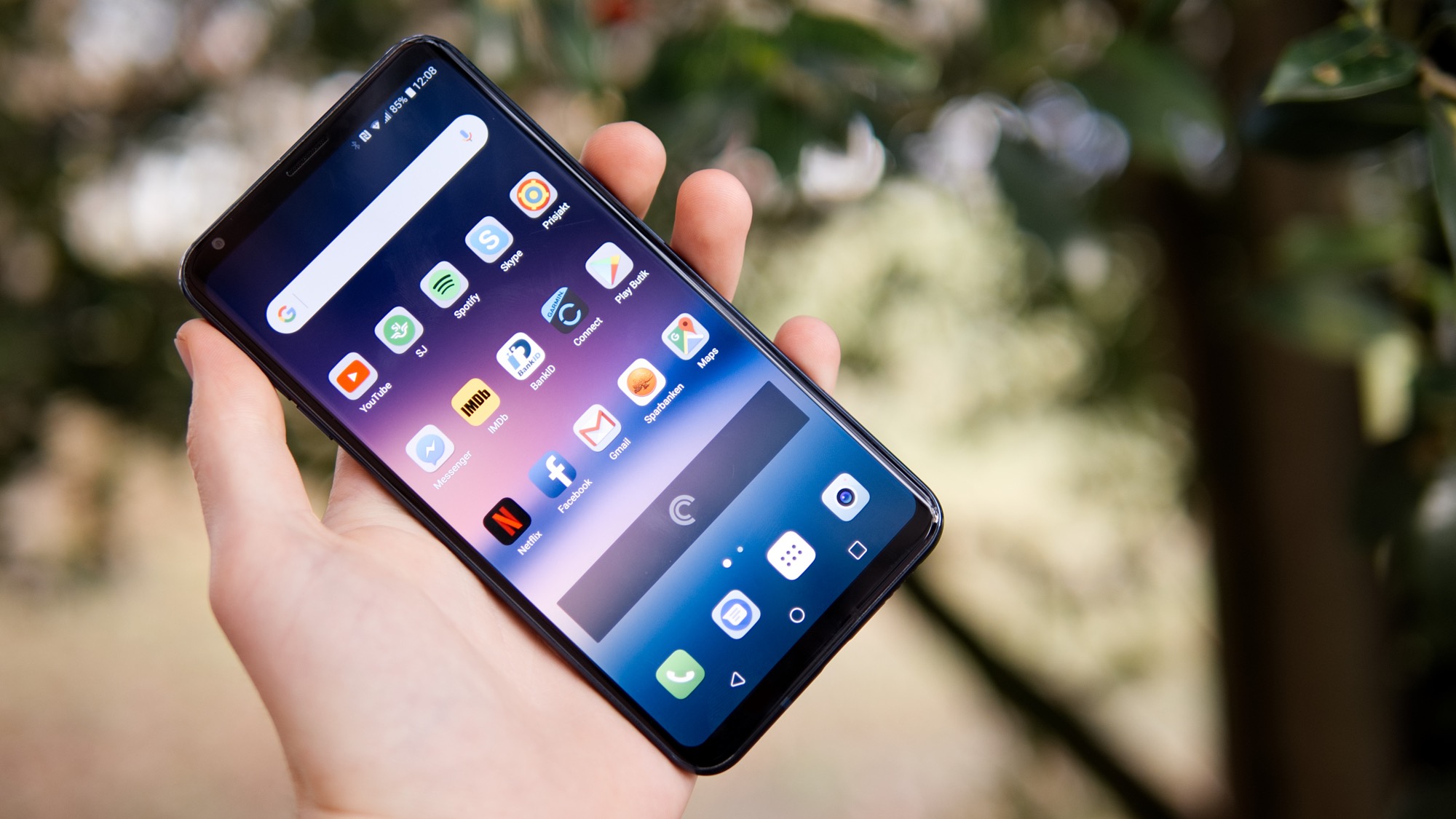 Den stora skärmen gör framsidan av LG V30 fri från onödiga logotyper eller störande detaljer. Smaken är som baken men den rena framsidan av LG V30 med dess rundade hörn och tunna skärmramar ger LG V30 ett snyggt och stilrent utseende, enligt oss. Det passar bra med telefonens väl polerade konstruktion. Vad som inte passar så bra är telefonens vikt. LG V30 väger betydligt mindre än många telefoner i sin storleksklass, 158 gram medan Galaxy S8+ väger 173 gram.