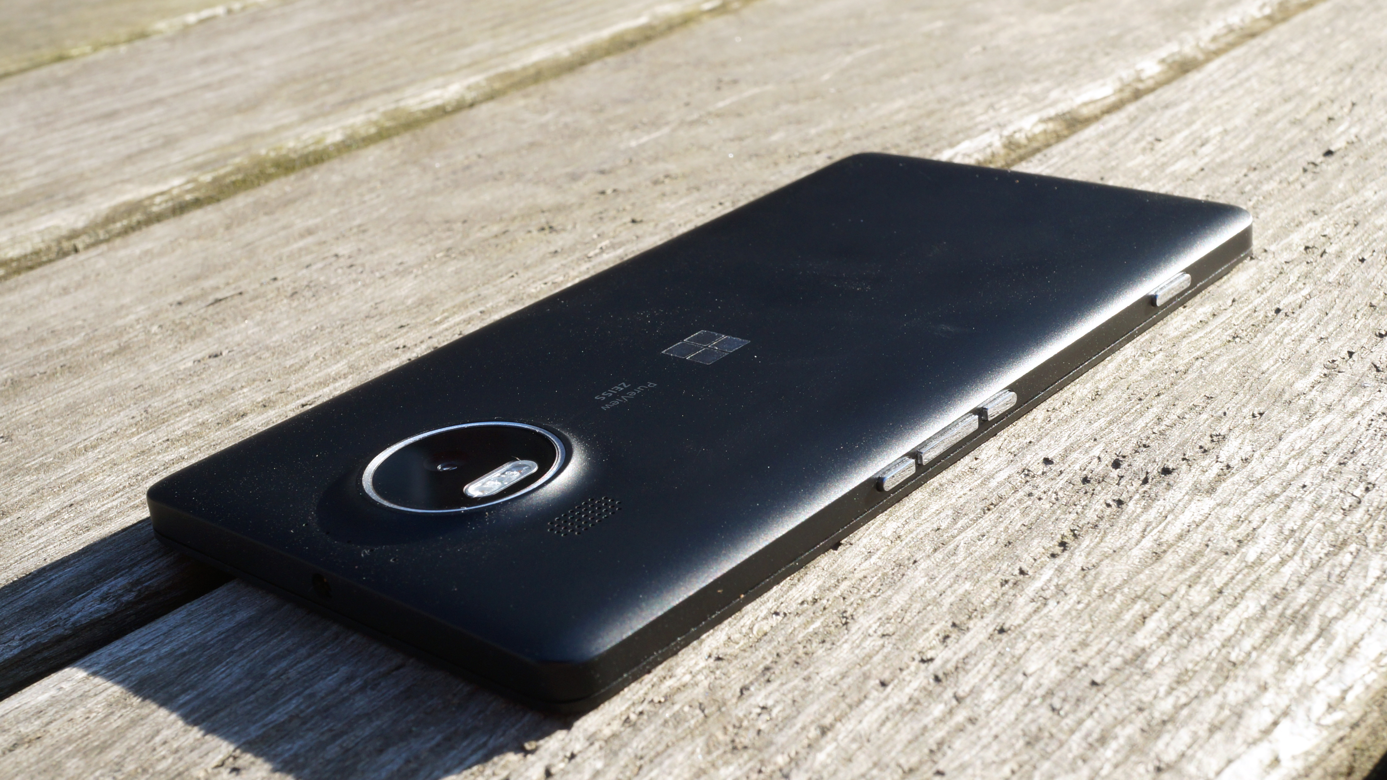 Till vänster om kameran sitter telefonens högtalare och centrerad på telefonens baksida sitter en matt silverfärgad Windows-logga. Mellan loggan och kameran finns två namn skrivna i grå text. ”PureView” och ”Zeiss”. De två namnen berättar att vi kan förvänta oss mycket av telefonens kamera.