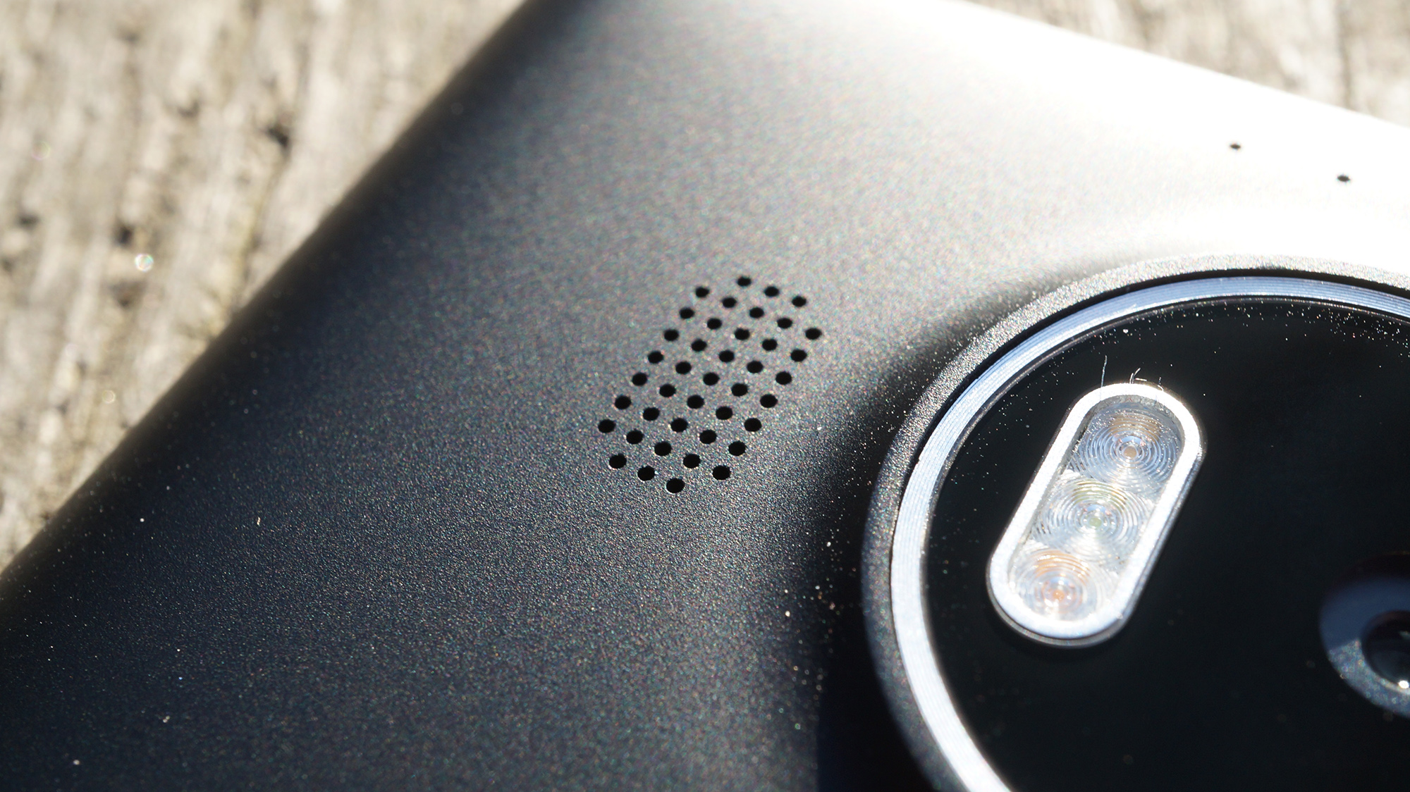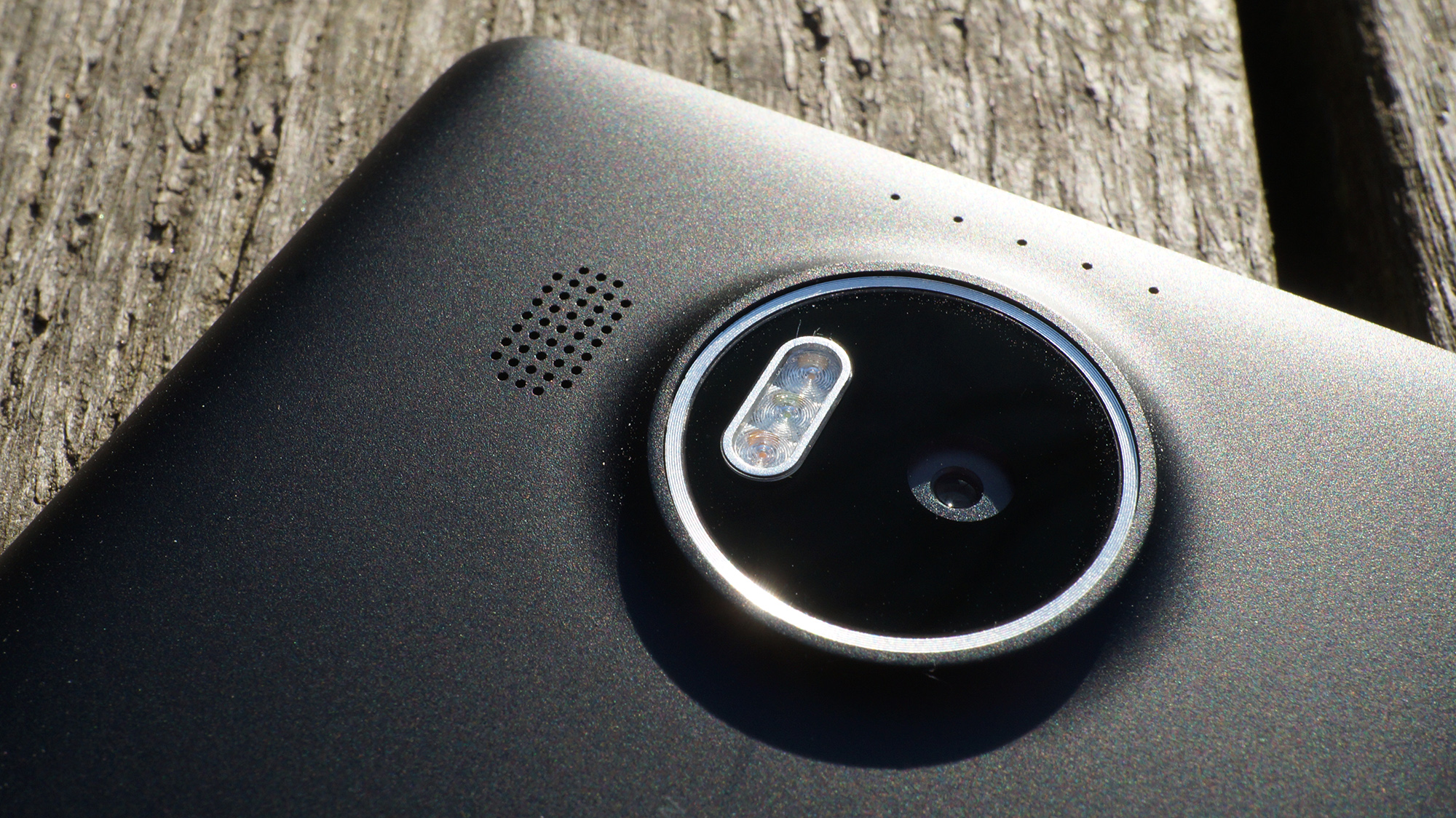 Utöver ett matt plastskal har telefonens baksida ett flertal intressanta komponenter. Kameran är inbyggd i ett stort runt kamerahus som sticker ut ett par millimeter från telefonens baksida. I det runda kamerahuset sitter tre LED-lampor med olika färgtemperatur samt en 20 megapixelkamera.