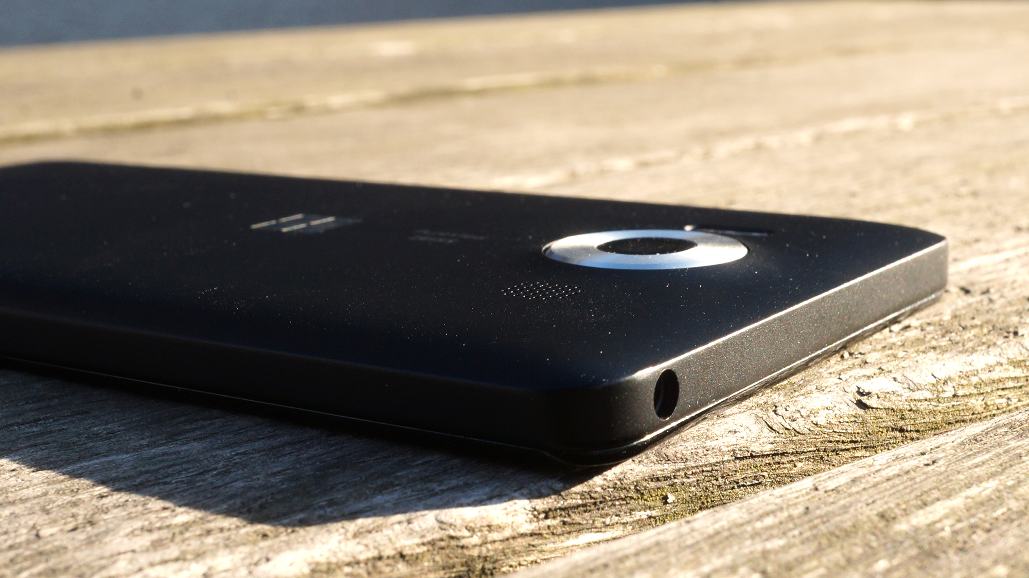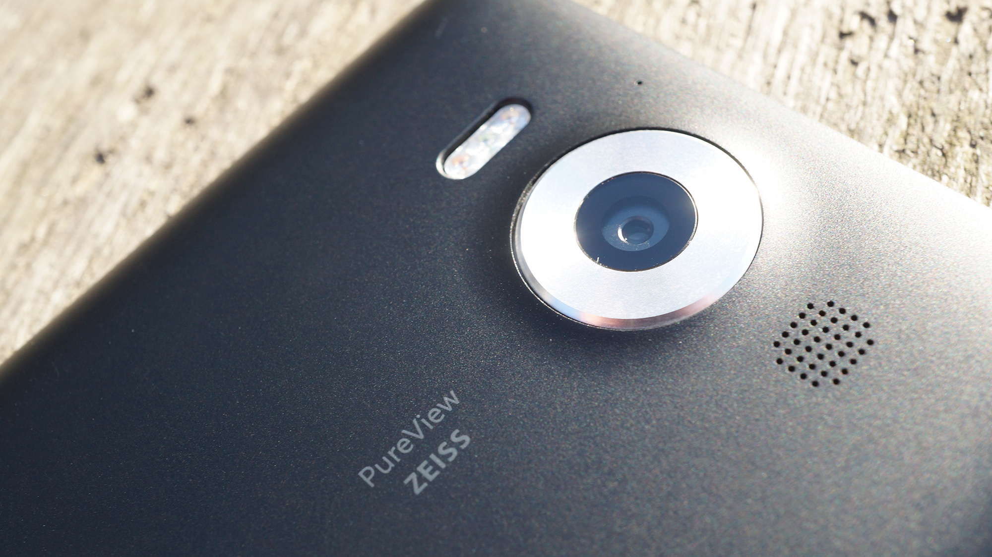 På telefonens baksida hittar vi en 20 megapixelkamera som sticker ut ett par millimeter från telefonens kropp, tre LED-lampor som kan assistera kameran i mörka miljöer, en högtalare och en silverfärgad Windows-logotyp.