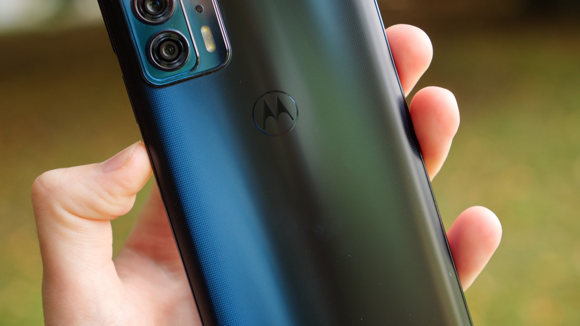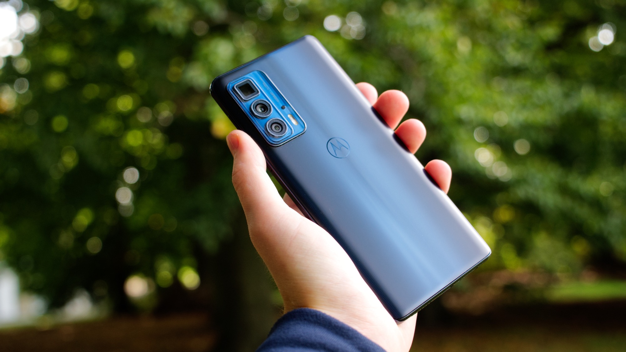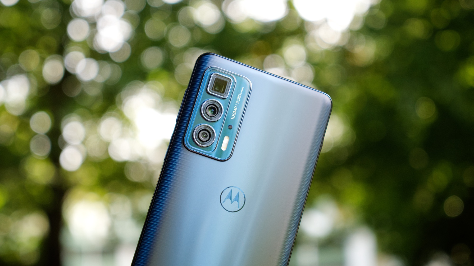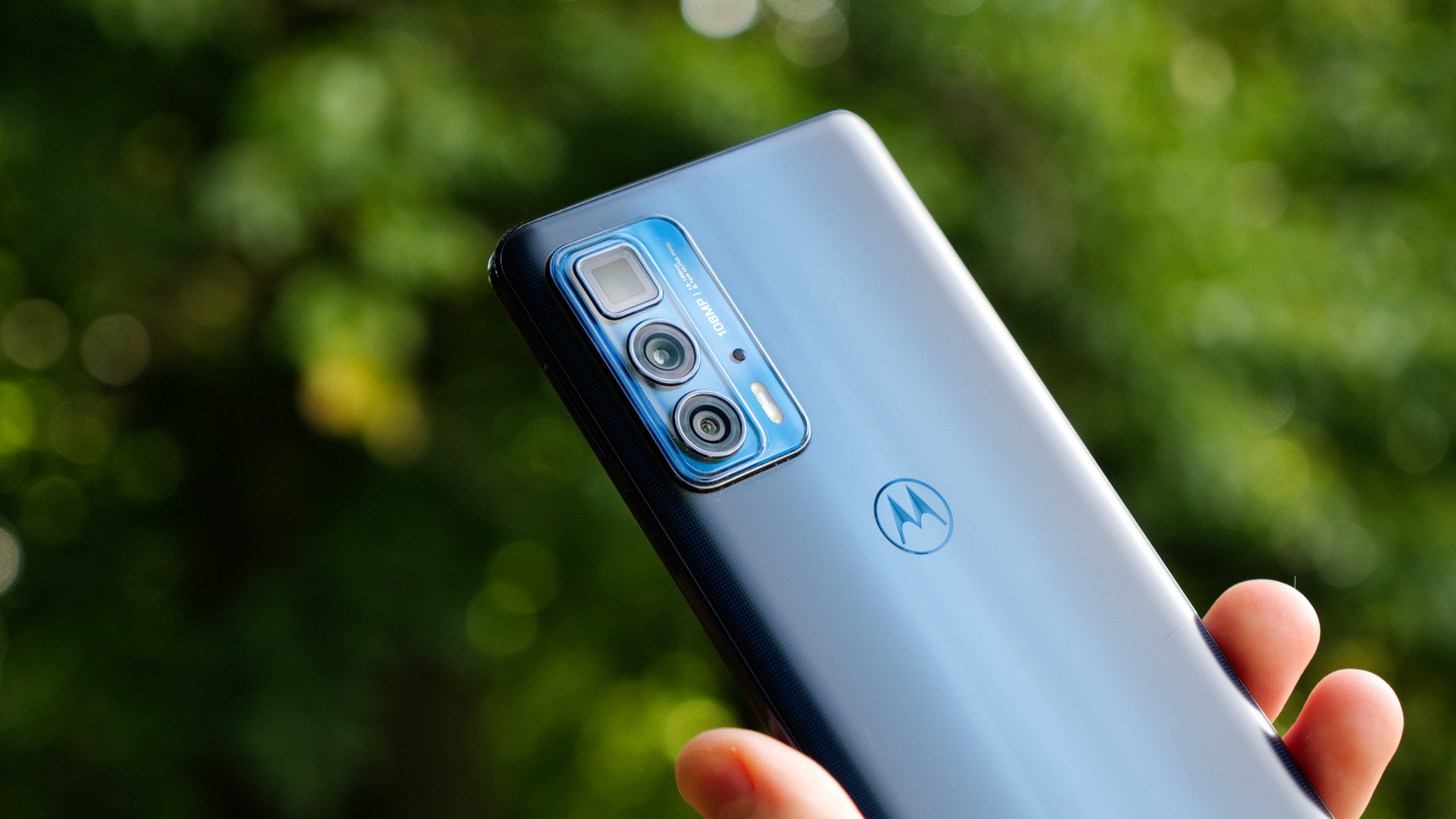 Motorola Edge 20 ser minsann generisk ut. Den har en glasbaksida som är lätt rundad. Vårt mörkblåa exemplar reflekterar ljus med en matt finish och ett lätt prickigt mönster längs sidorna. Bakstycket har ett lyxigt utseende och glaset ger en bra känsla i handen. Vi kan inte säga samma sak om kameran. Den har samma typ av design som på Edge 20 men den kantiga och terrass-liknande designen passar bättre med det billigare syskonets kantiga design. Det tycker åtminstone vi. Smaken är som baken. I kameramodulen finns i alla fall tre kameror, varav en periskopkamera för telefotografering. Här finns också dubbla LED-lampor, en mikrofon och en text som skryter om 108 MP-sensorn i huvudkameran.