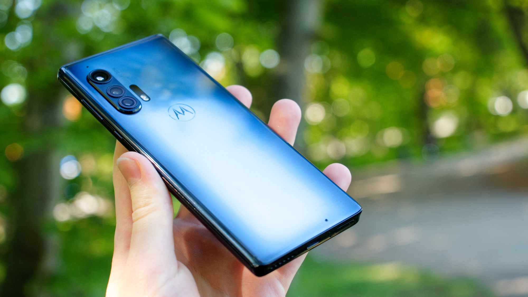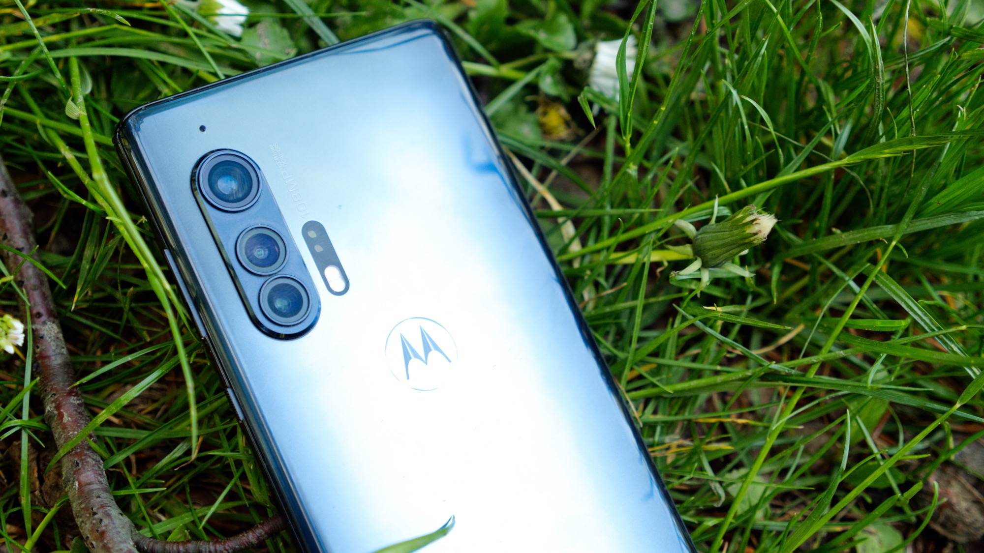 Baksidan av Motorola Edge+ täcks av glas. Glaset är lätt rundat längs sidorna och vårt gråblåa exemplar är mörkare längs sidorna än i mitten. Glaset kan skyddas av ett inkluderat transparent plastskal. Kameramodulen sitter längs vänster sida och är praktiskt placerad för att ge utrymme för ett finger på baksidan när mobilen hålls i landskapsläge. Även om placeringen är praktisk för fotografering så är den opraktisk för videoinspelning eftersom den bakre mikrofonen sitter precis där ett finger lätt vilar, särskilt för vänsterhänta. Kameramodulen sticker i alla fall ut en hel del, nästan två millimeter. Det gör telefonen ordentligt ostabil när den ligger på ett bord. Det är något vi har lärt oss att acceptera från mobiler med så stora kamerasensorer som Motorola Edge+:s 108 megapixelkamera har.