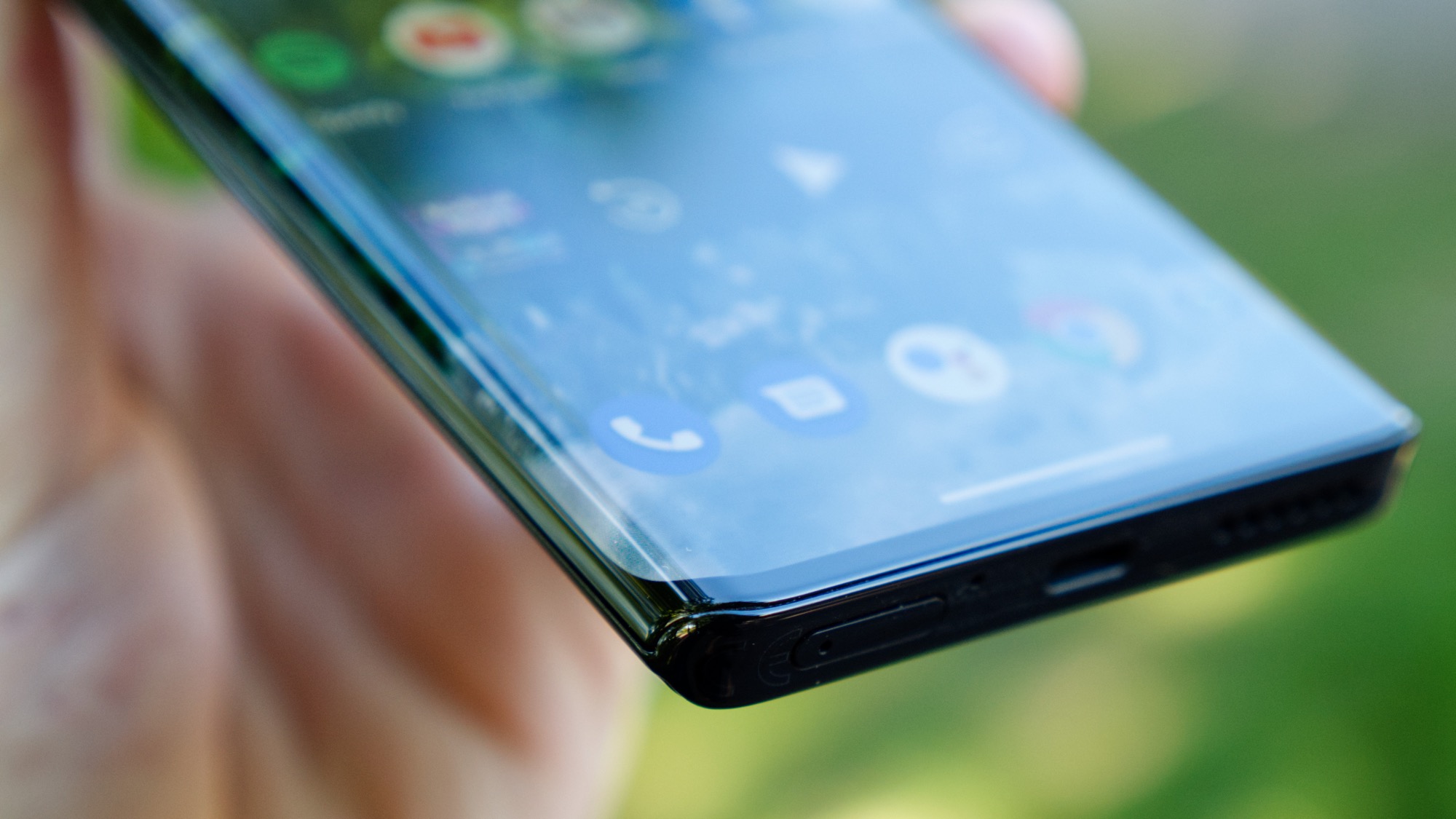 Längs höger sida finns en på/av-knapp och två volymknappar. De sitter relativt nära baksidan av mobilen, tvingade dit av den rundade skärmen. Det gör det lätt att råka trycka på skärmen istället för på knapparna. Under vår testperiod fann vi det enkelt att bli vana vid knapp-placeringarna för att använda dem effektivt. Med det sagt hade vi uppskattat lite tydligare fysisk återkoppling från dem.