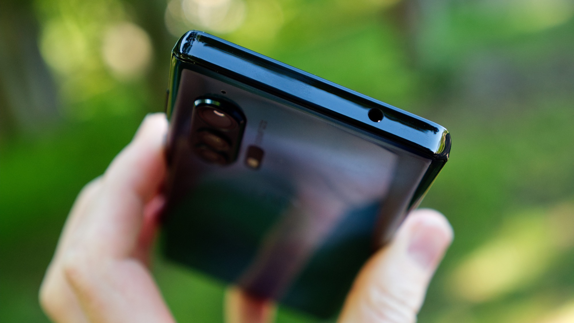 Längs ovansidan är ramen konkav i sin design. Det är ännu ett estetiskt sätt som Motorola Edge+ skiljer sig från konkurrenterna. Här finns dessutom en hörlursport – en extremt sällsynt funktion för ett modernt flaggskepp. Hörlursporten är så ovanlig att den kan vara en av de avgörande egenskaperna som kan få vissa konsumenter att välja Edge+ framför andra.