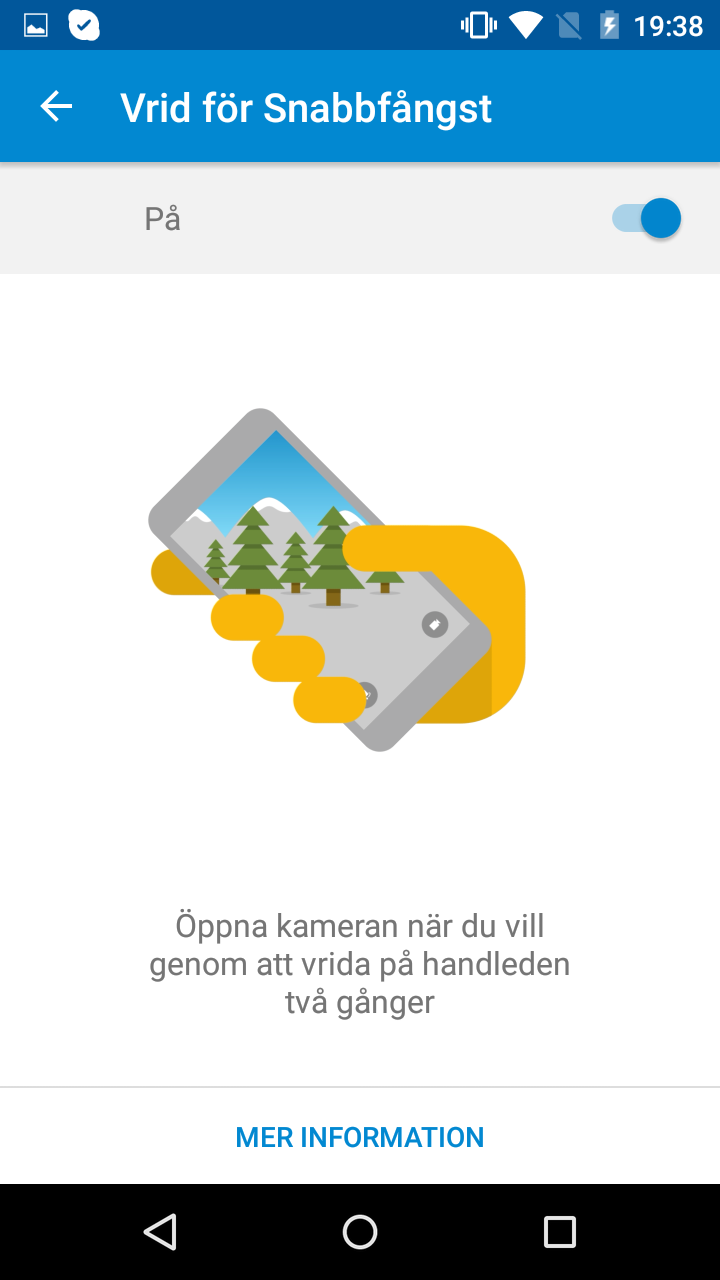 En annan anpassning som Motorola inkluderar i sin mjukvara är också aktiv innan telefonen låsts upp. Bara genom att lyfta upp telefonen från ett bord så aktiveras telefonens skärm som visar tiden och de senaste notiserna. Om en notis har kommit in räcker det med ett svep över den för att låsa upp telefonen och visa appen som notisen kom från. Funktionen är genialiskt bra även om vi också hade önskat att skärmen kunde väckas med två knack på skärmen, precis som man kan göra på bland andra Microsofts, LG:s och HTC:s telefoner.