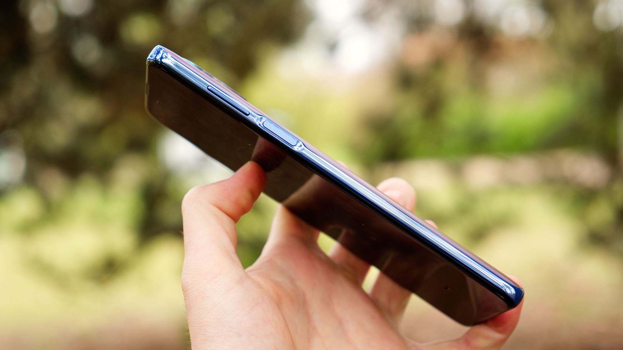 Sidorna är också gjorda av plast men är stadiga. Vi hör inget knak i fogarna, hur mycket vi än vrider och vänder på telefonen. Längs höger sida har Moto G100 en på/av-knapp som också fungerar som fingeravtrycksläsare. Den är riktigt snabb och pålitlig när vi registrerar vårt fingeravtryck väl. Den har svårt att läsa både mycket torra och blöta fingrar men den är enkel att använda och snabbare än många optiska fingeravtrycksläsare som är inbyggda i konkurrenters skärmar. Det enda vi kan klaga på är att läsaren är ganska högt placerad, vilket gör den svår att använda för personer med små händer.