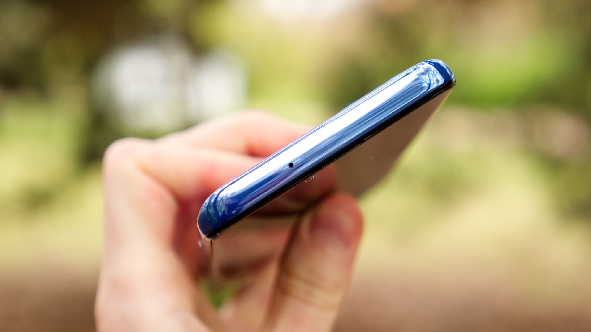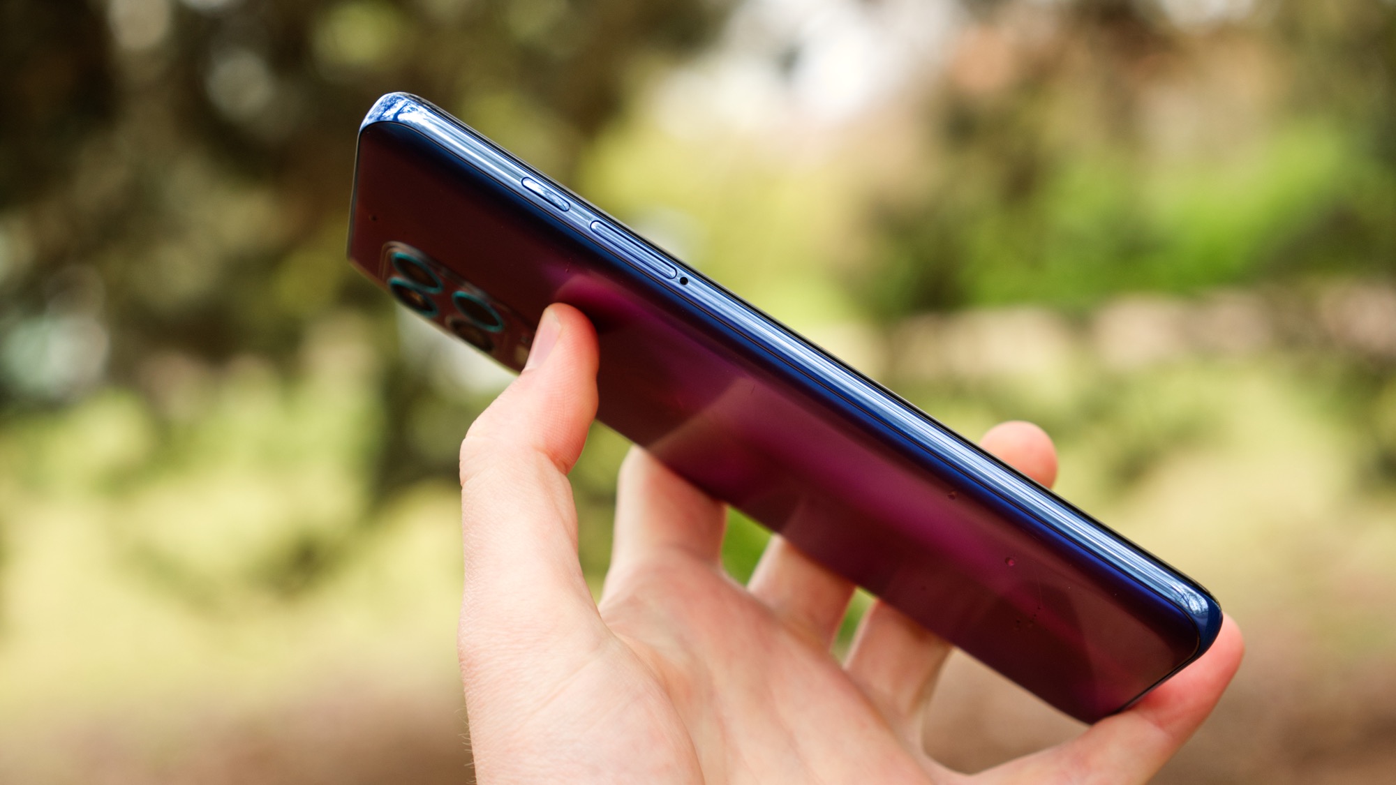 Ovanför fingeravtrycksläsaren finns volymknappar som ger bra fysisk återkoppling. Längs ovansidan finns en sekundär mikrofon och vänster sida bjuder på en kortläsare med plats för dubbla nanoSIM-kort eller ett nanoSIM- och ett microSD-kort. Längs vänster sida finns även en rundad knapp för Google Assistent. Den rundade designen gör knappen svår att trycka av misstag men lätt att trycka med vilja. Vi gillar knappens funktionalitet och tycker att Motorola har hittat en av branschens bästa lösningar för en Assistent-knapp.