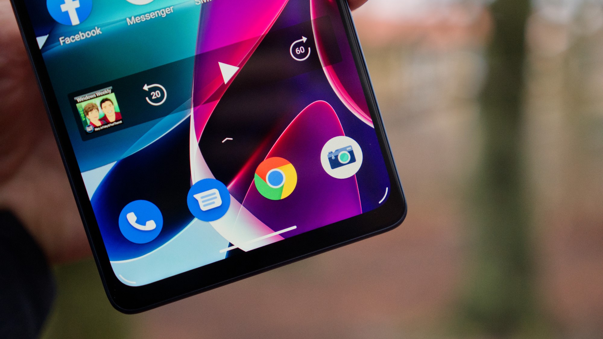 Framsidan av Moto G200 är fullt normalt, tråkigt normal. Den har en avlång skärm med rundade hörn och ett centrerat hål i överkanten för den främre kameran. Ovanför skärmen finns en hörlur och ett flertal sensorer men ingen notislampa. Det finns inte heller någon alltid på-skärm, eftersom skärmen använder LCD-teknik. Det finns alltså inget sätt att se inkomna notiser eller laddningsstatus utan att tända skärmen manuellt.