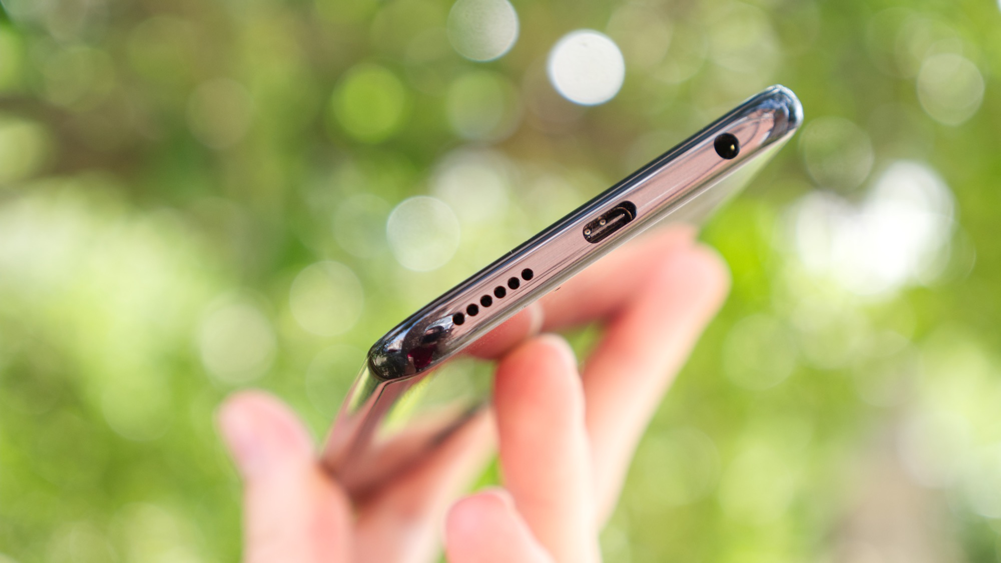 Längs ovansidan finns en kortläsare med plats för dubbla nanoSIM-kort och ett microSD-kort. Det går alltså att ha tre kort i telefonen samtidigt. Här finns också en sekundär mikrofon. Huvudmikrofonen sitter längst ner på telefonen, på framsidan, inte på undersidan, som på många andra mobiler. På undersidan finns istället en högtalare, en USB Typ C-port och en hörlursport.