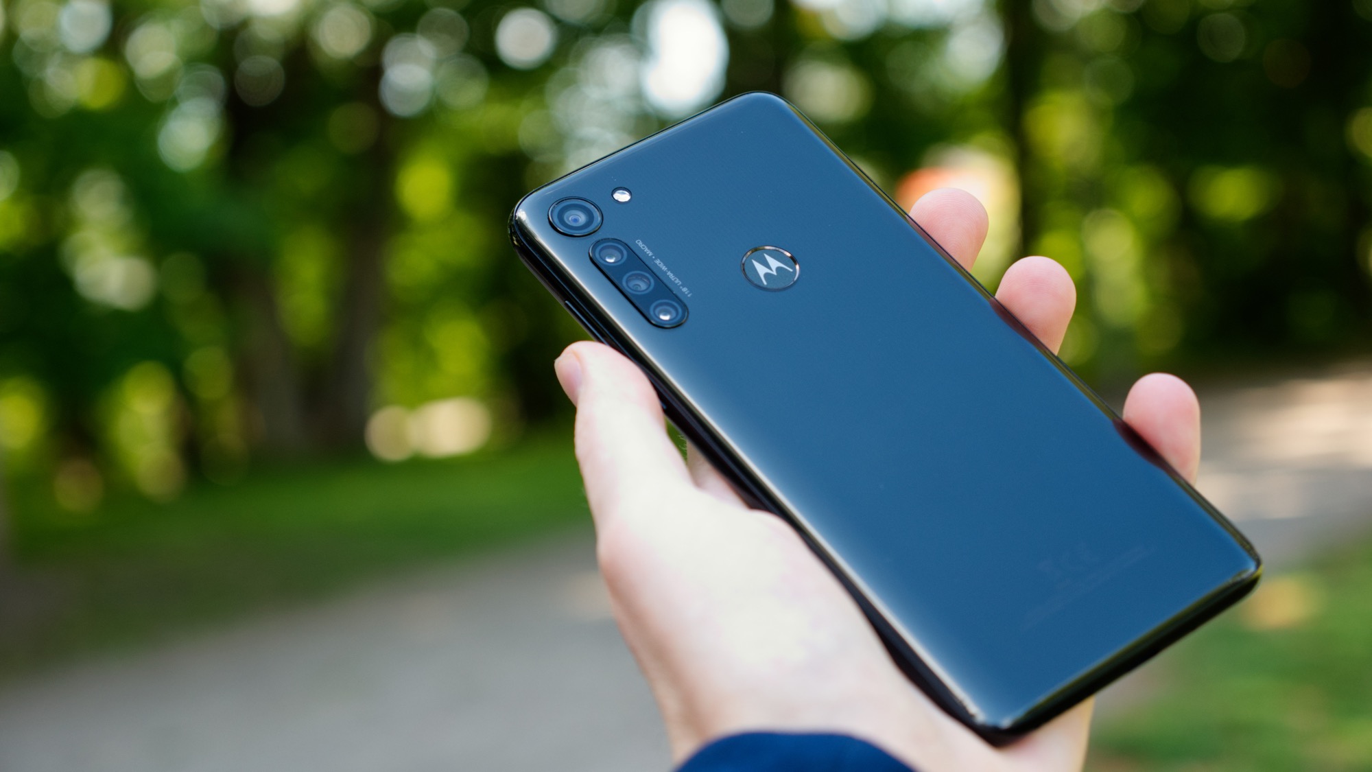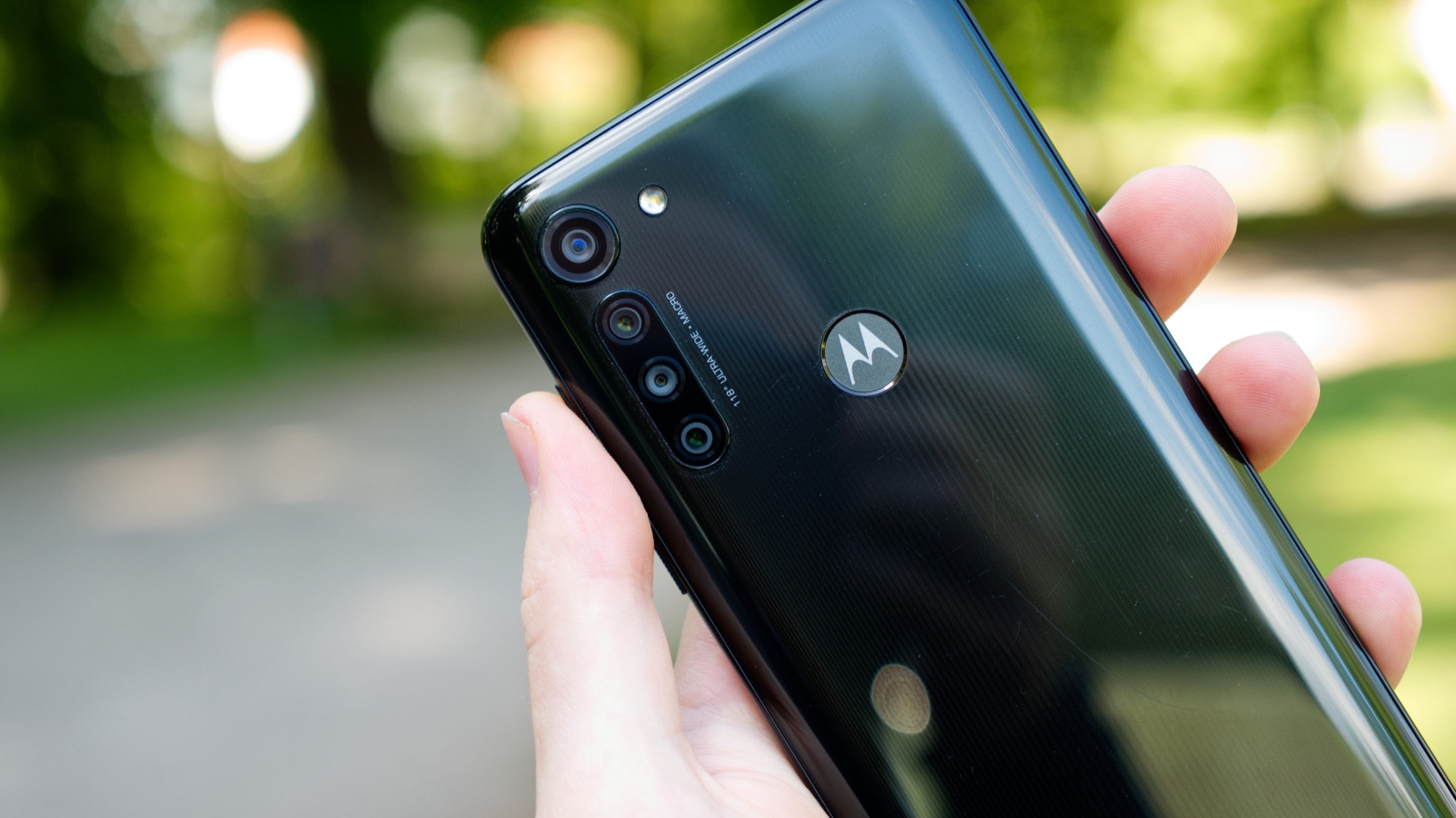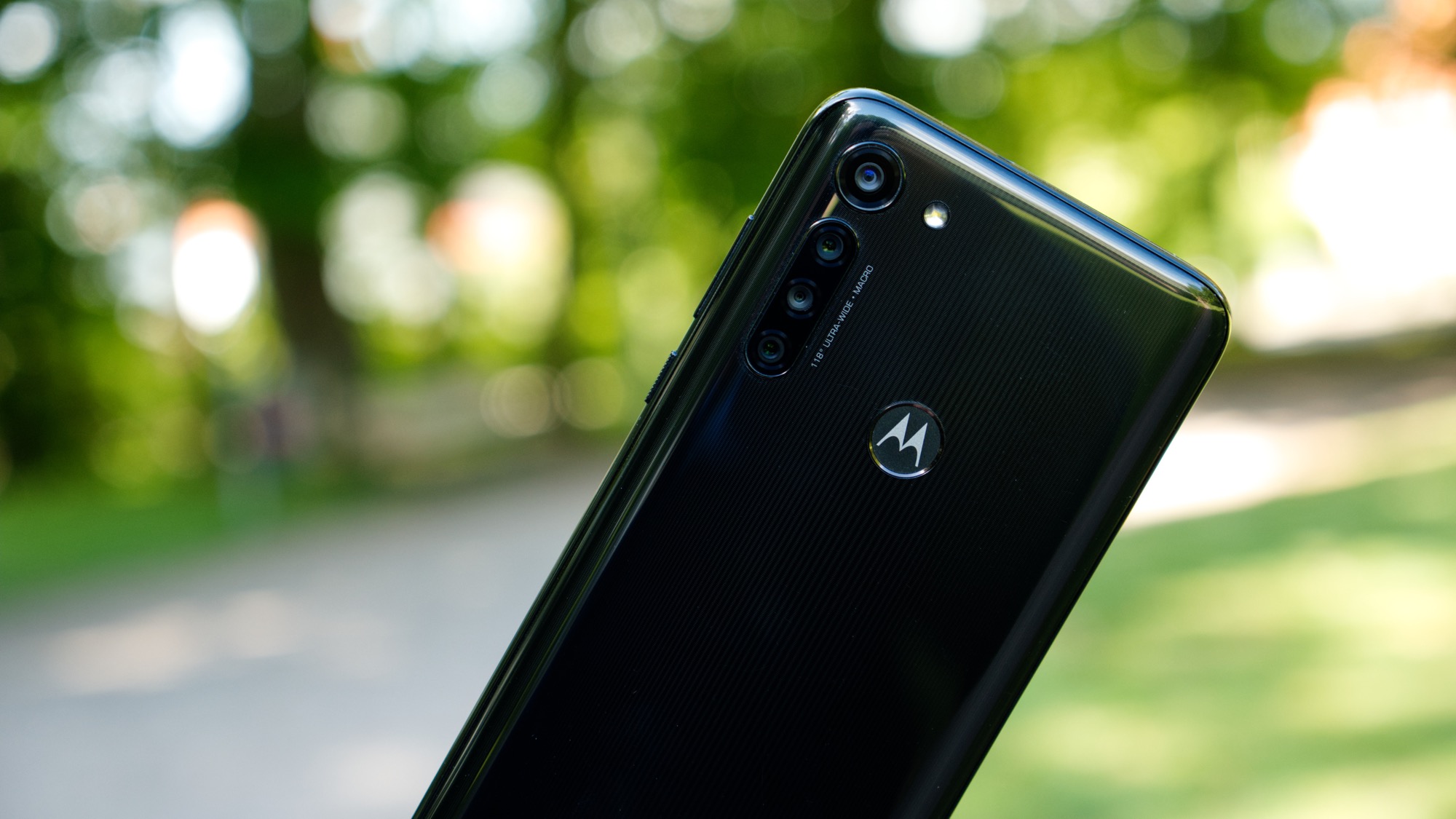 På baksidan har Motorola-loggan kombineras med en kapacitiv fingeravtrycksläsare. Den fungerar pålitligt och snabbt, även om den inte vinner poäng för ett modernt utseende. Den moderna designen bidrar istället kamerorna med. Längs baksidans vänstra kant finns nämligen en uppsättning av fyra kameror, ett ambitiöst antal för prisklassen. Kamerorna sticker knappt ut från telefonen, vilket är en direkt fördel med en telefon som fyller ut sitt inre med ett stort batteri.