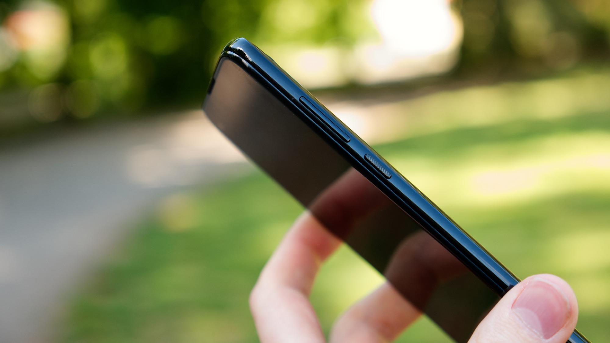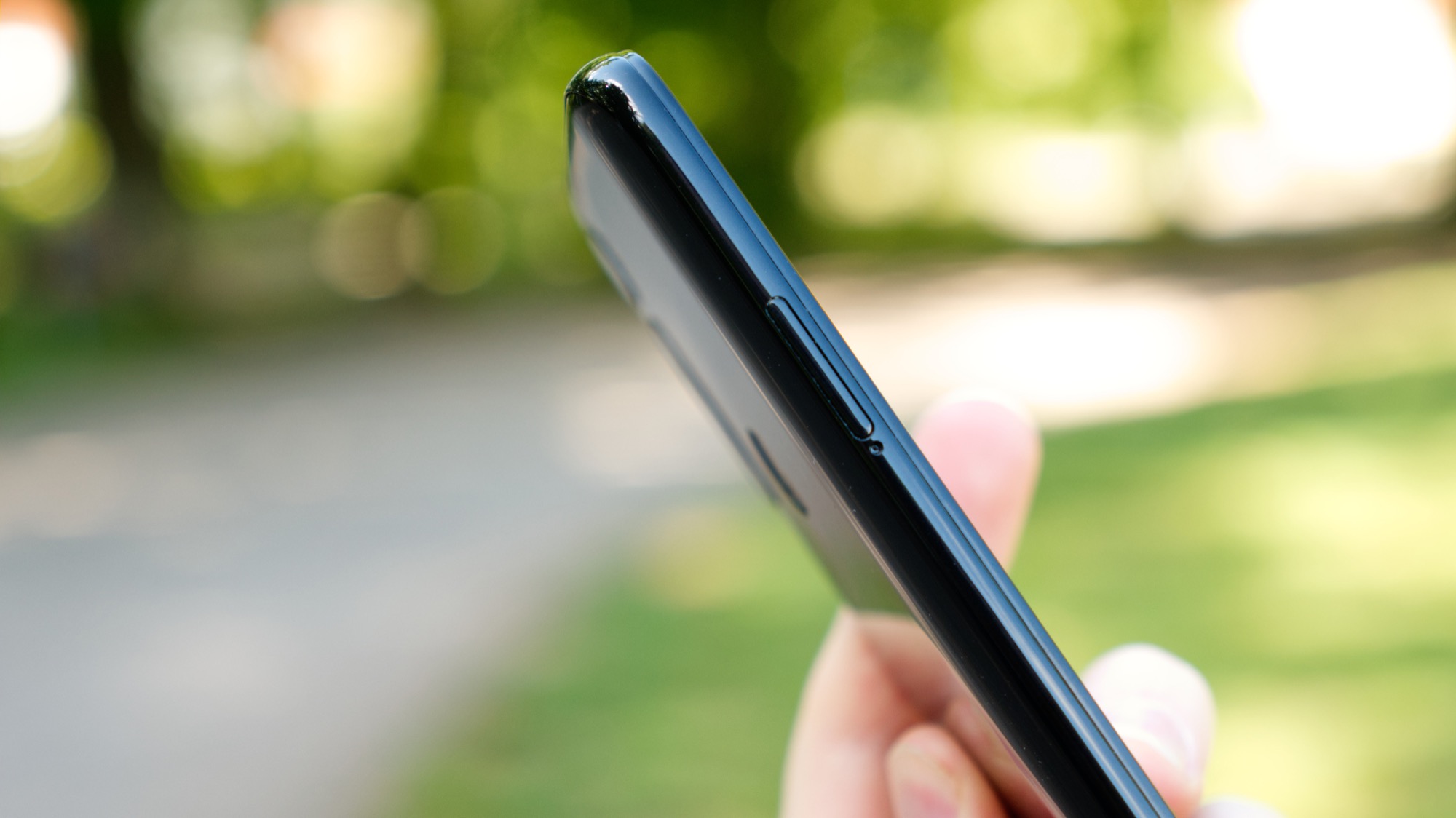 Plastbaksidan har en svart bakgrund med ett silvrigt randigt mönster. Baksidan möter de helt svarta och blanka plastsidorna. Även här ser vi stor risk för repor genom år av användning. Längs vänster sida finns i alla fall en på/av-knapp och två volymknappar som är praktiskt placerade och ger helt okej fysisk återkoppling. Längs ovansidan finns en sekundär mikrofon och en hörlursport. Vänster sida bjuder på en kortläsare med plats för dubbla nanoSIM-kort eller ett nanoSIM och ett microSD-kort. Längs undersidan finns slutligen en högtalare, mikrofon och USB Typ C-port.