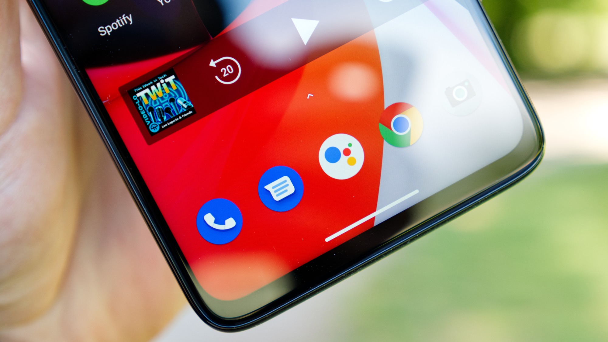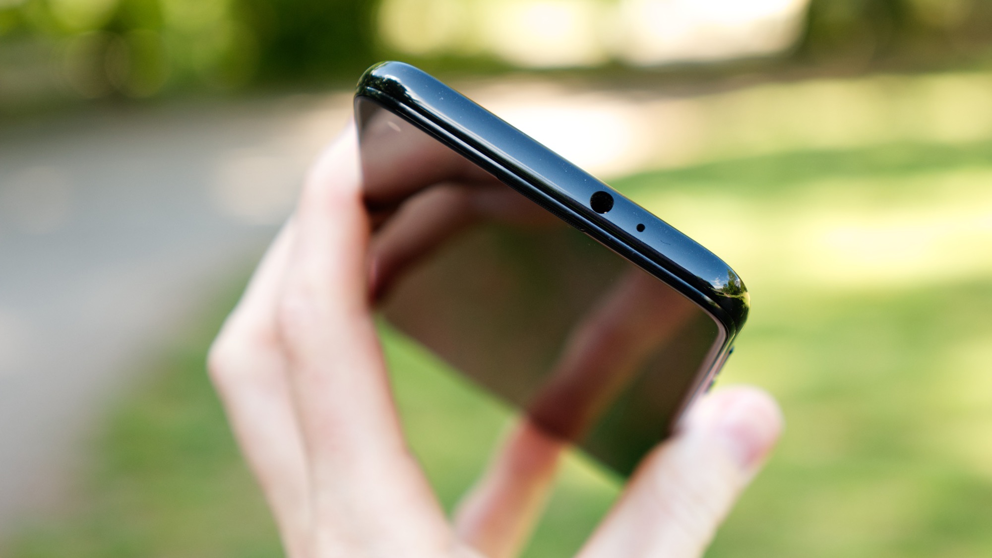 I skärmen finns ett hål för den främre kameran. Hålet sitter i det övre vänstra hörnet. Det ger telefonen möjligen ett lite mer modernt utseende. Det skapar dock också tydliga problem med bakgrundsbelysningen för skärmen, som är ganska ojämn runt hålet. Ovanför skärmen finns i alla fall också en hörlur och ett par sensorer.