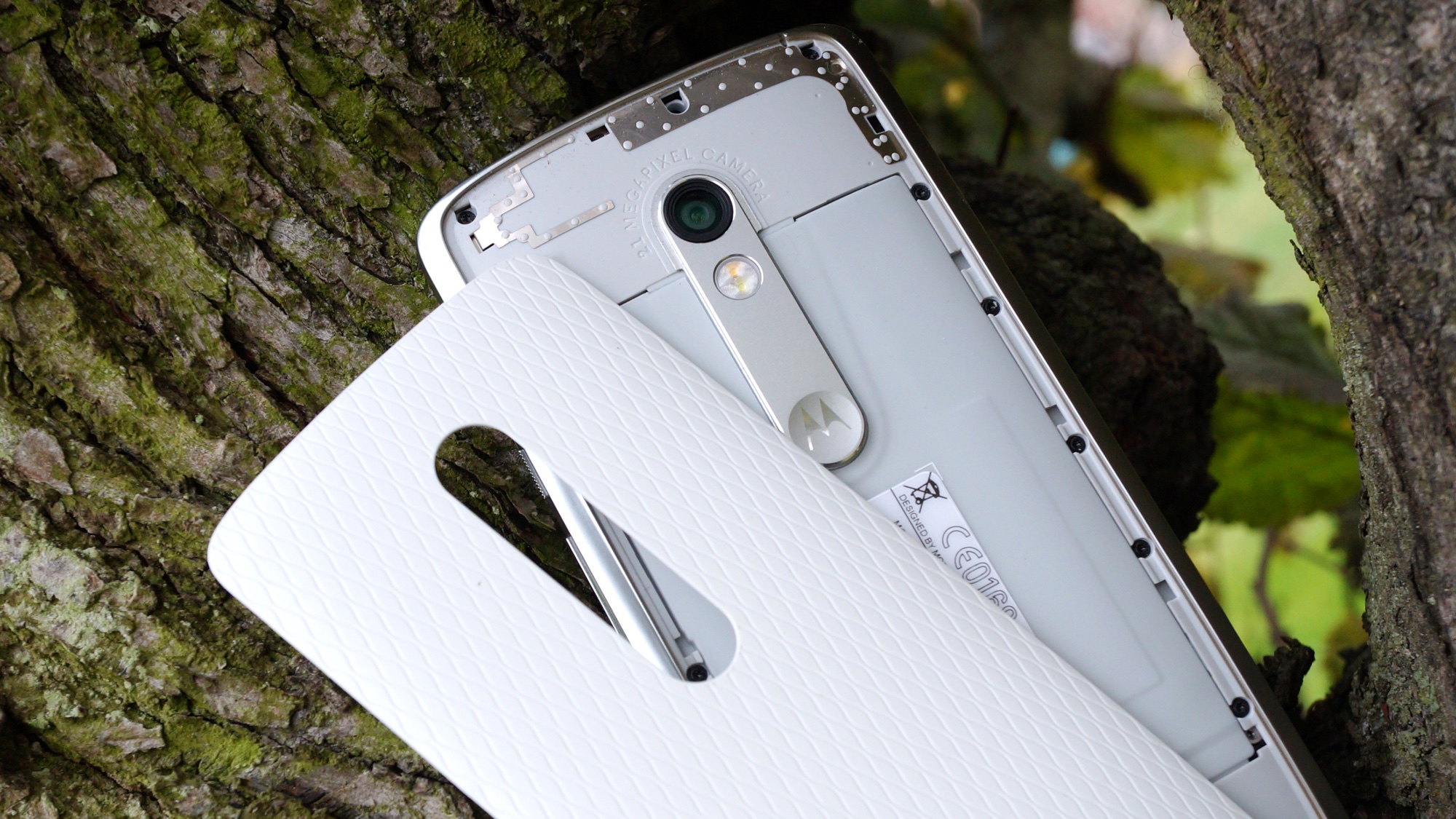 Stora delar av telefonens baksida täcks av ett avtagbart bakstycke av plast. Vårat testexemplar har en vit plastbaksida som har ett vågigt mönster. Vi gillar mönstrets utseende och kan påpeka att bakstyckets matta finish i kombination med mönstret ger användare ett bra grepp runt telefonen. Bakstycket är lätt att plocka loss men tråkigt nog finns det ingen större nytta med det. Motorola har valt att bygga in telefonens batteri bakom en stor mängd skruvar och microSD-kortläsaren gömmer sig vid SIM-kortläsaren istället för under bakstycket. De enda fördelarna med det avtagbara bakstycket är helt enkelt att det lätt kan bytas ut om det skulle gå sönder och att användare kan köpa nya bakstycken för att anpassa telefonens utseende.