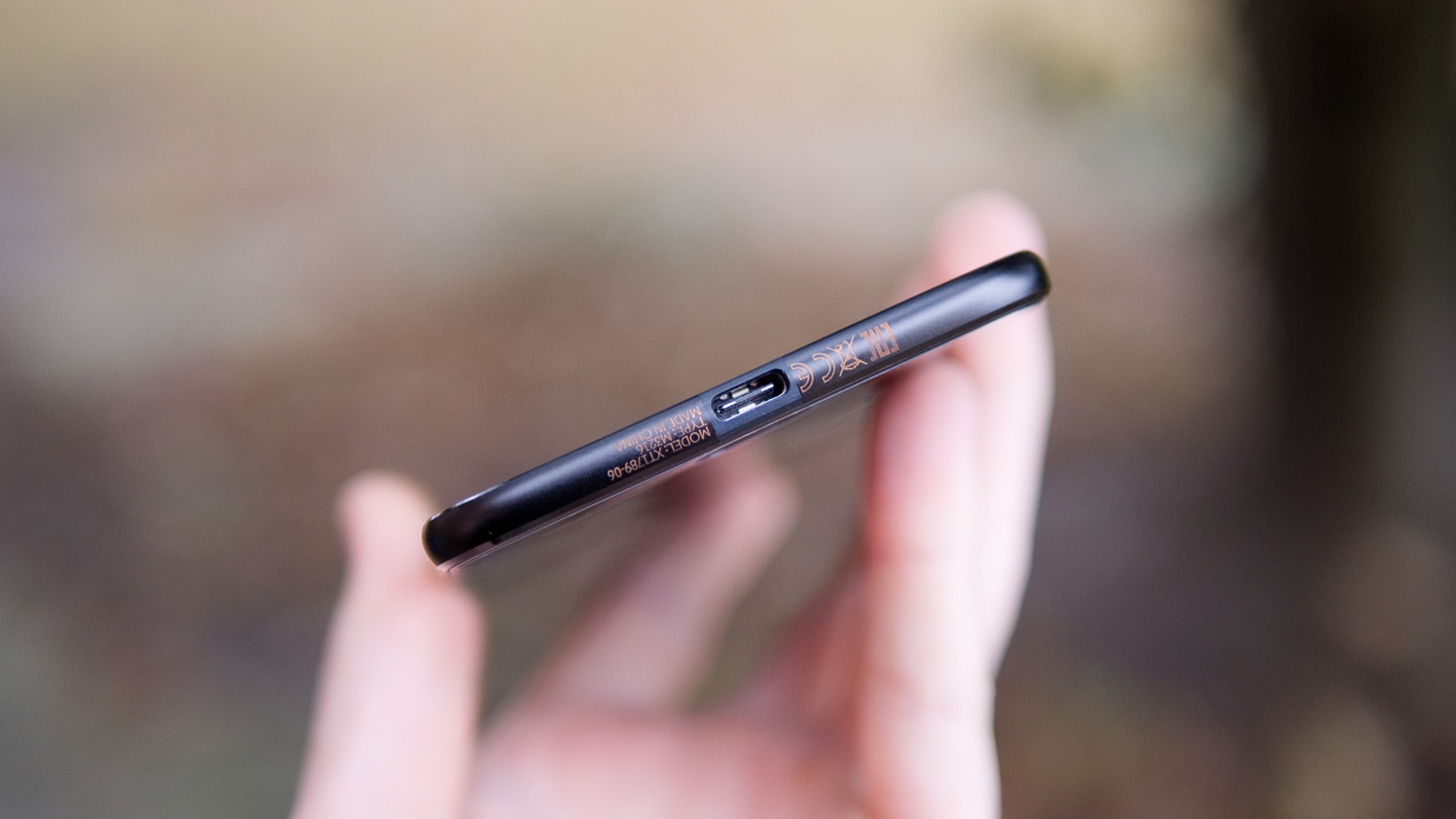 På undersidan finns en USB Typ-C-port som har stöd för USB On-The-Go. Här finns också en hel del ful text med information om telefonens modellnummer och myndighetscertifiering. Här finns alltså ingen hörlursport. Motorola har helt enkelt valt att inte inkludera någon sådan alls. Istället får konsumenter nöja sig med en inkluderad USB Typ-C till 3,5 mm hörlursadapter.
