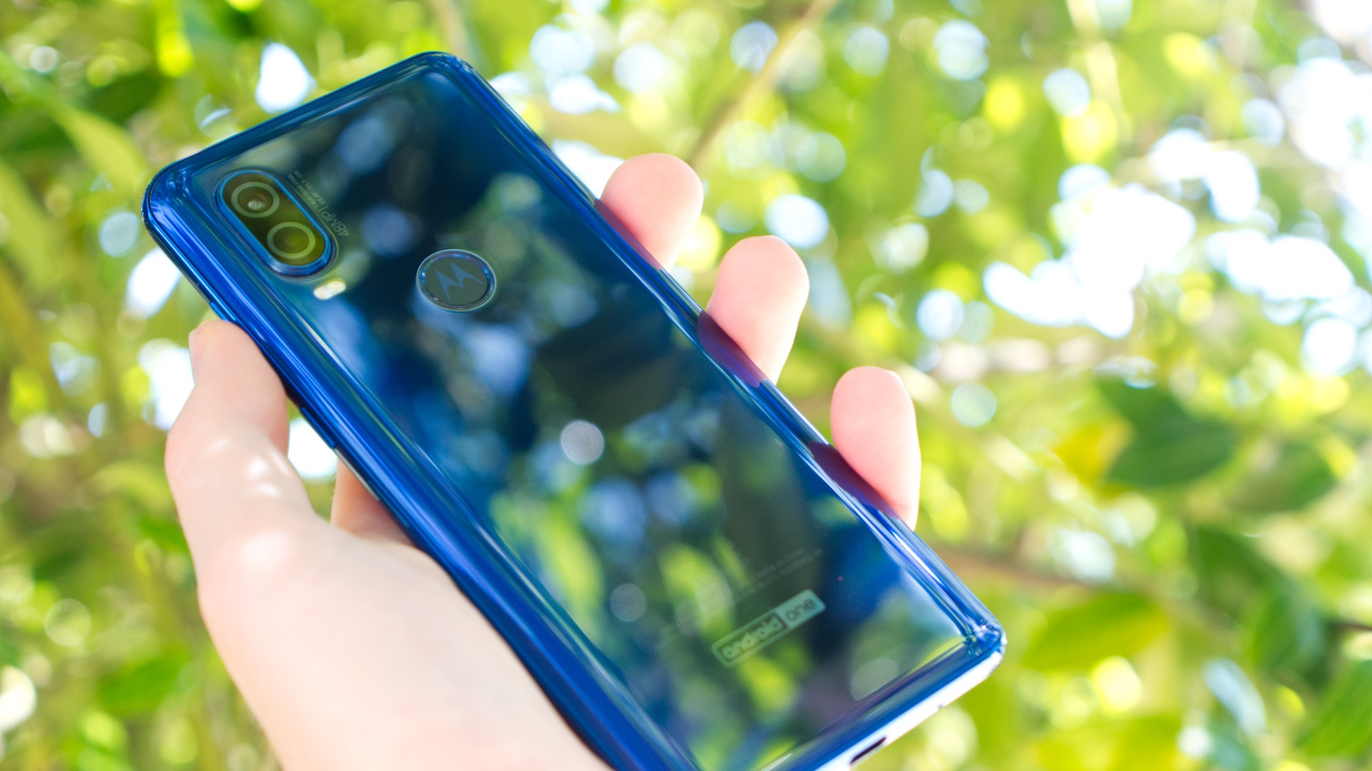 I linje med Moto G7-serien har Motorola One Vision också en fingeravtrycksläsare inbyggd i Motorola-loggan på sin baksida. Den är praktiskt placerad, pålitlig och ganska snabb. I det övre vänstra hörnet finns en kameramodul som sticker ut ungefär en millimeter från baksidan. Under den finns också dubbla flerfärgade LED-lampor. Här skryter Motorola dessutom om kamerasystemets höga 48 megapixelsensor och optiska bildstabilisering. Längre ner på baksidan finns också en Android One-logga som berättar lite om mjukvaran i mobilen.
