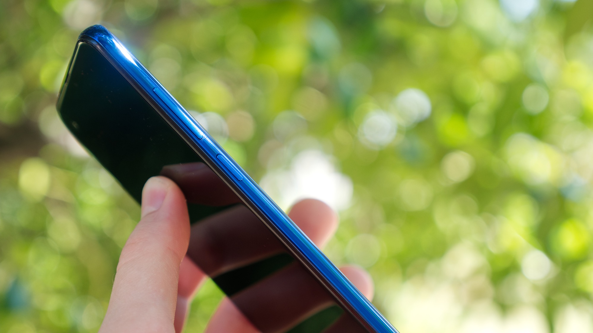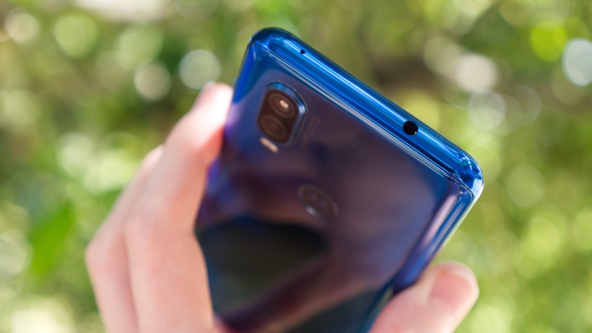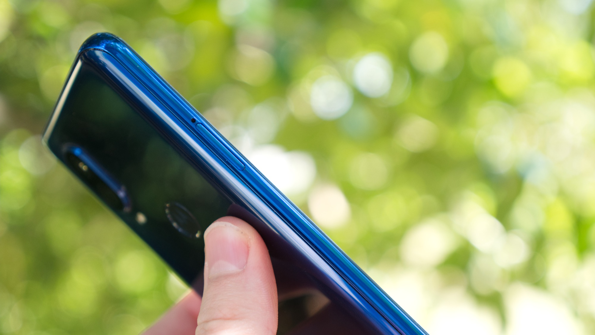 Sidorna är också gjorda av plast. På höger sida finns en på/av-knapp och två volymknappar som tyvärr inte sticker ut särskilt mycket och ger lite sämre fysisk återkoppling än vi blivit vana vid de senaste åren. På ovansidan finns en hölursport och en sekundär mikrofon. Hörlursporten är uppskattad, även om vi föredrar att ha den på samma sida som USB-porten, som den sitter på Moto G7 Plus. Längs vänster sida finns en korthållare med plats för två nanoSIM-kort eller ett nanoSIM- och ett microSD-kort. Undersidan bjuder slutligen på en USB Typ C-port, en högtalare och en mikrofon.