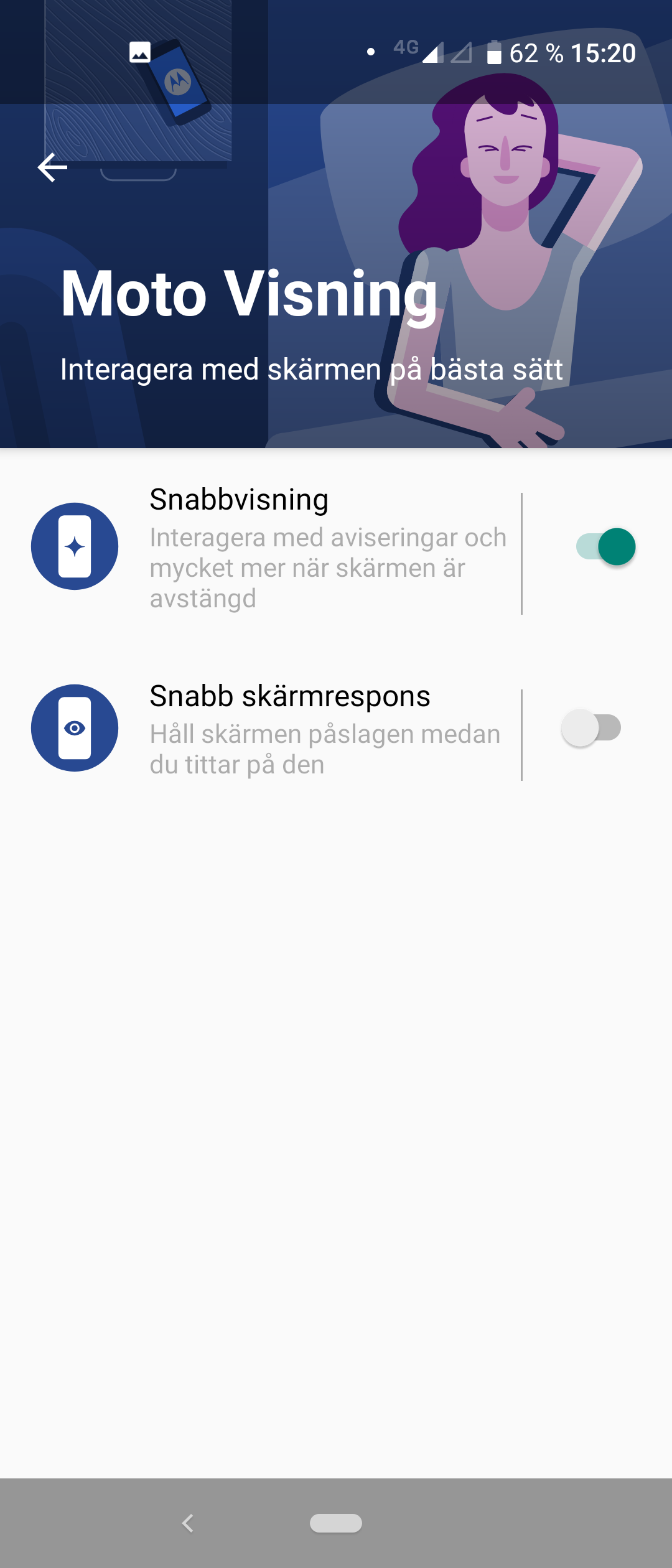En annan anpassning som saknas i One Vision är inställningar för skärmen. Det finns en inställning som heter Färger som låter användare ställa skärmen i ett av tre lägen. Läget som kallas Förstärkt är det absolut bästa då det är ett färgrikt DCI P3-läge. Det mättade läget är extremt mättat medan läget Naturliga har Rec.709-färg, utan bättre färgexakthet. Inget av de alternativa lägena gör något för att förbättra skärmens prestanda. Det är tråkigt eftersom Motorola One Vision har en dåligt kalibrerad skärm som är i starkt behov av ett vitbalans-reglage. Det är en särskilt stor besvikelse eftersom föregångaren Motorola One hade ett reglage för vitbalans. Det har alltså tagits bort till One Vision och vi har svårt att förstå varför.