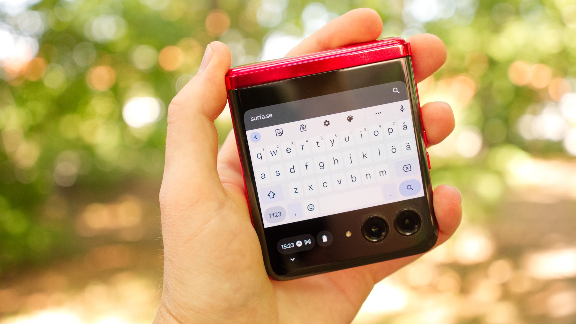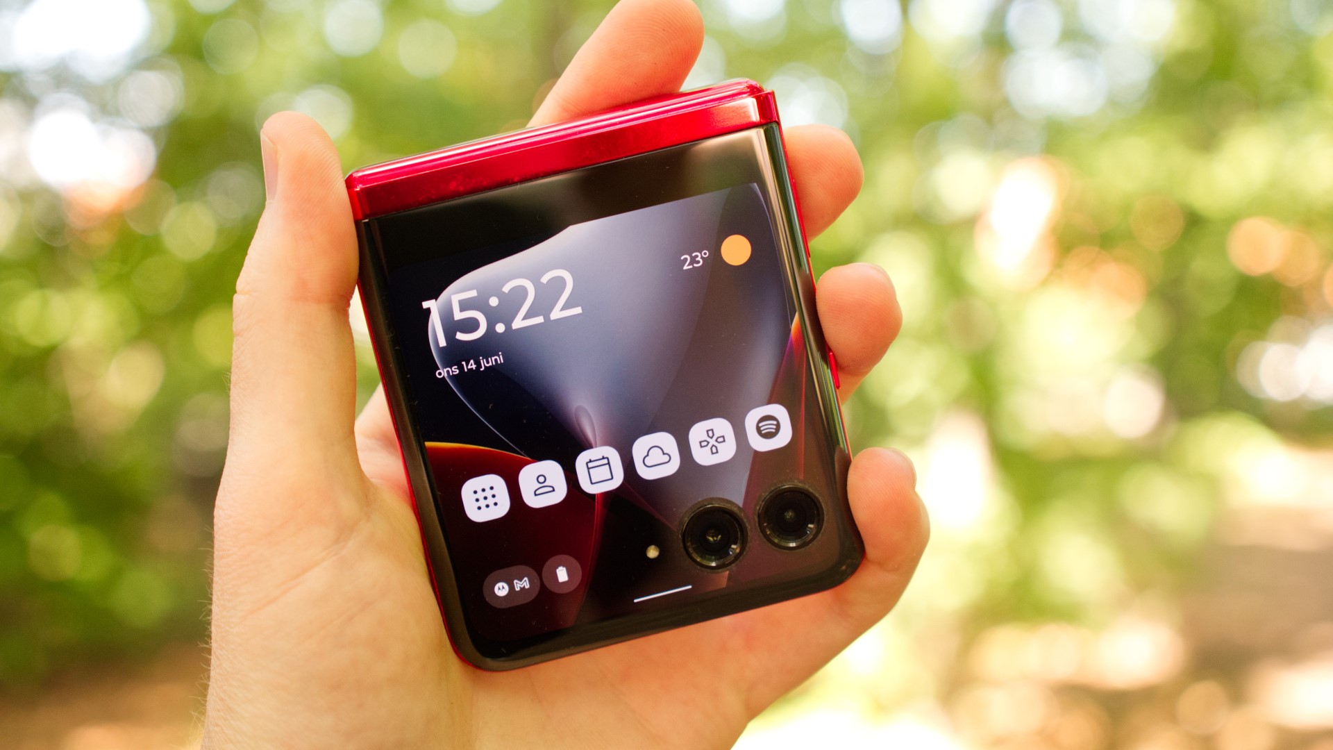 Motorola Razr 40 Ultra har två riktigt bra bildskärmar. Det är en 3,6 tum skärm på utsidan, som alltså är ungefär lika stor som skärmen i Apples första iPhone, och en 6,9 tum skärm på insidan. Båda har liknande pixeltäthet, som ligger runt 413 pixlar per tum. Det är inte riktigt i den toppklass på över 450 eller 500 som vi ser i världens bästa bildskärmar, men det är tillräckligt för att ge bra detaljrikedom. Skärmarna erbjuder också bra rörelseskärpa tack vare 165 Hz uppdateringsfrekvens på insidan och 120 Hz på utsidan, även om skärmen på insidan sällan går upp till 165 Hz. De har också bra färgåtergivning, vitbalans och imponerar med hög ljusstyrka som överstiger 1 200 nits på den inre skärmen och 900 nits på den yttre. Det gör dem användbara utomhus även på soliga dagar.