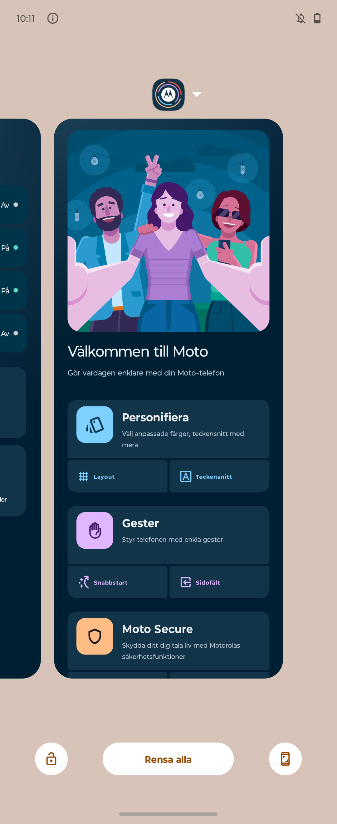Motorolas unika funktioner är främst samlade på en plats, i en app kallad Moto. Här kan vi aktivera funktioner för att tända ficklampan med två hugg av telefonen i luften, aktivera Stör ej genom att lägga den med skärmen öppen och ner mot ett bord och kameran kan aktiveras genom att telefonen roteras två gånger i handen. Funktionerna är lätta att förstå, lätta att använda och stör ingen som inte är intresserad. Perfekt!