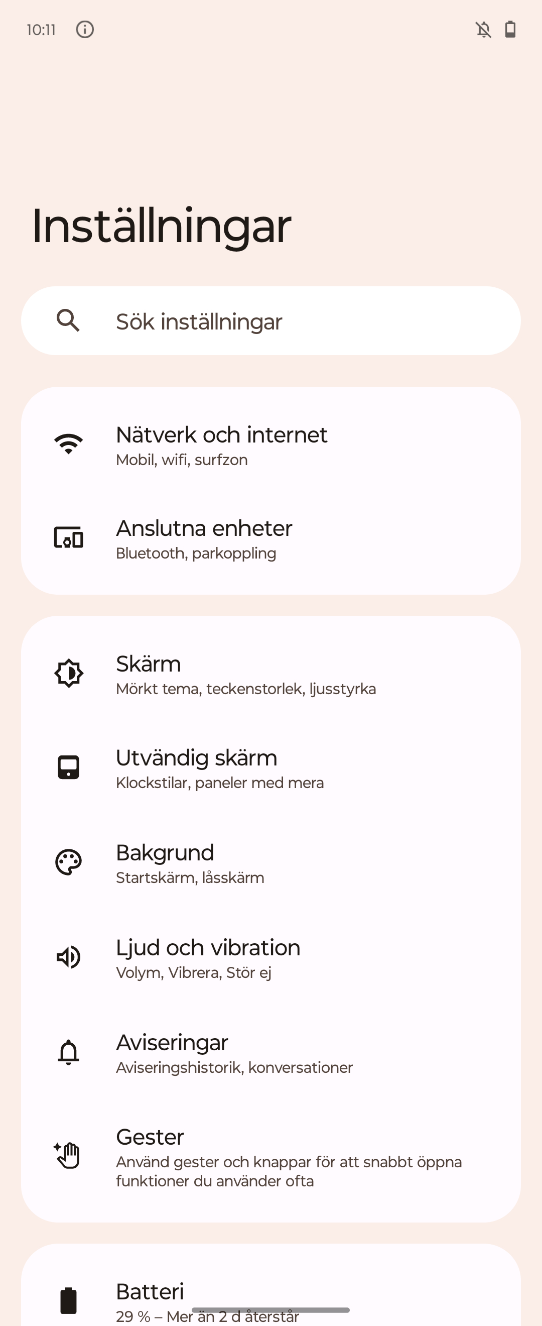 Utsidan av Razr 40 är gjord av plast. Hemskt?! Nej! Motorola kallar materialet för veganskt läder, vilket är en underlig paradox. Det är dock en bra beskrivning av ett material som har en härligt mjuk känsla i handen och som vi faktiskt kan uppskatta i jämförelse med både glas och metall. Den gräddvita färgen på vårt exemplar ser dessutom sofistikerad ut. Även om skärmen på locket är liten, tycker vi inte alls att Razr 40 ser eller känns billig.
