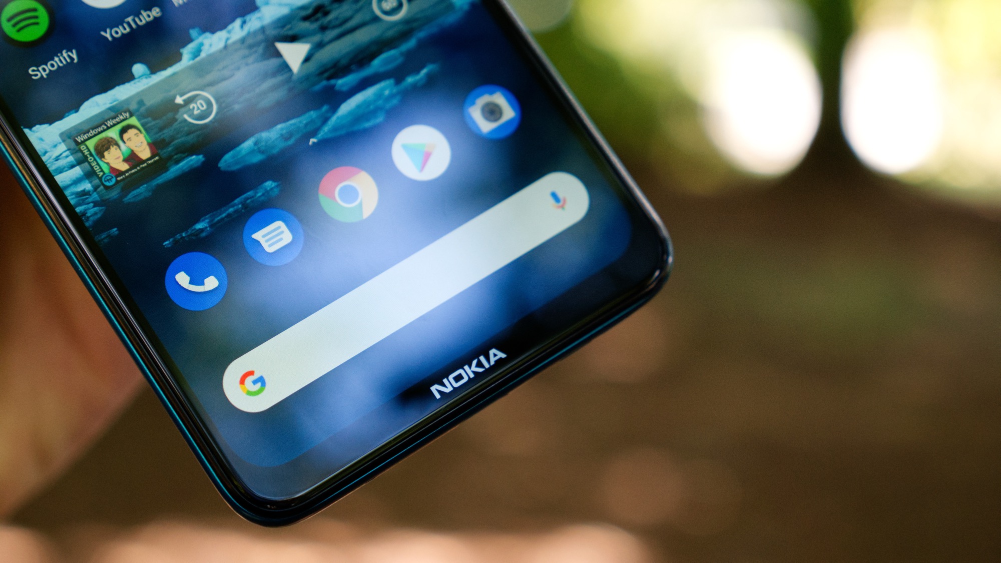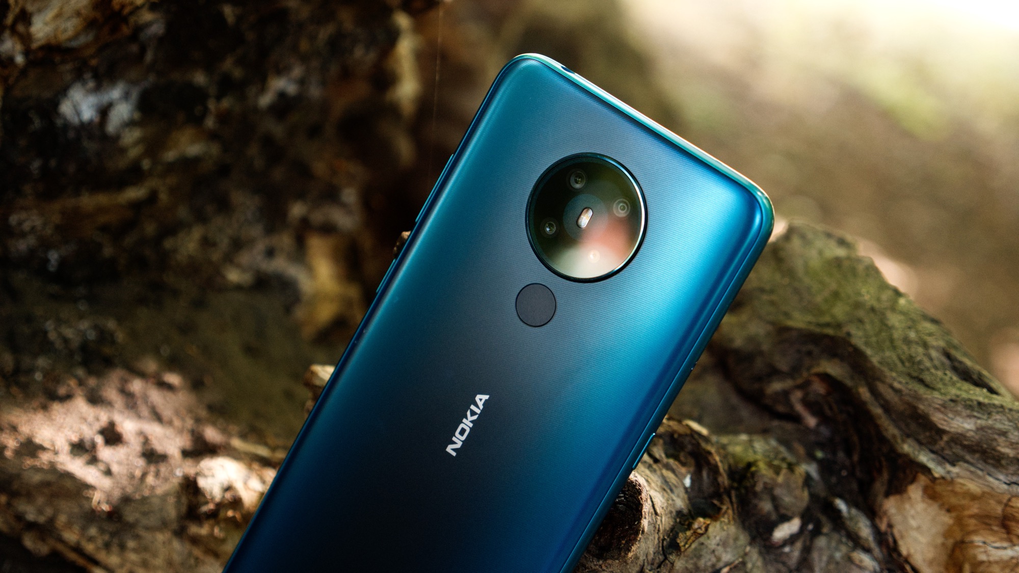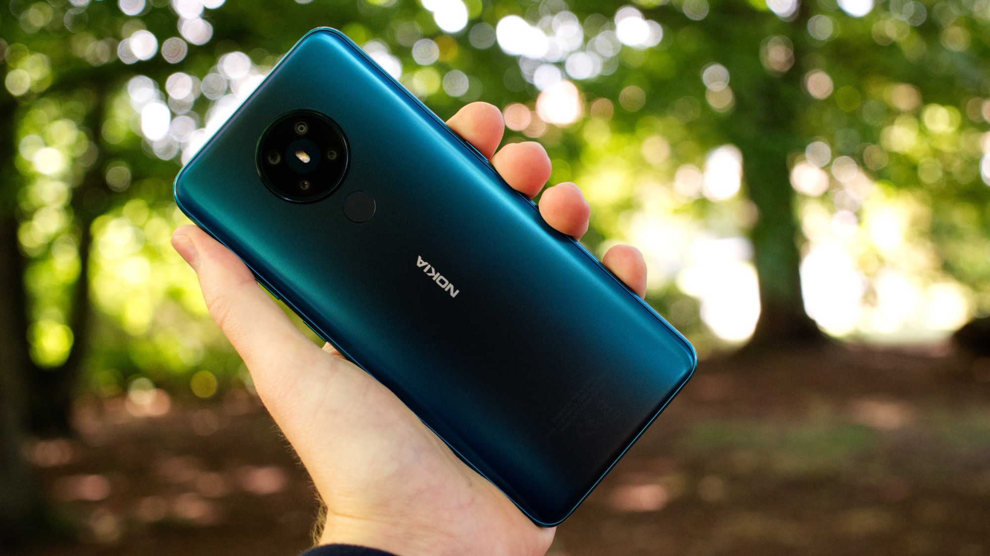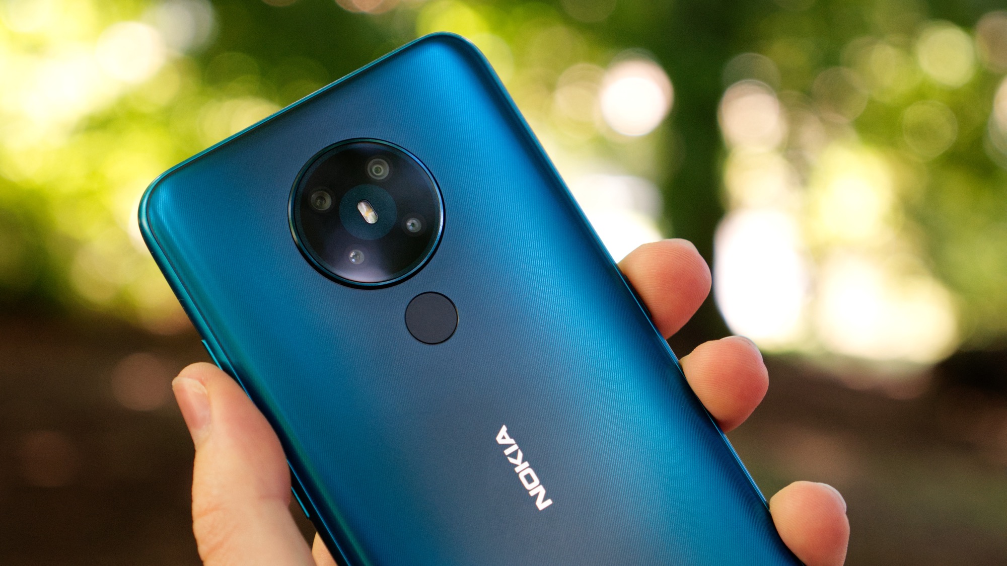 Baksidan på vårt mörkgröna exemplar har en matt finish och ljusa kanter med ett detaljerat randigt mönster. Ett mörkt band sträcker sig längs mitten av mobilen. På mitten sitter också Nokias logga och strax under kameran hittar vi en kapacitiv fingeravtrycksläsare. Läsaren är pålitlig men inte särskilt snabb. Det misstänker vi beror på den ganska långsamma processorn, snarare än läsaren i sig.