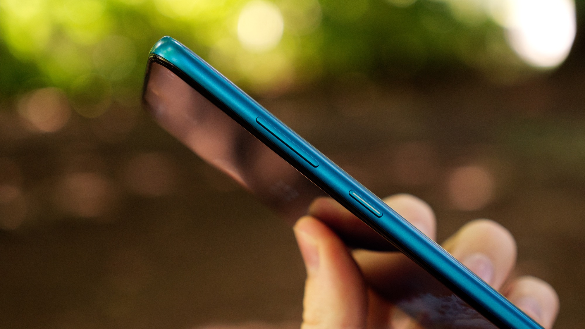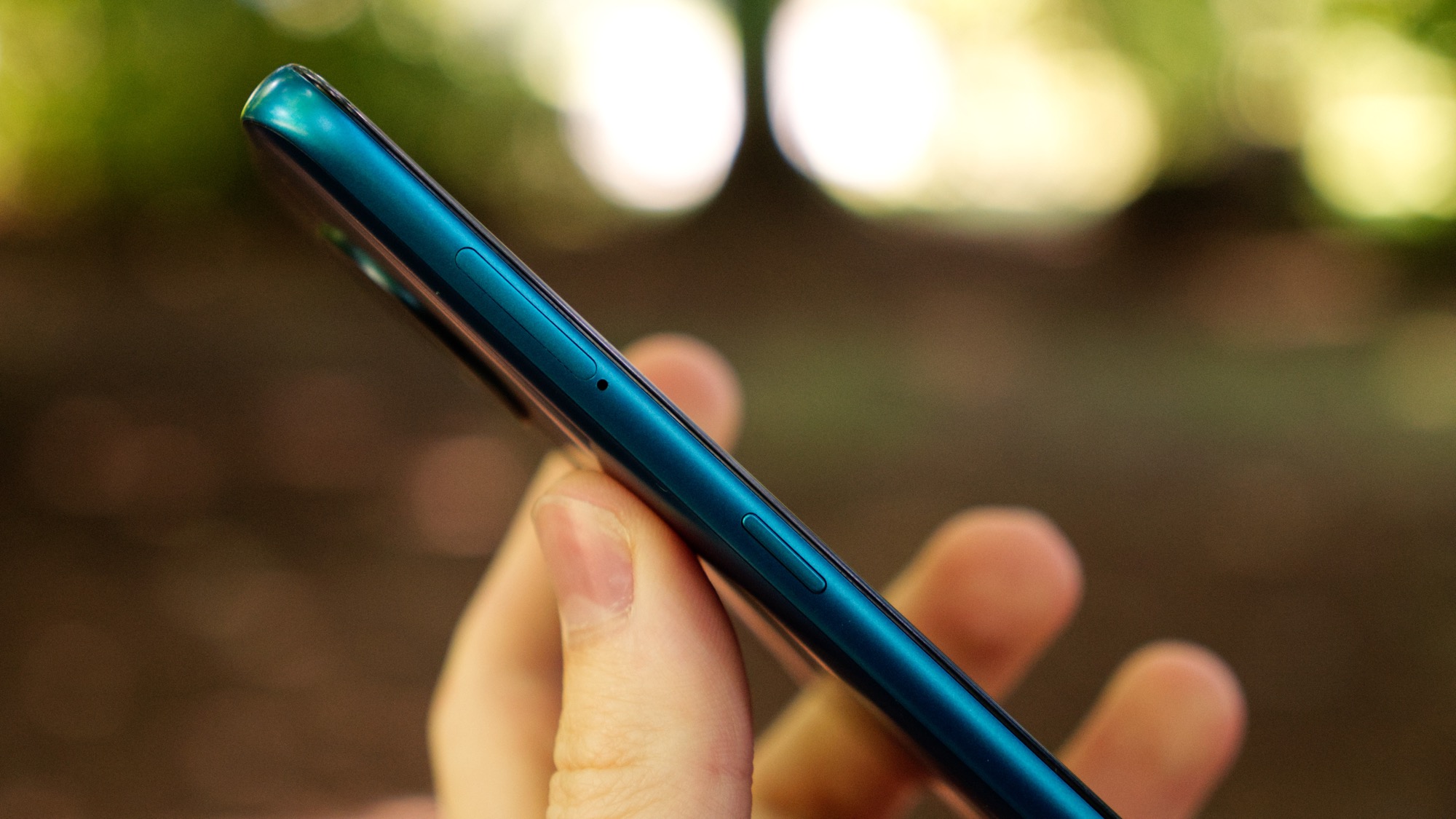 Lång- och kortsidorna av Nokia 5.3 är också gjorda av plast. Längs höger sida finns en på/av-knapp och två volymknappar. I på/av-knappen finns också en inbyggd notislampa, en allt mer sällsynt funktion i moderna mobiler. Att ha notis-lampan på sidan är bättre än ingen alls men det gör den samtidigt lite svår att se.