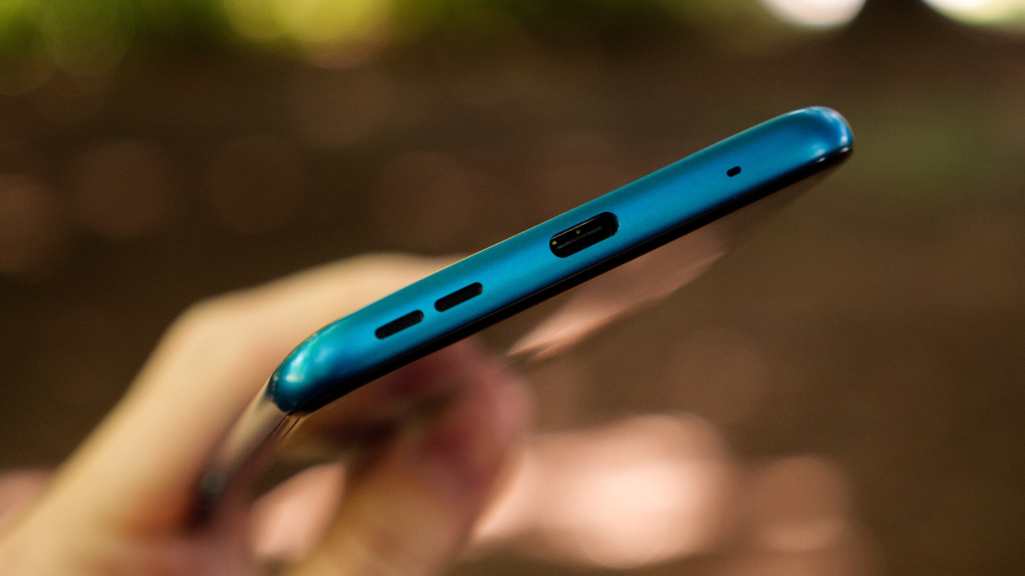 På undersidan finns en USB Typ C-port, en mikrofon och en högtalare. Det är alltså värt att notera att USB-porten och hörlursporten sitter på olika sidor. Om de används samtidigt hänger de alltså kablar ut från båda ändarna av mobilen.
